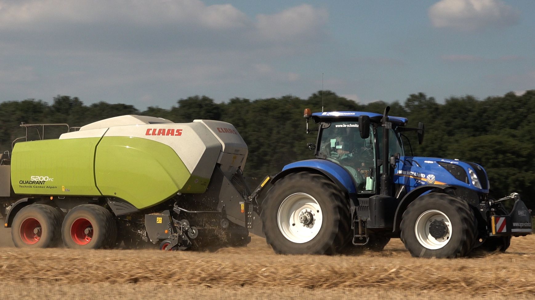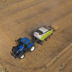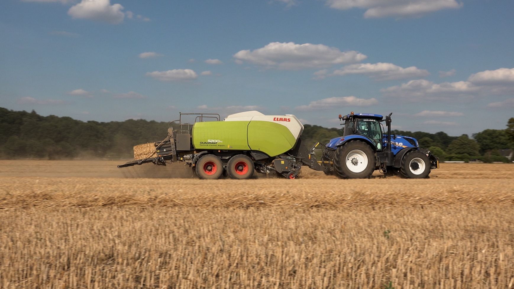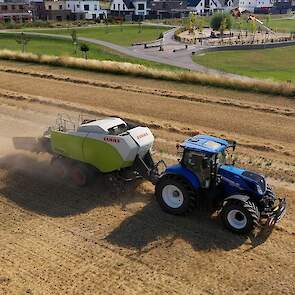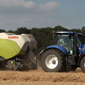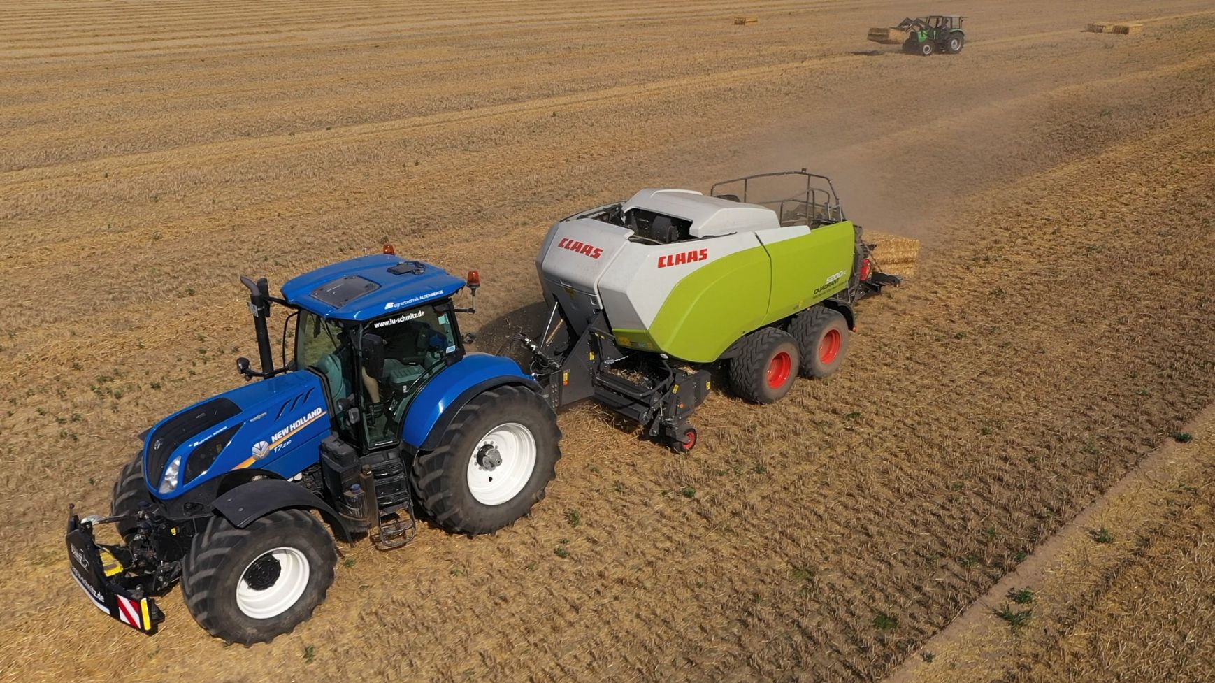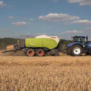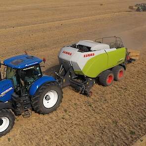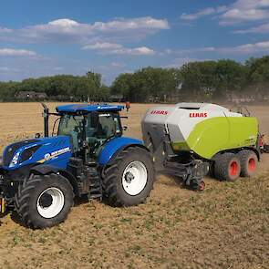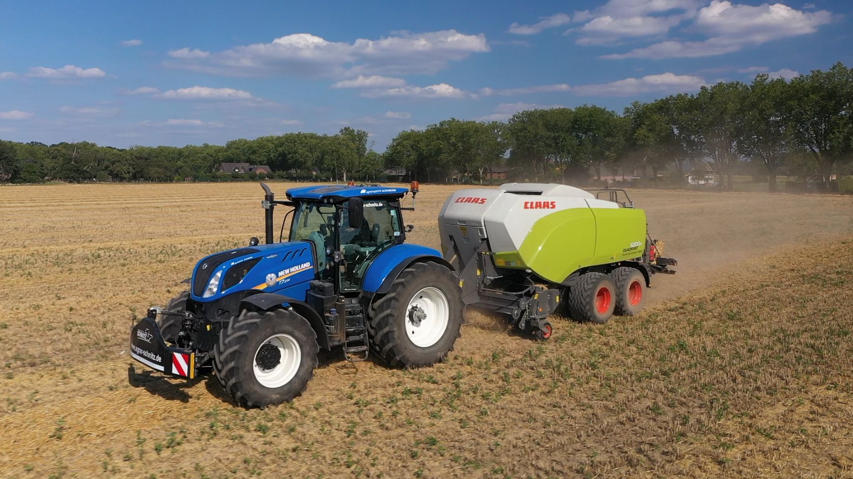 New Holland T7 met de Claas-grootpakpers vol gas in het stro.