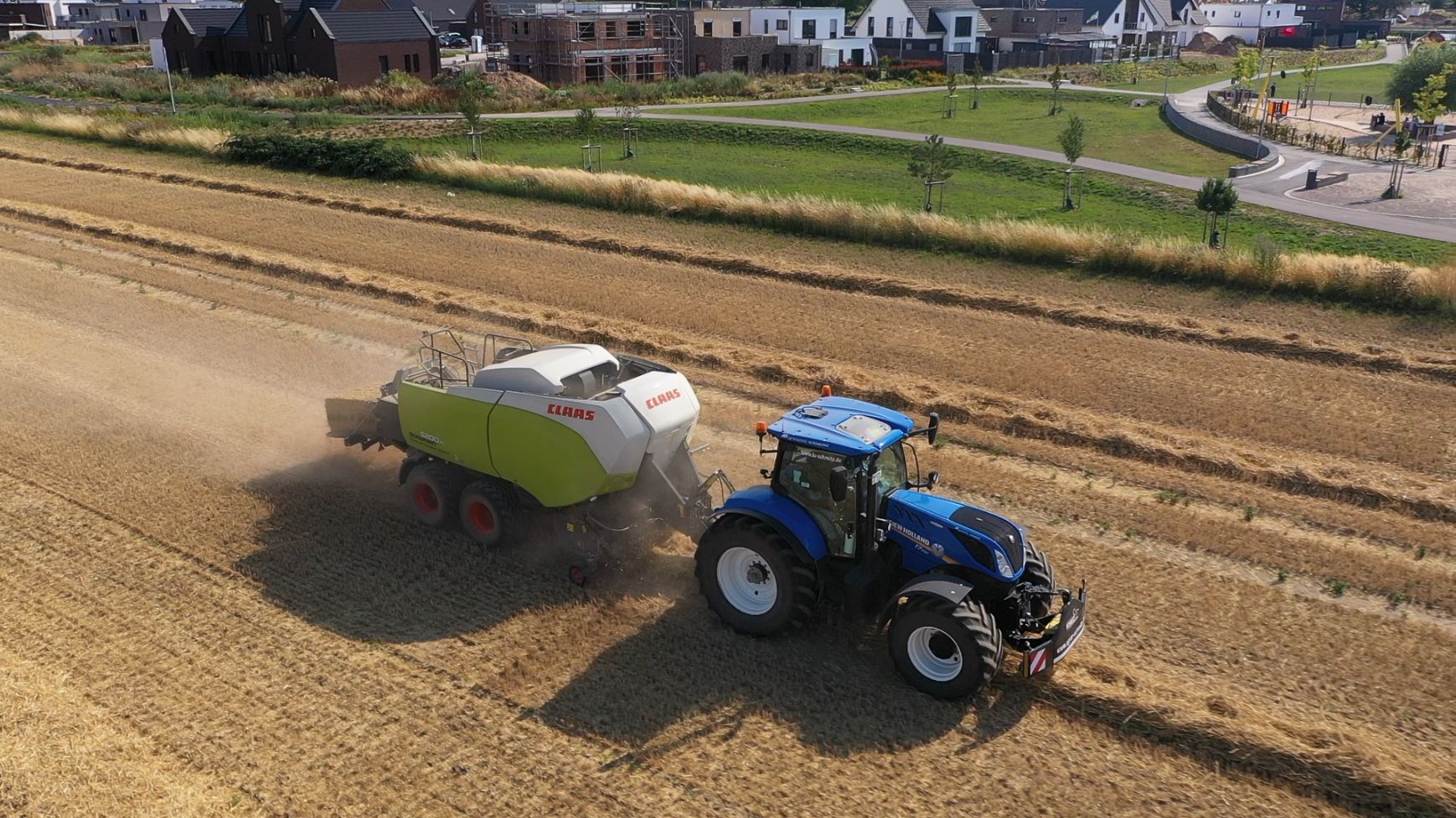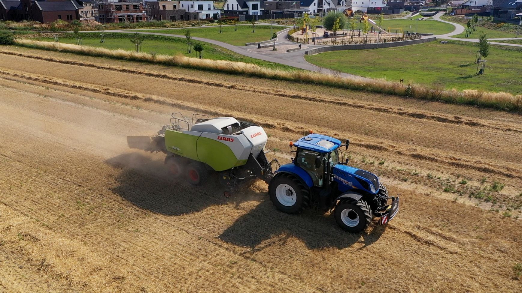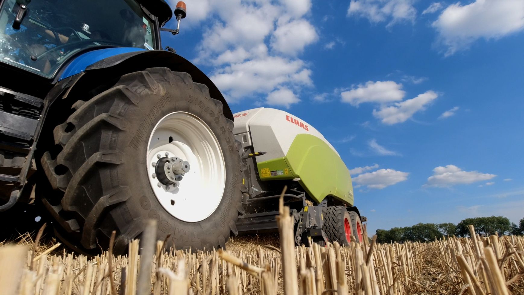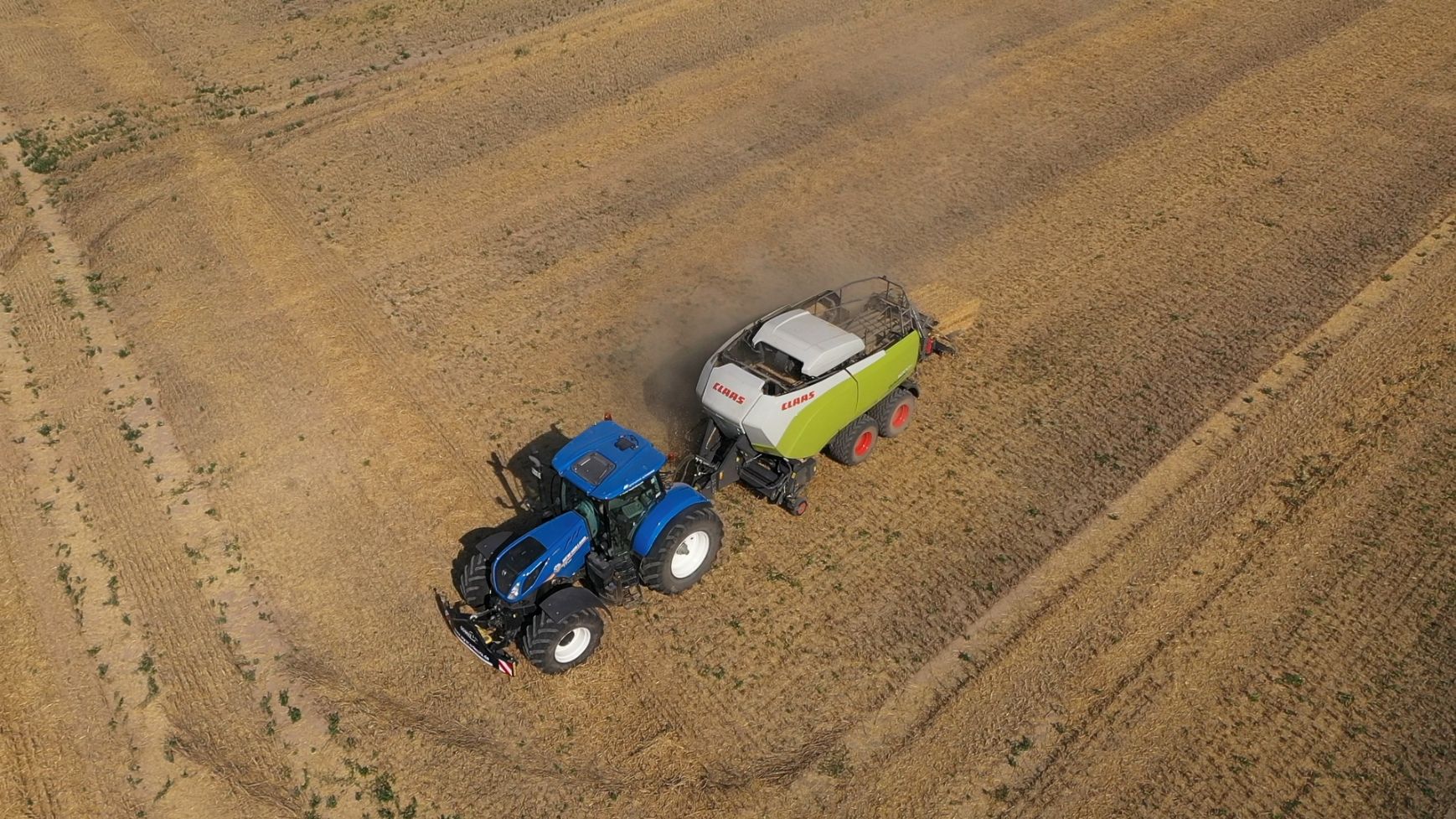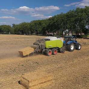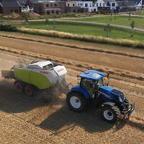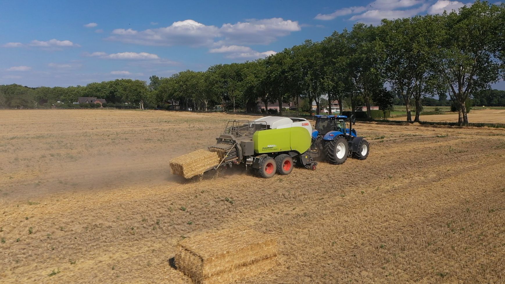 New Holland T7 met de Claas-grootpakpers vol gas in het stro.