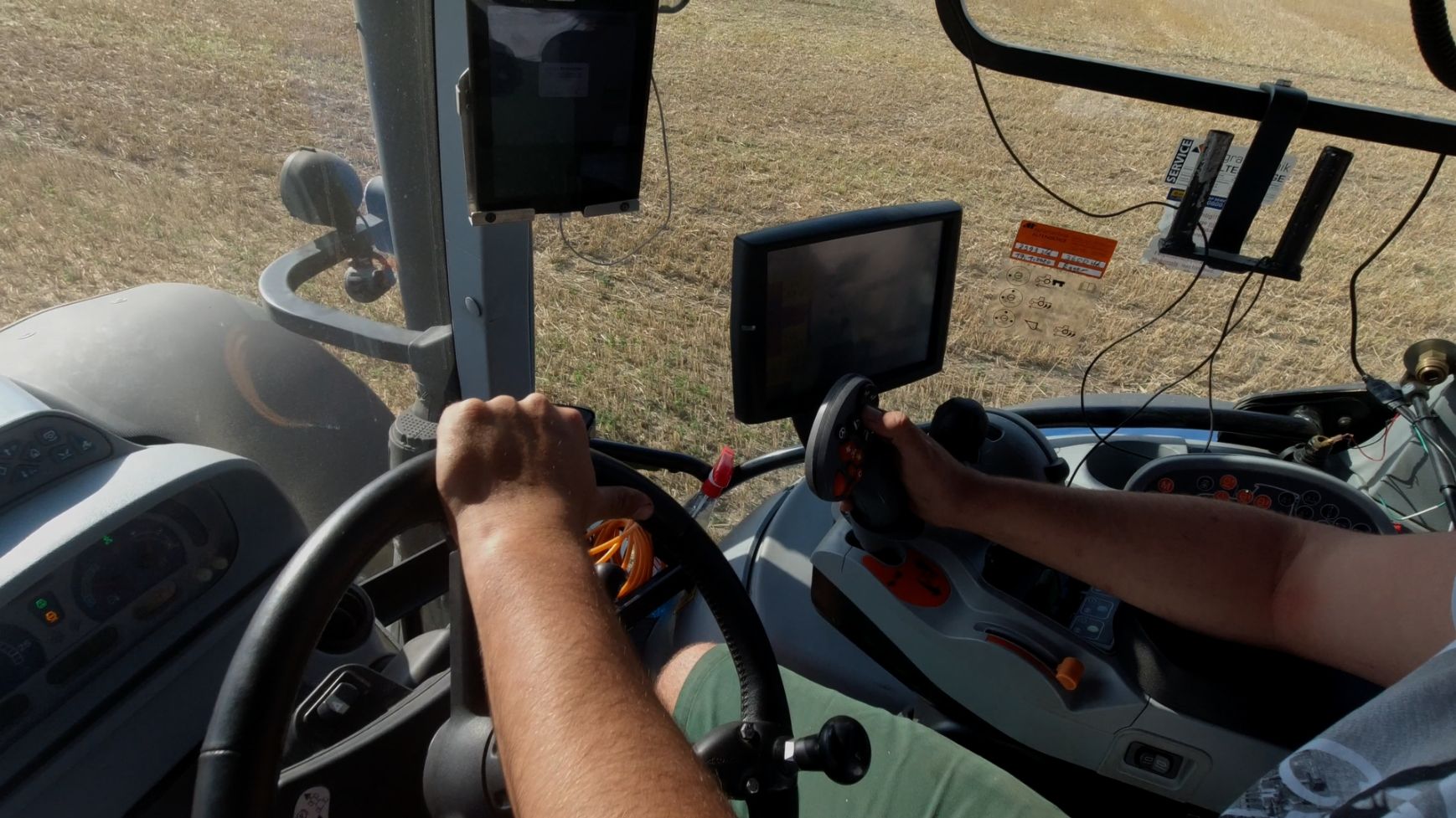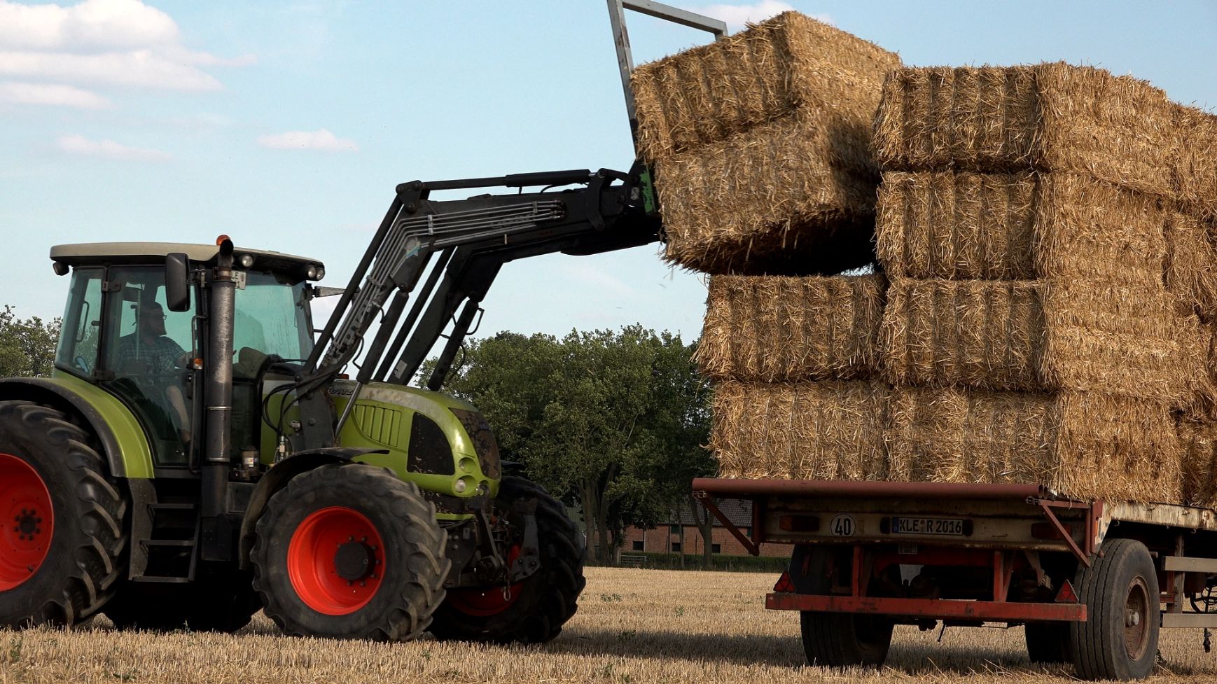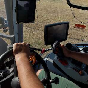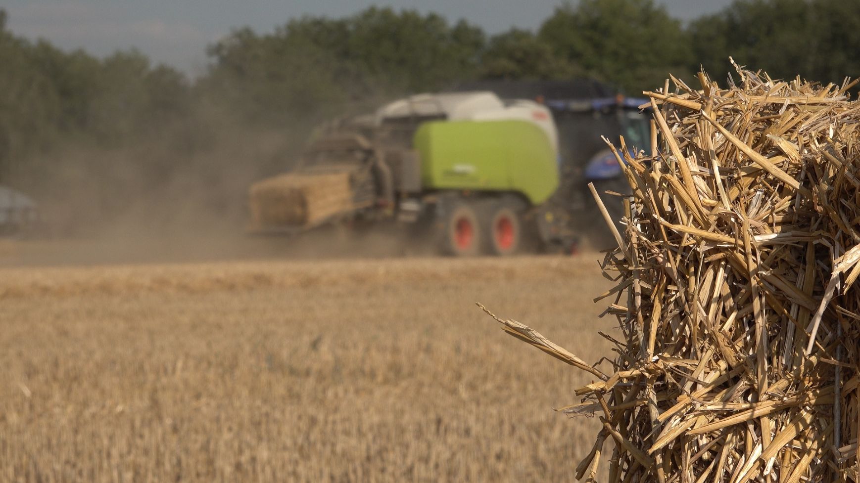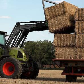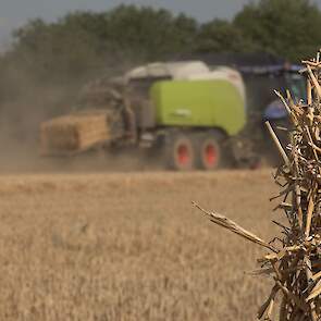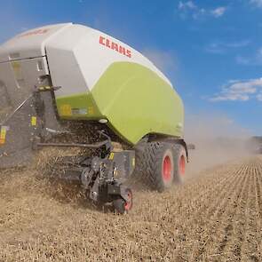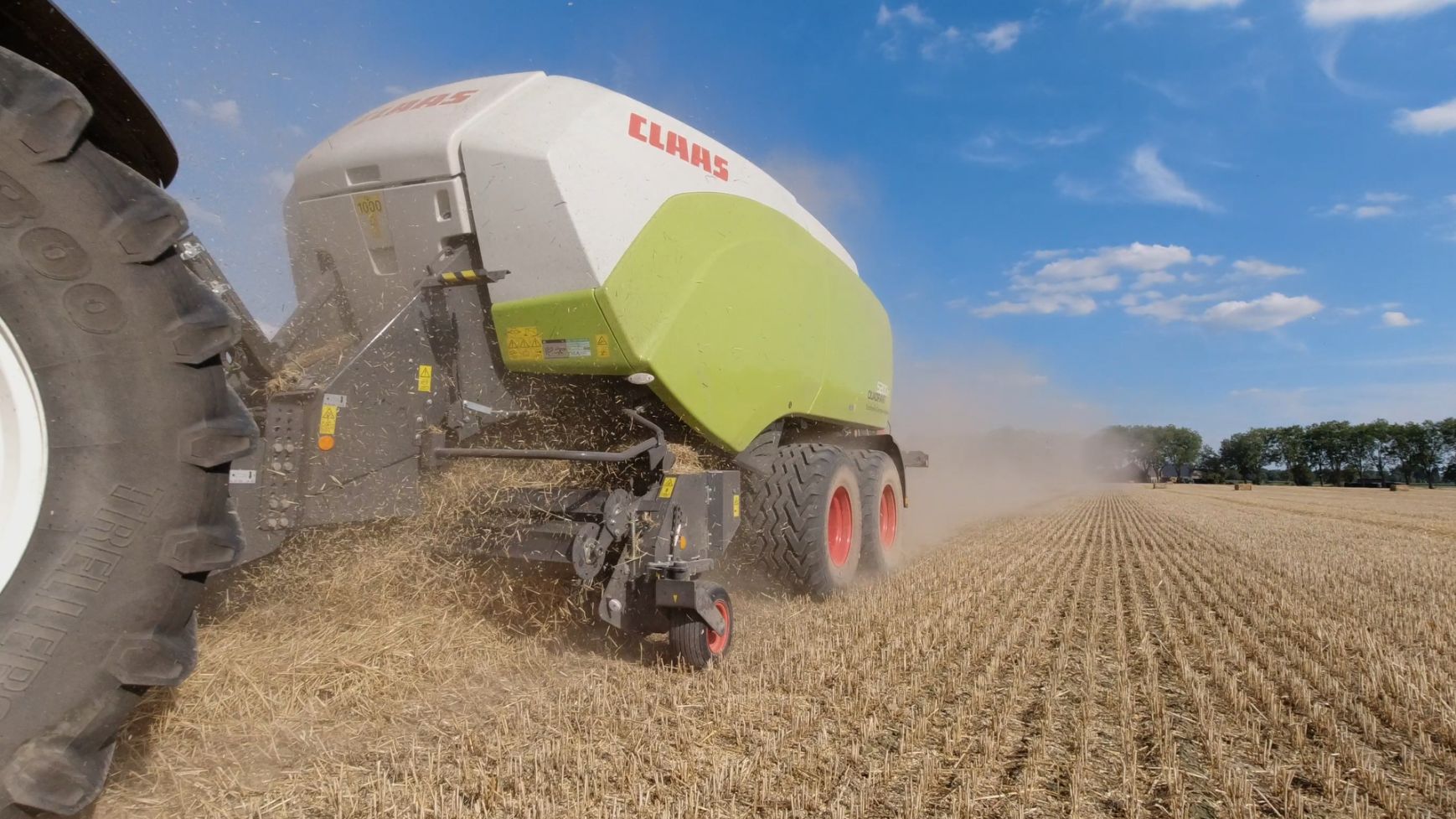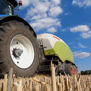 New Holland T7 met de Claas-grootpakpers vol gas in het stro.