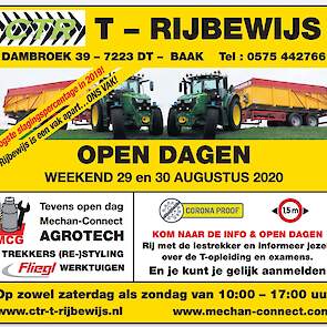 Kom daarom naar de open dagen of meld je via de website van het CTR in ieder geval zo spoedig mogelijk aan. Tevens worden de open dagen gecombineerd met een presentatie van het moederbedrijf Mechan-Connect Group BV. De Mechan-Connect Group toont onder andere de nieuwe John Deere 6155R Premium Edition met voorlader (welke ook gedeeltelijk ingezet wordt voor het CTR), de revisie- en spuitwerken voor trekkers, een greep uit de Fliegl-werktuigen waar het bedrijf dealer van is, de nieuwe M.A.N.-diepladercombinatie voor transportwerken en ook wordt de John Deere HarvestLab gedemonstreerd waarmee de fourage-/ akkerbouwtak van de Mechan-Connect Group mee werkt. Bezoeker zijn beide dagen van harte welkom tussen 10:00 en 17:00 uur.