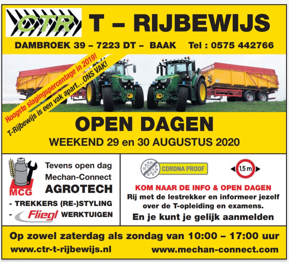 Op zaterdag 29 en zondag 30 augustus zijn er open dagen bij het CTR T-Rijbewijs te Baak. De open dagen worden geheel "corona-proof" opgesteld op het ruime terrein buiten en binnen. Iedereen uit de Achterhoek, Veluwe, Salland en Twente die interesse heeft en/of zijn T-Rijbewijs nog wil halen doet er goed aan om naar deze open dagen te komen. Je kunt er alle informatie krijgen over de T-opleiding, de les-combinaties zien en een proefrondje rijden. En je kunt je gelijk aanmelden voor de T-opleiding, zodat je er op tijd bij bent. Ben je 15 jaar of ouder, en je wilt je T halen, zorg dan dat je erbij bent. Bij alle T-opleiders is het nu erg druk door de inhaalslag door de stilstand vanwege corona. En deze drukte zal zeker nog dik een half jaar aanhouden.