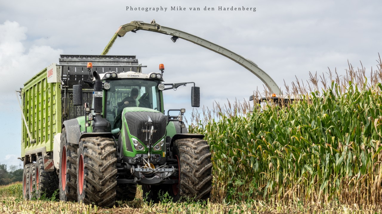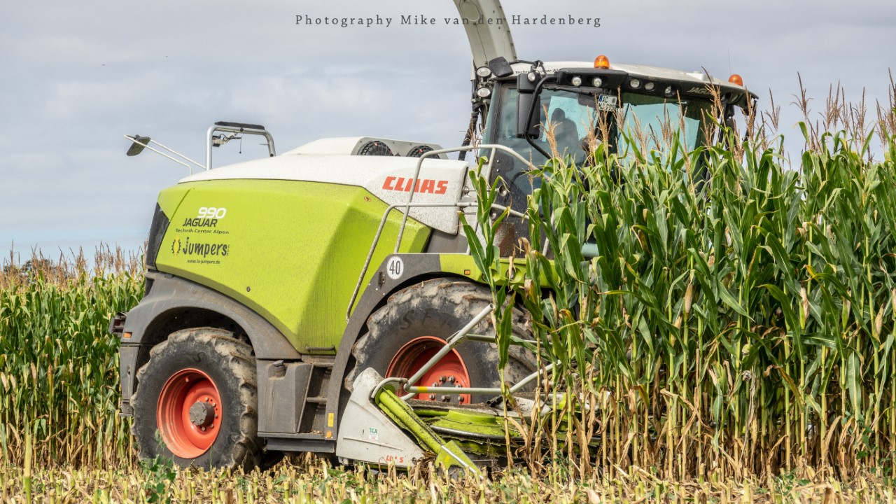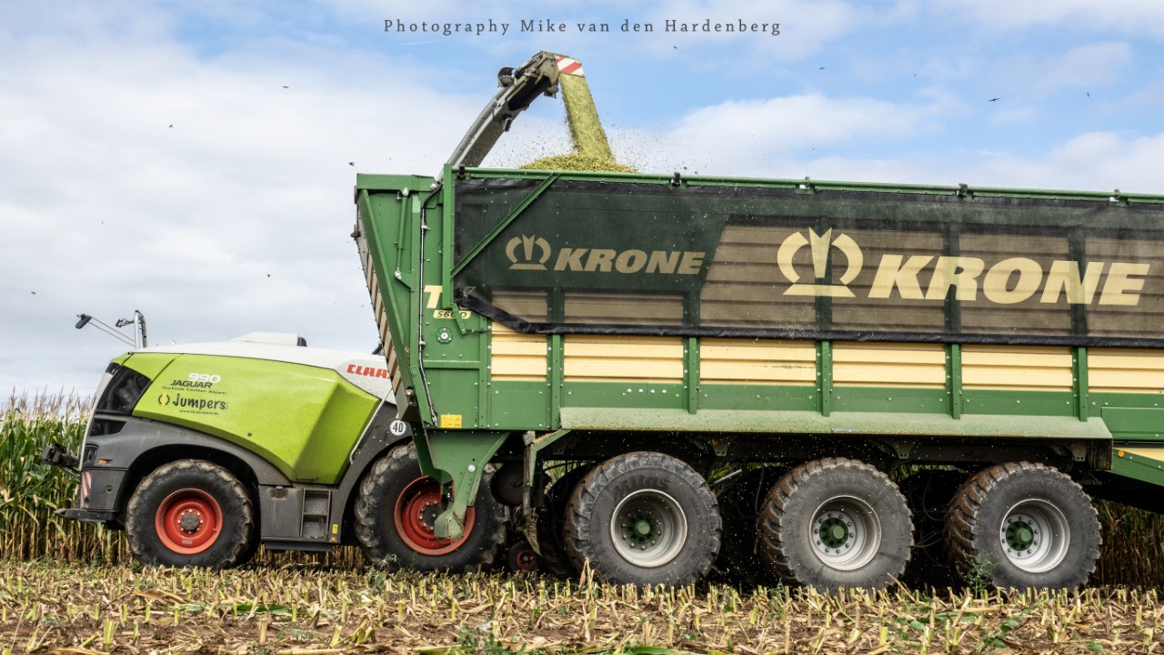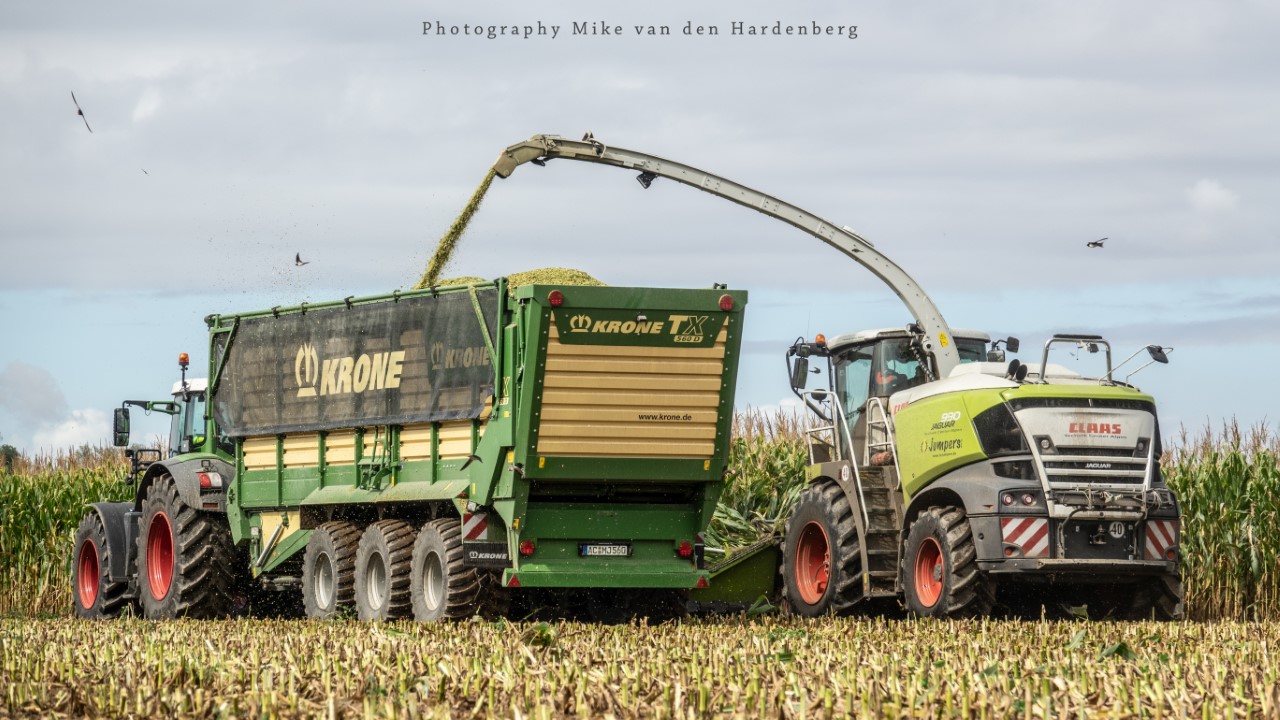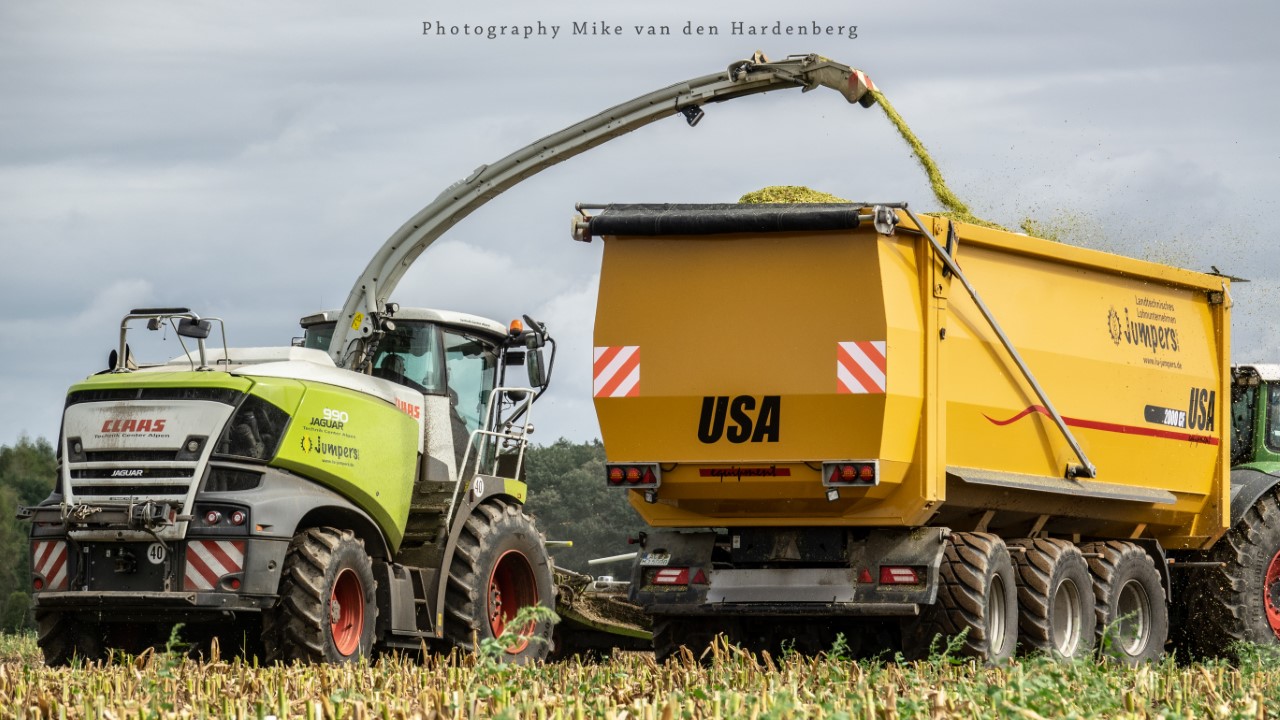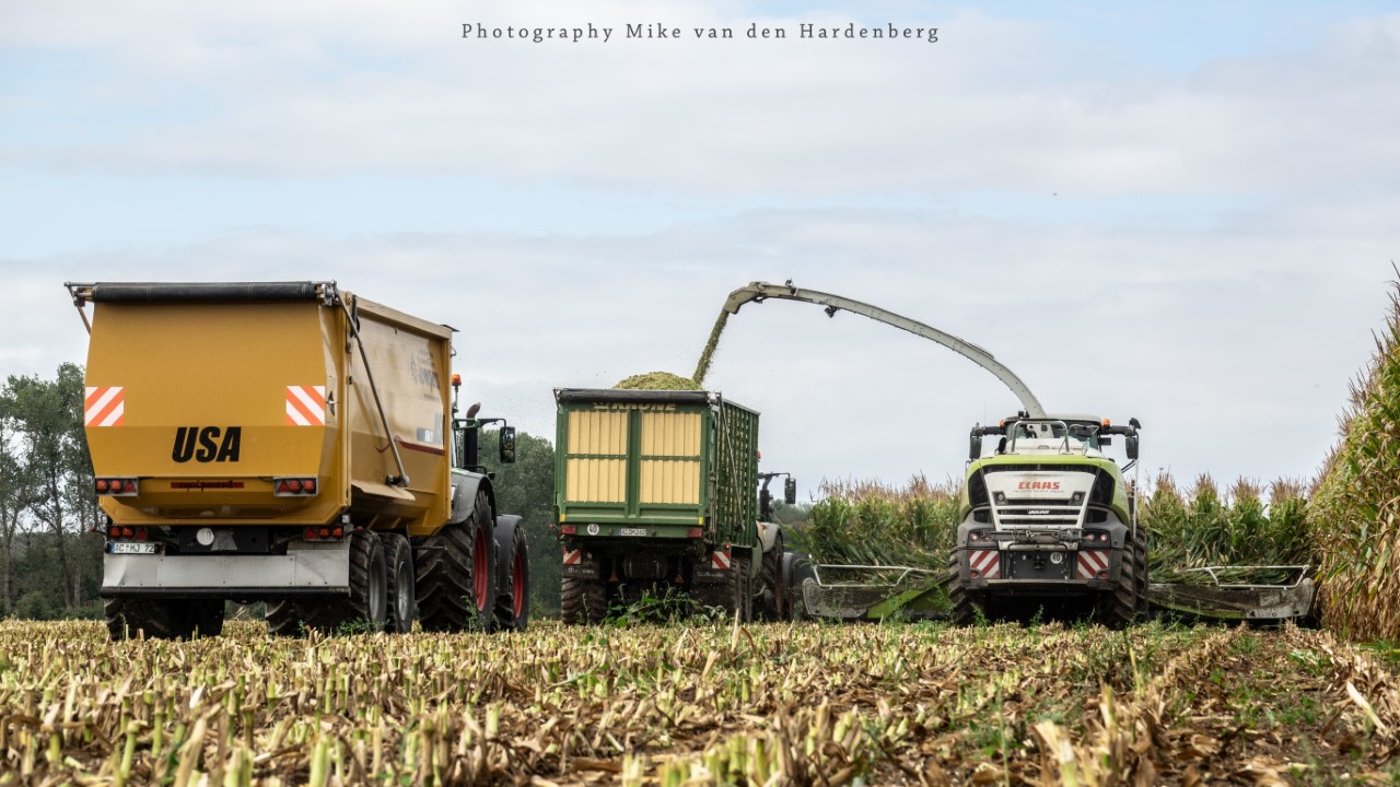 Loonbedrijf Jumpers uit Aachen (DE) in de mais met groot materiaal: een Claas Jaguar 990, een Fendt 942 met Tigo-wagen, USA-kipper en Krone-silagewagen.