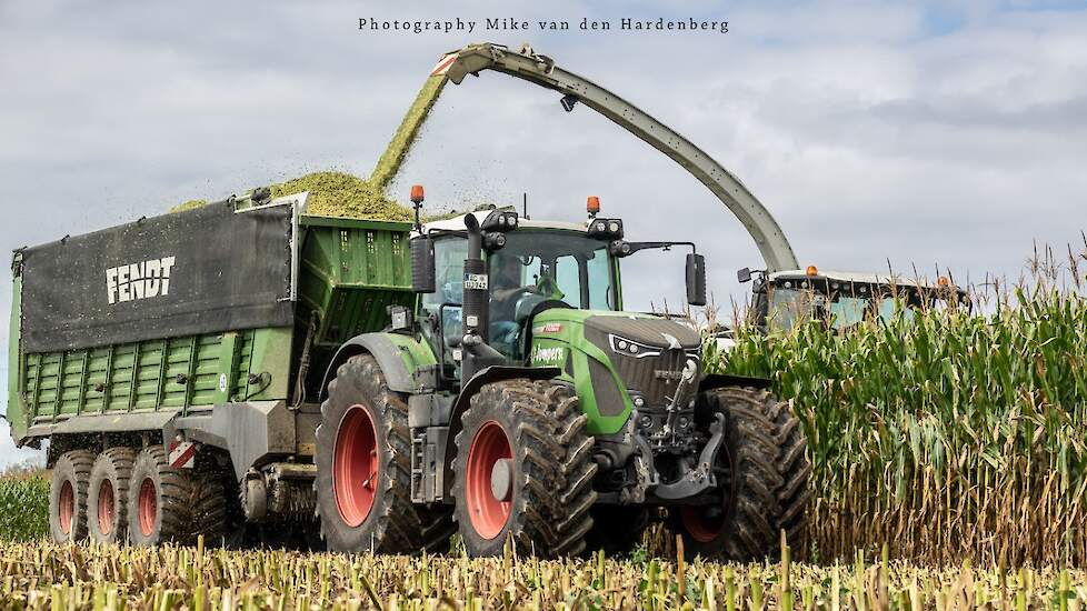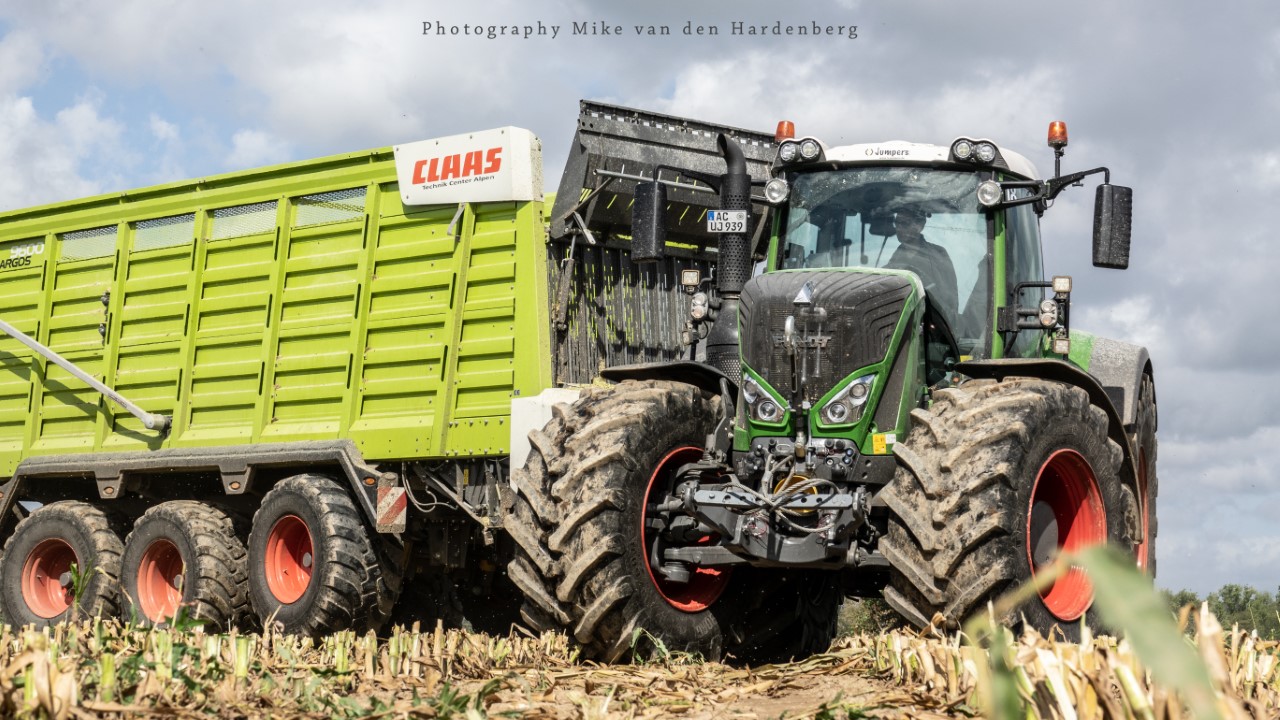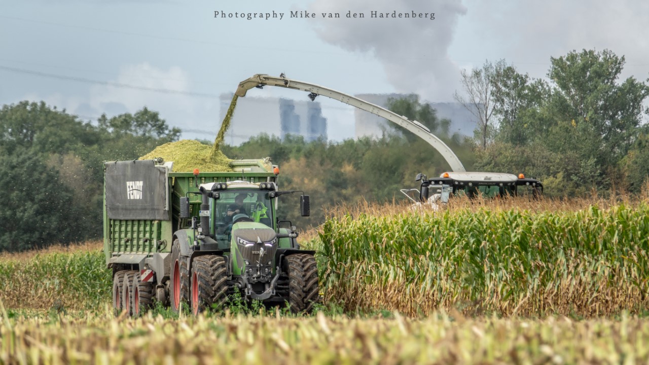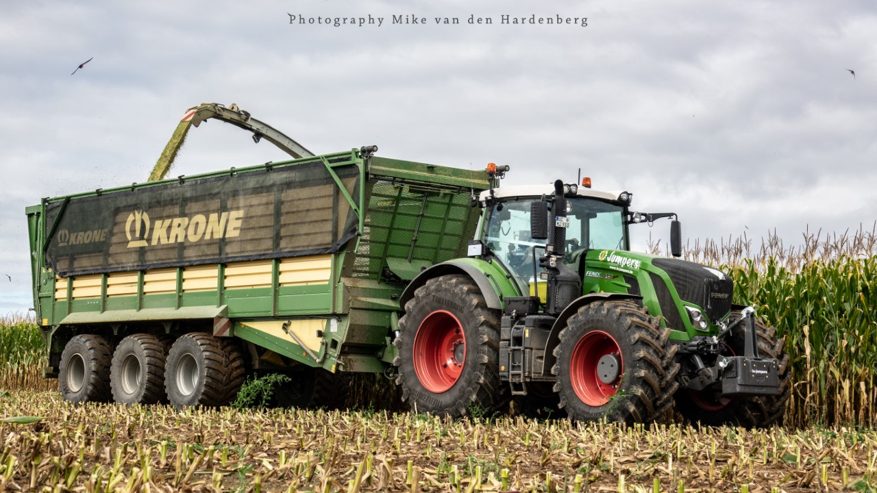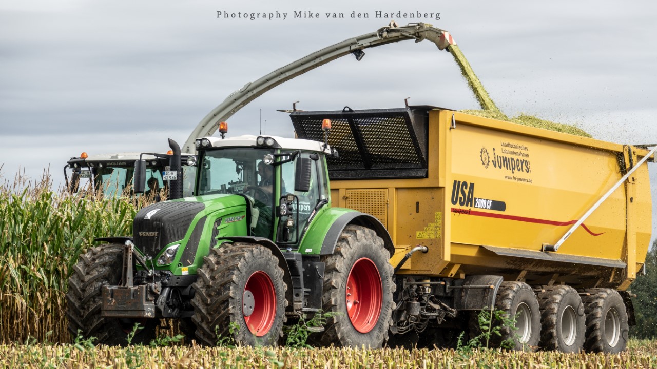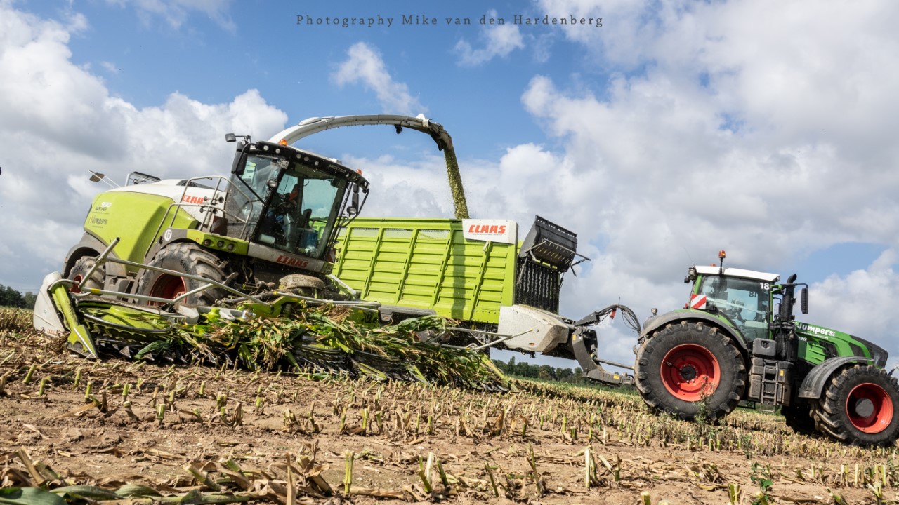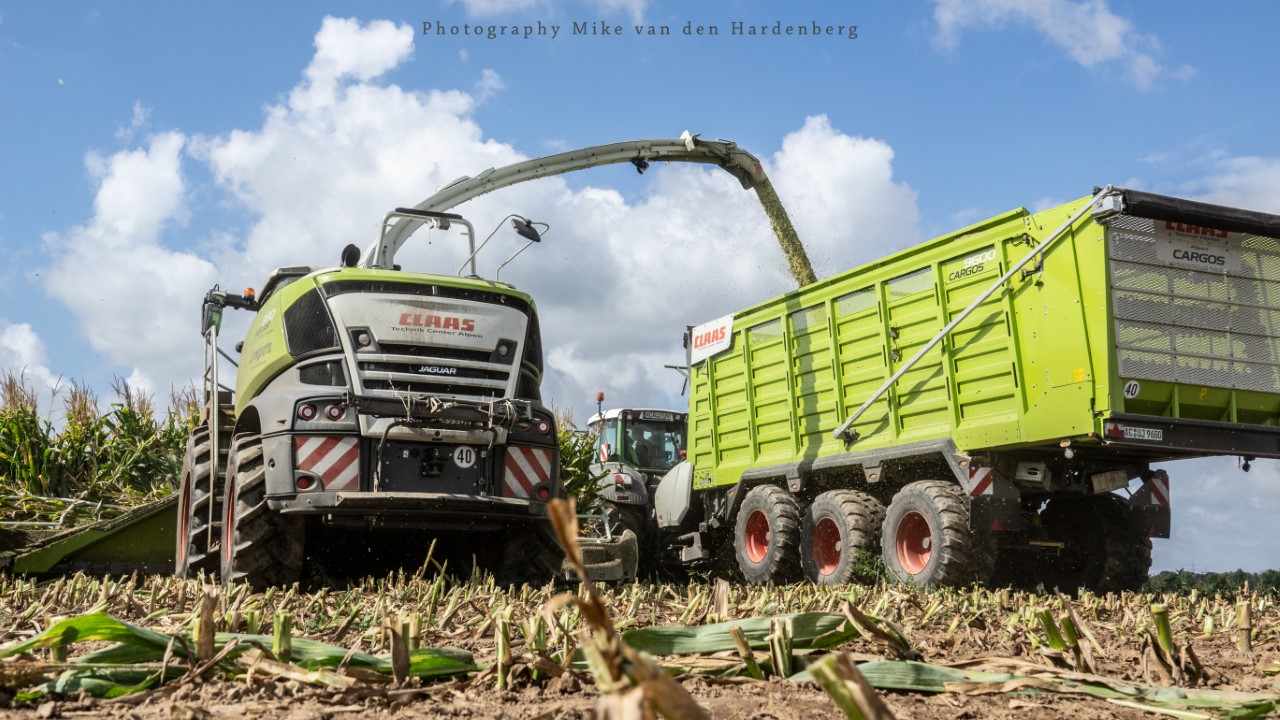Loonbedrijf Jumpers uit Aachen (DE) in de mais met groot materiaal: een Claas Jaguar 990, een Fendt 942 met Tigo-wagen, USA-kipper en Krone-silagewagen.