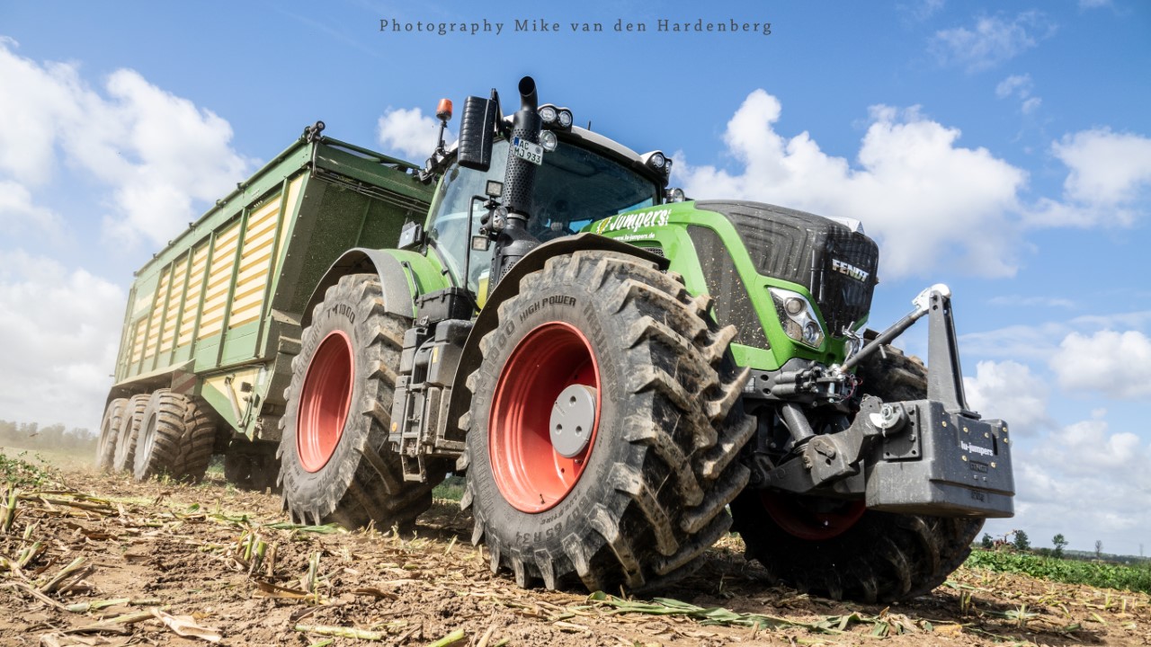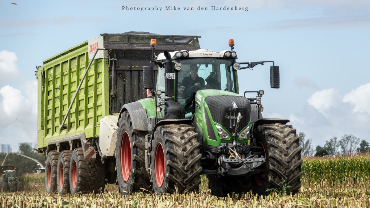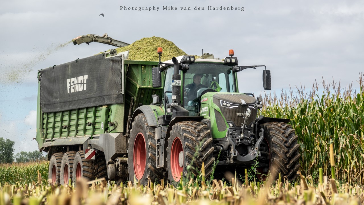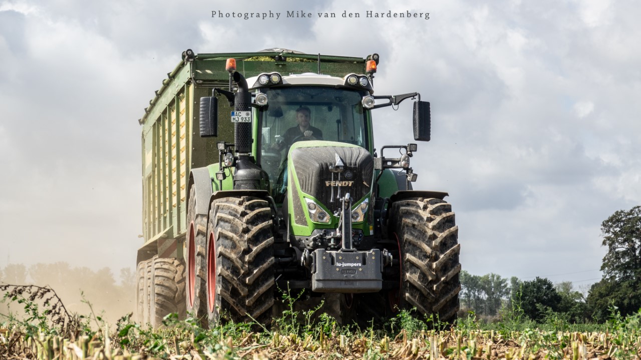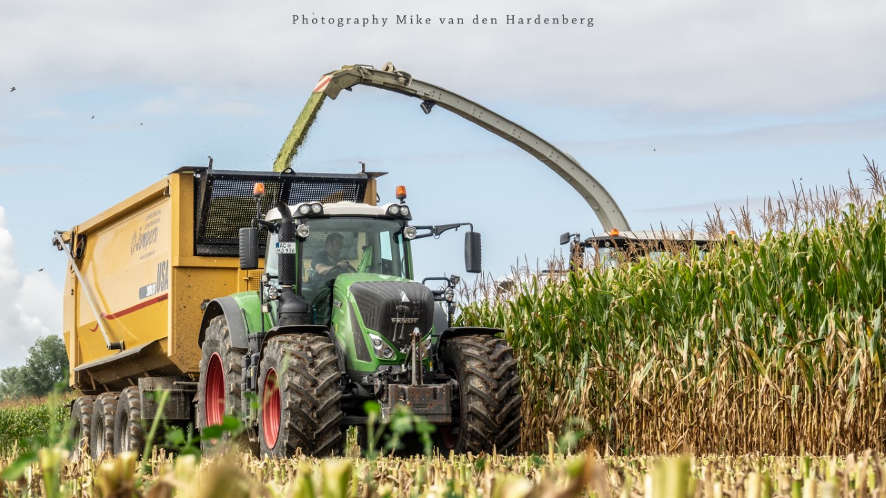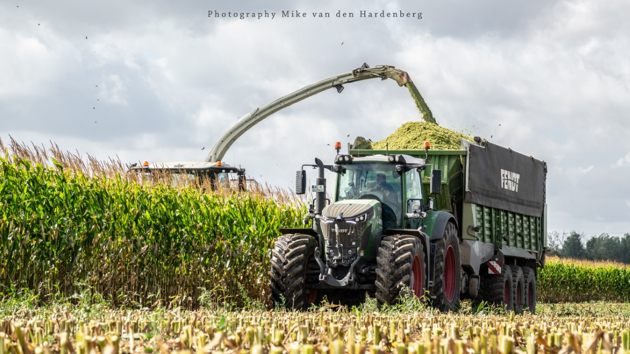 Loonbedrijf Jumpers uit Aachen (DE) in de mais met groot materiaal: een Claas Jaguar 990, een Fendt 942 met Tigo-wagen, USA-kipper en Krone-silagewagen.