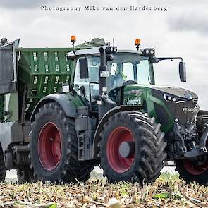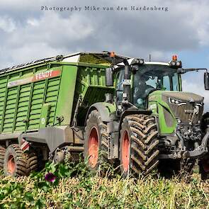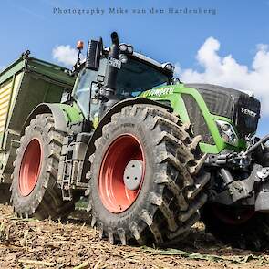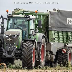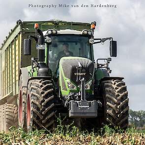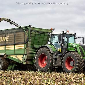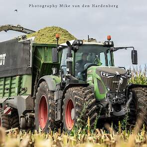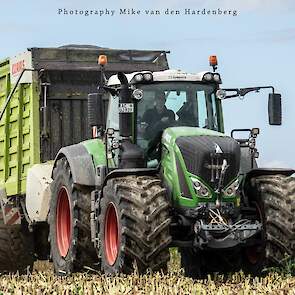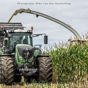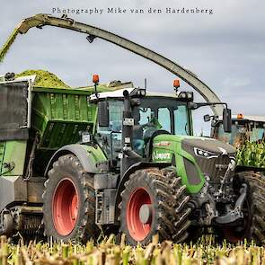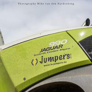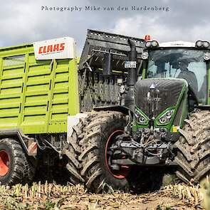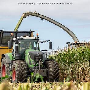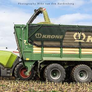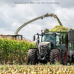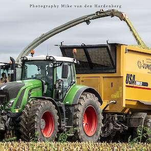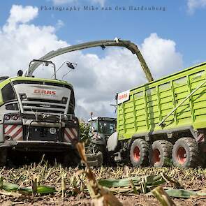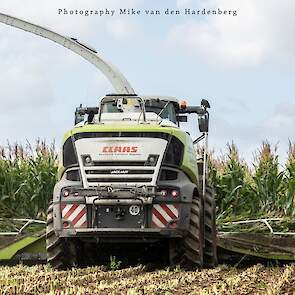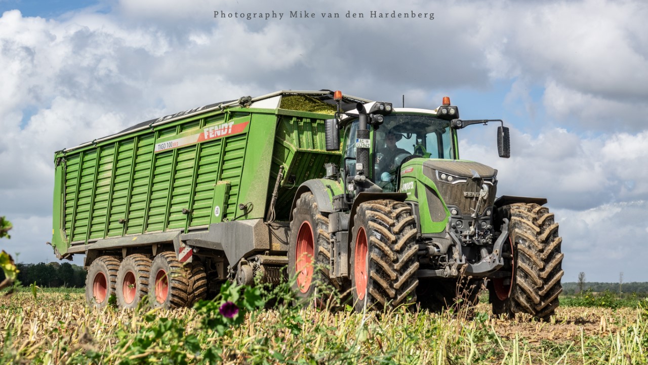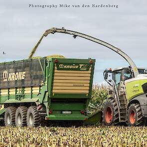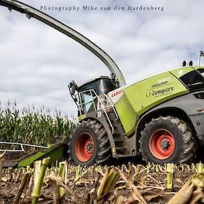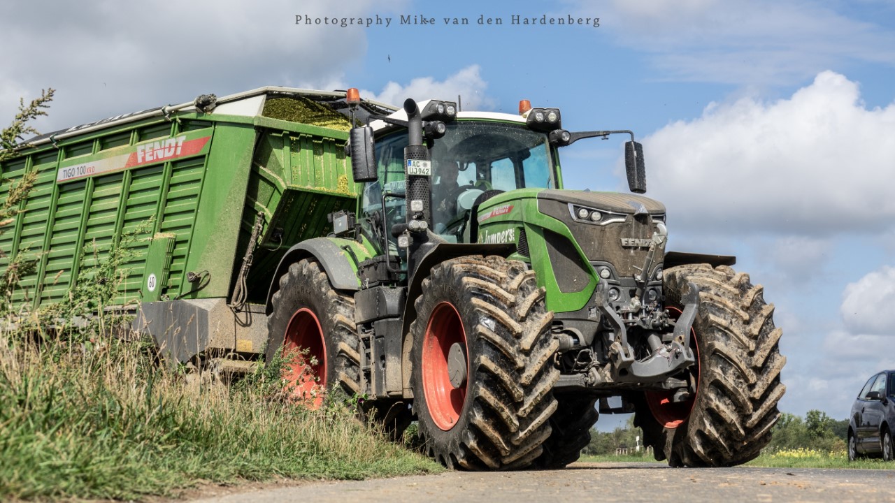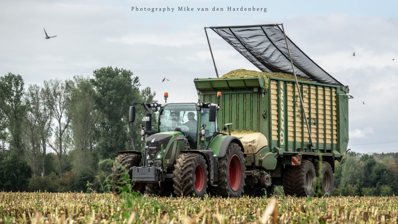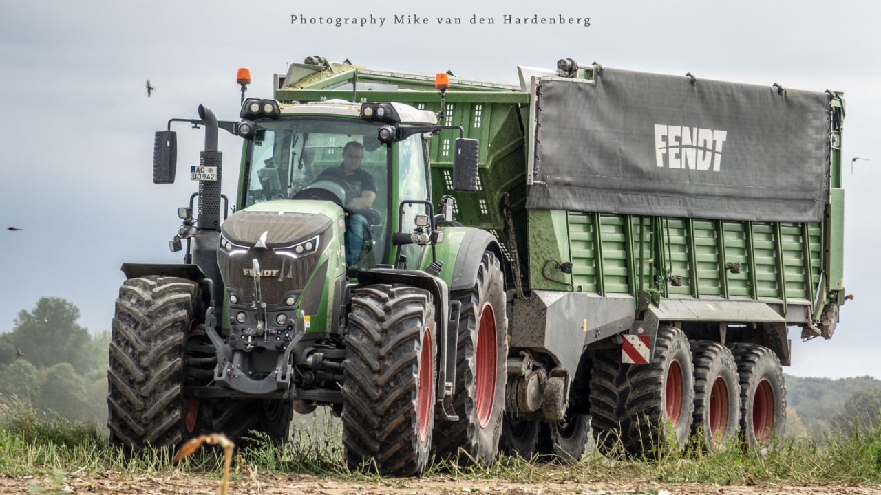 Loonbedrijf Jumpers uit Aachen (DE) in de mais met groot materiaal: een Claas Jaguar 990, een Fendt 942 met Tigo-wagen, USA-kipper en Krone-silagewagen.