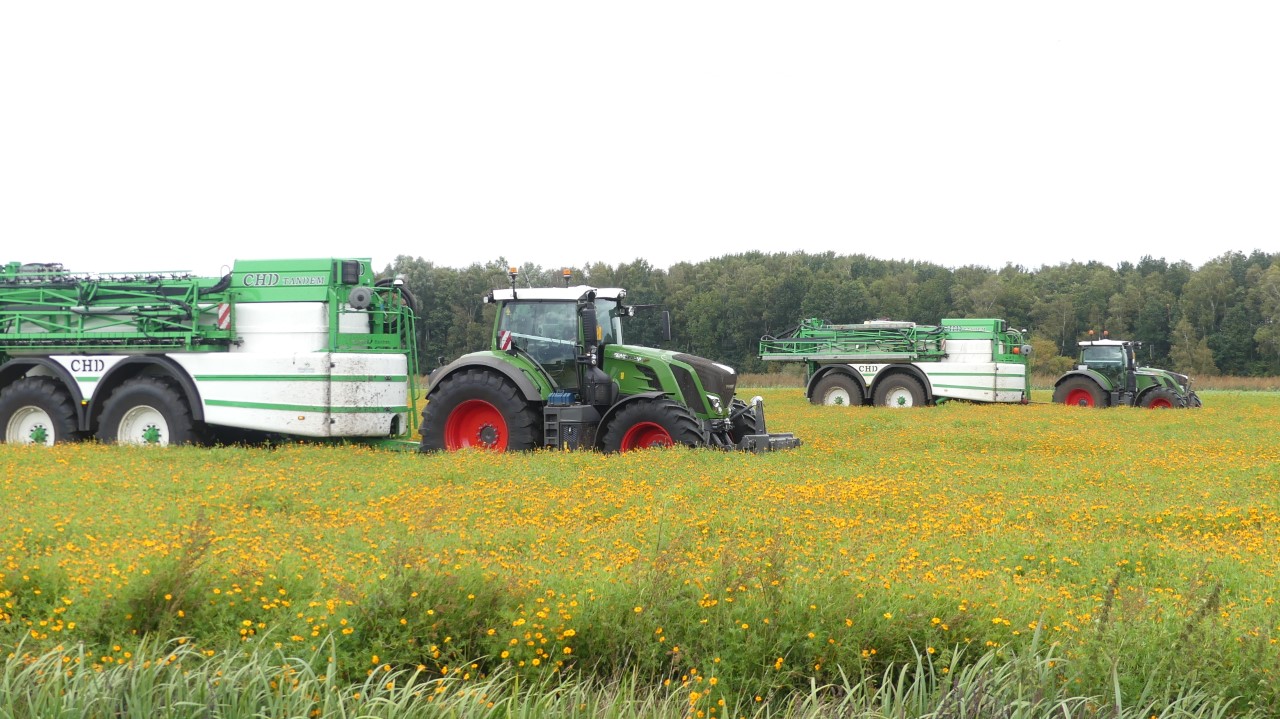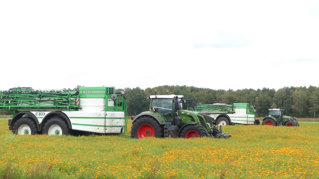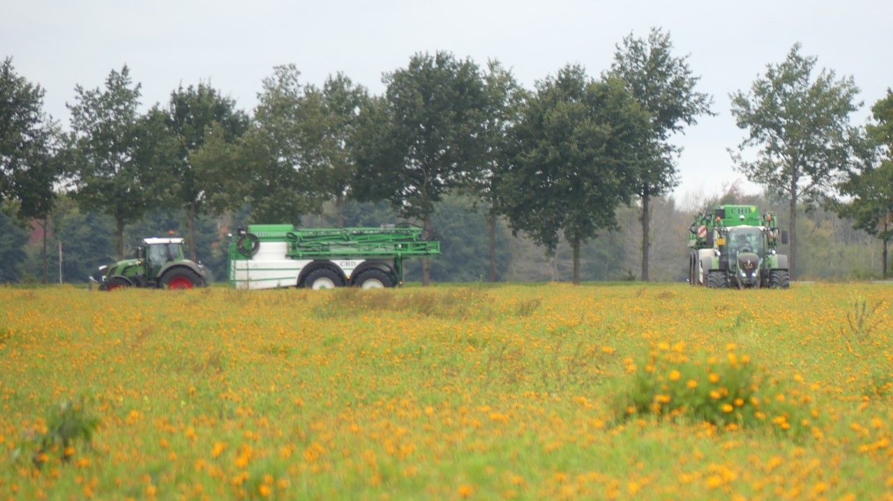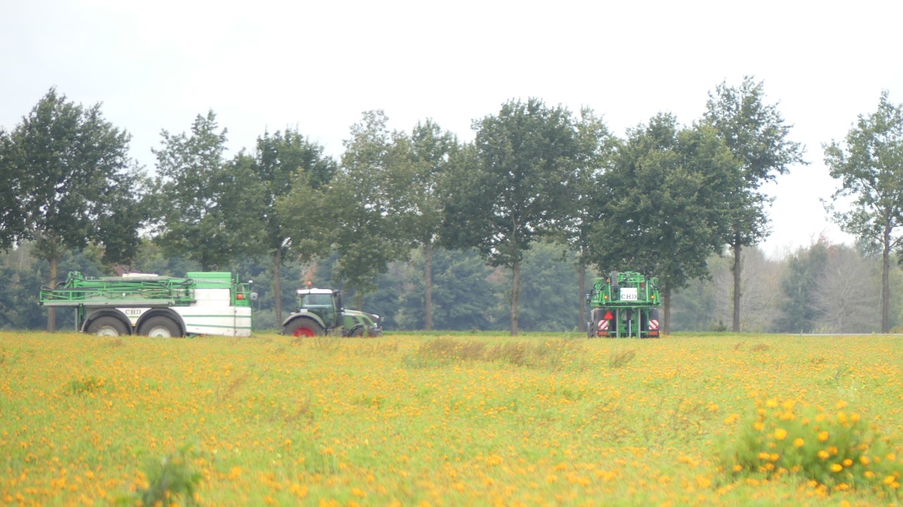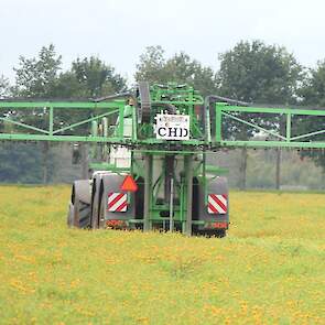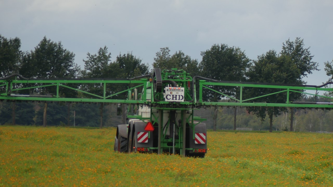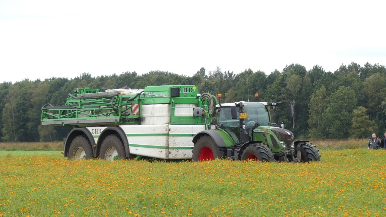 Vanmiddag werd een demo van twee CHD-tandemasser veldspuiten van CHD Eefting BV gegeven, waarbij er een voorzien was van het Maggrow-systeem. De telers konden zien met behulp van watergevoelig papier wat het effect van de Maggrown was ten opzichte van de conventionele spuit.
