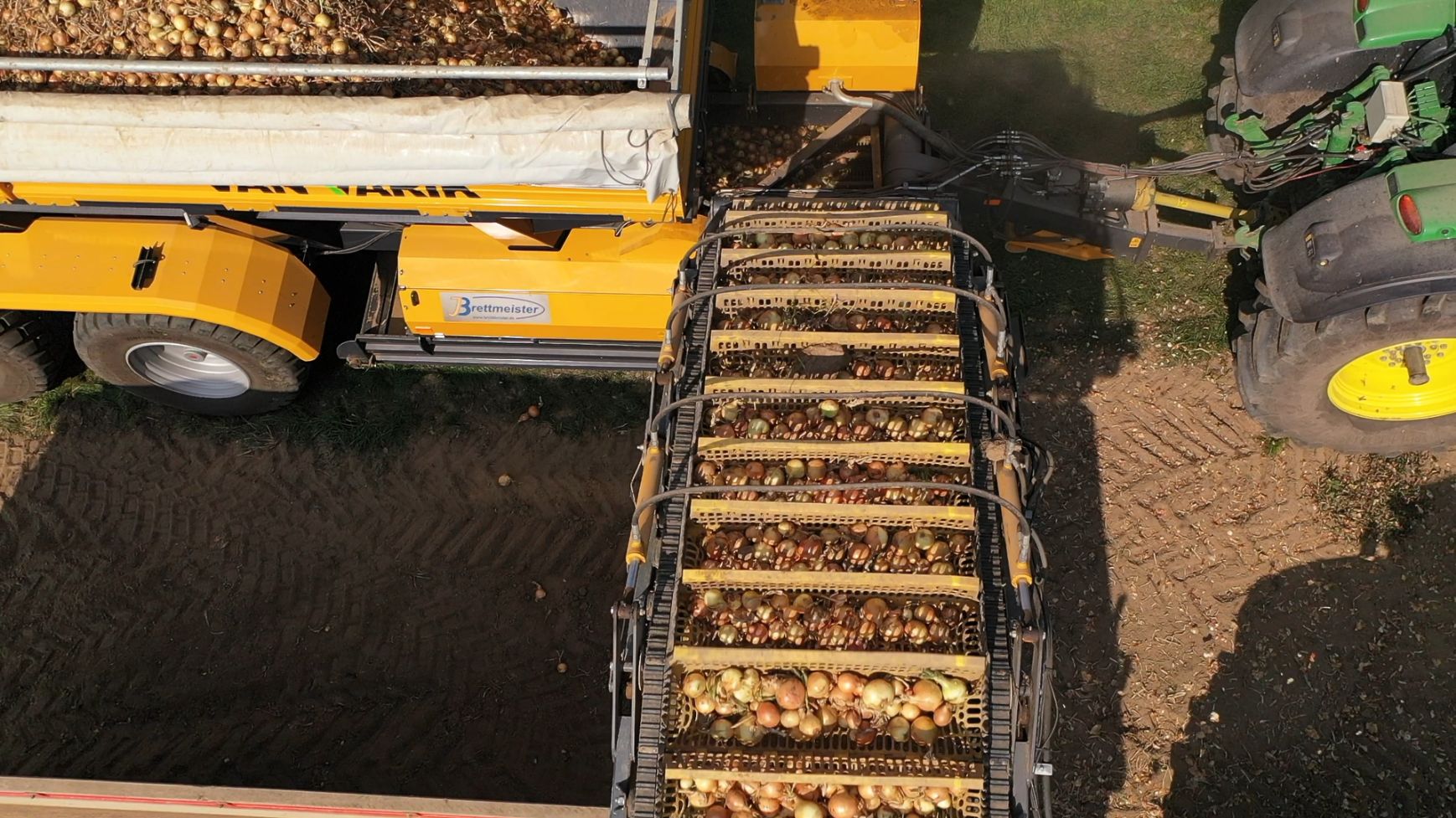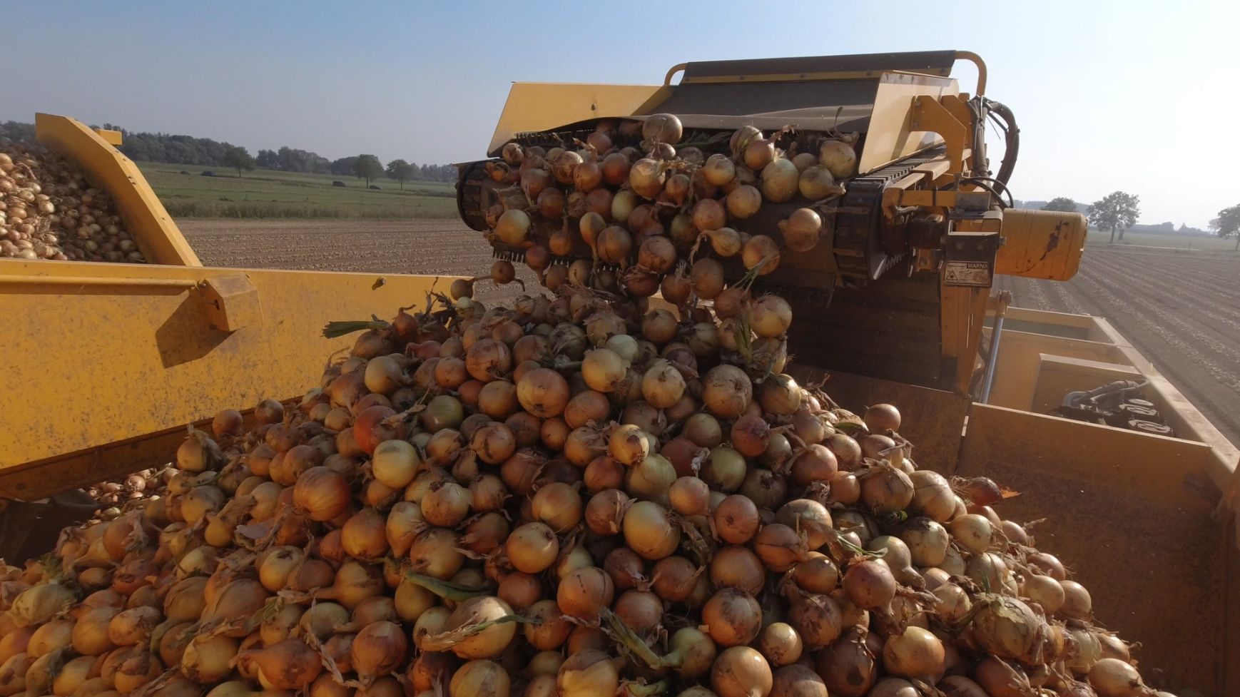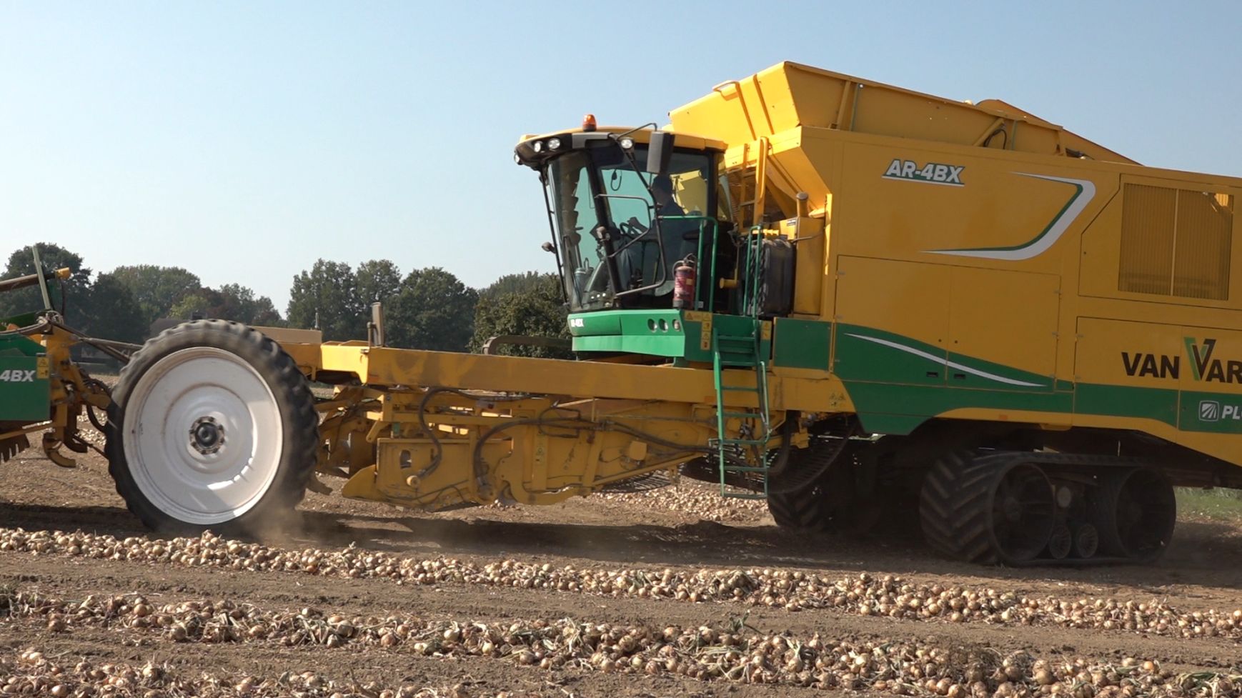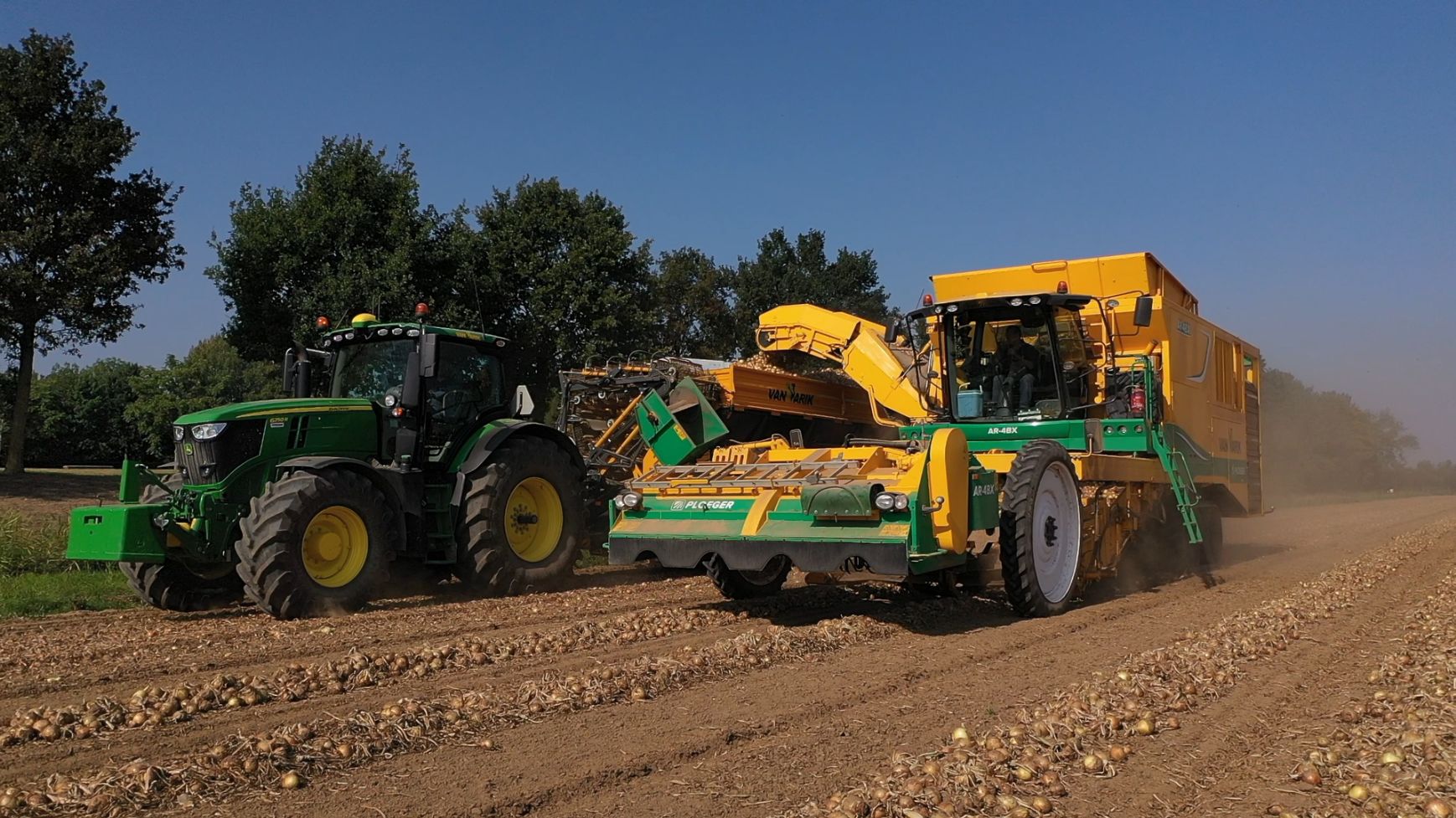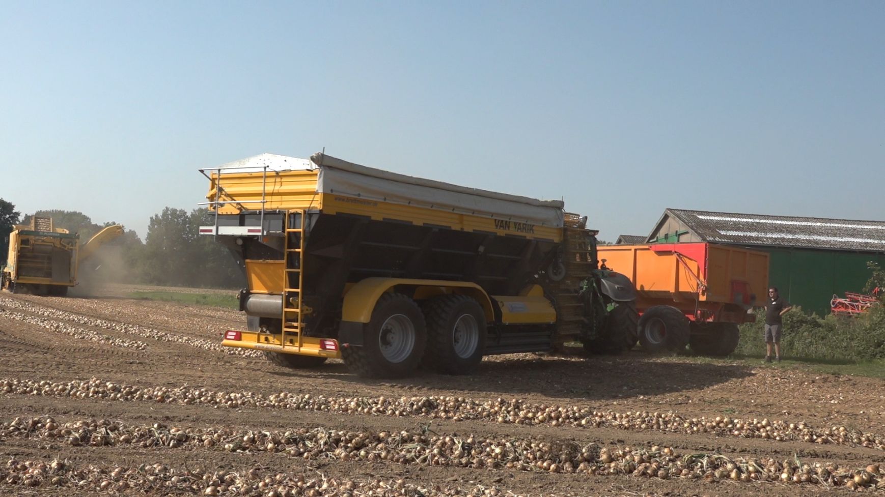 Loon- en akkerbouwbedrijf van Varik met de Ploeger AR-4BX in de uienoogst. De Brettmeister-overlaadwagen zorgt voor het transport van de uien naar de kipwagens.