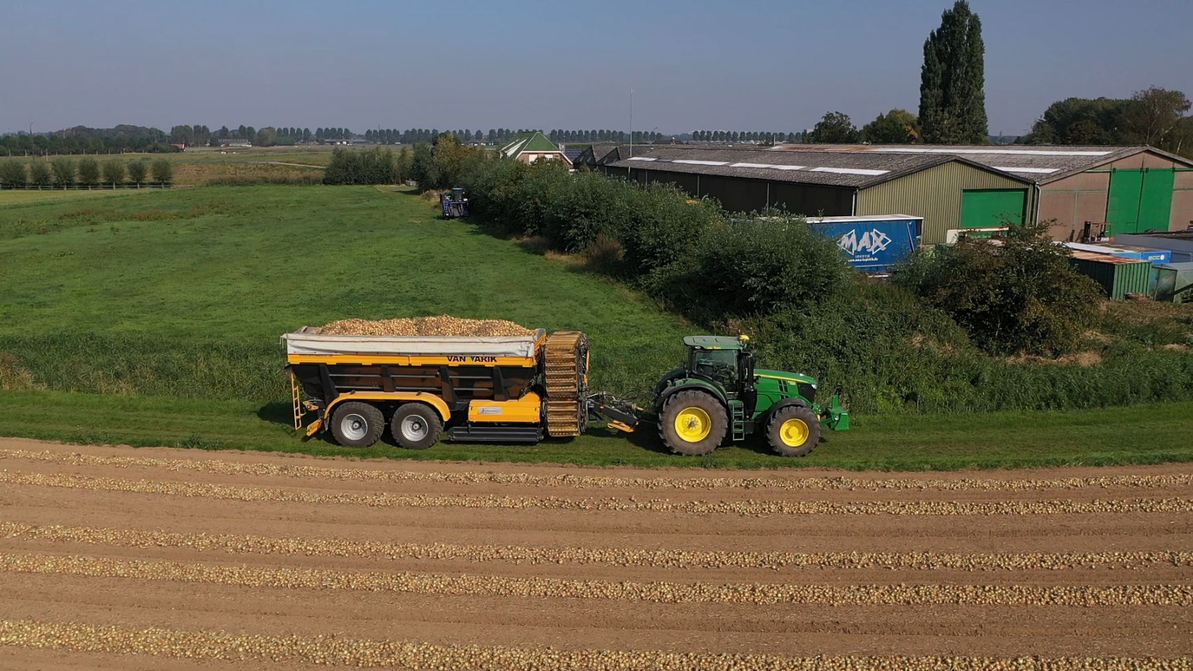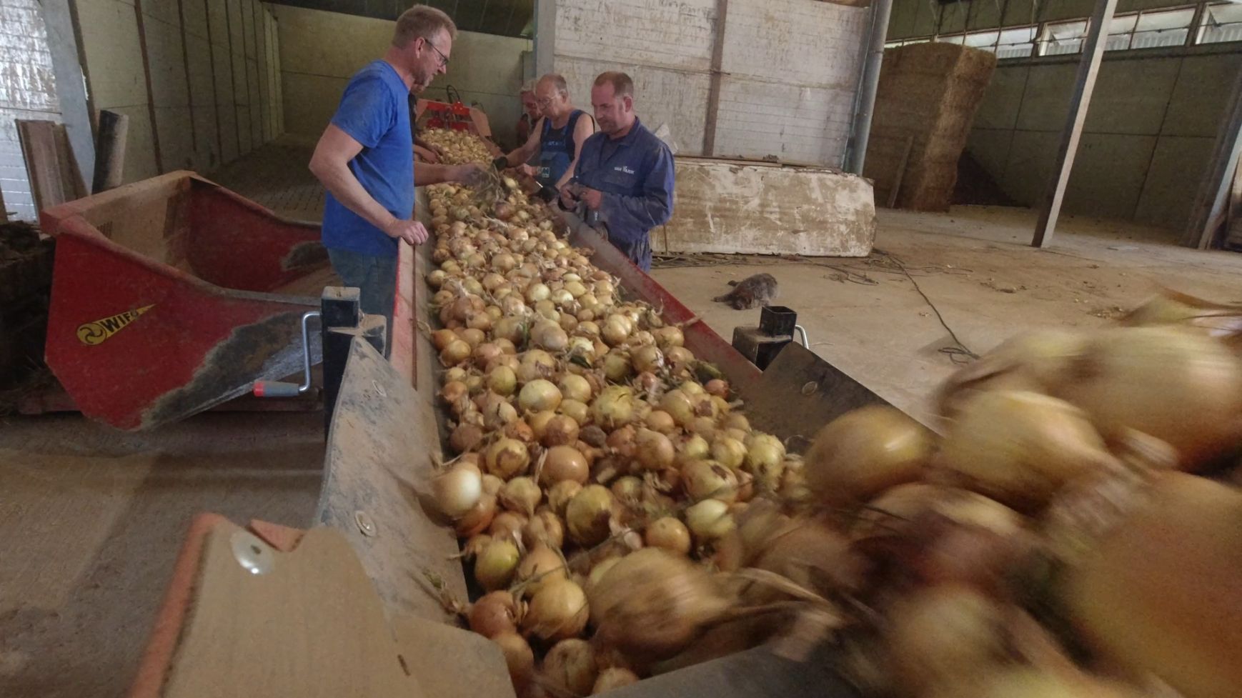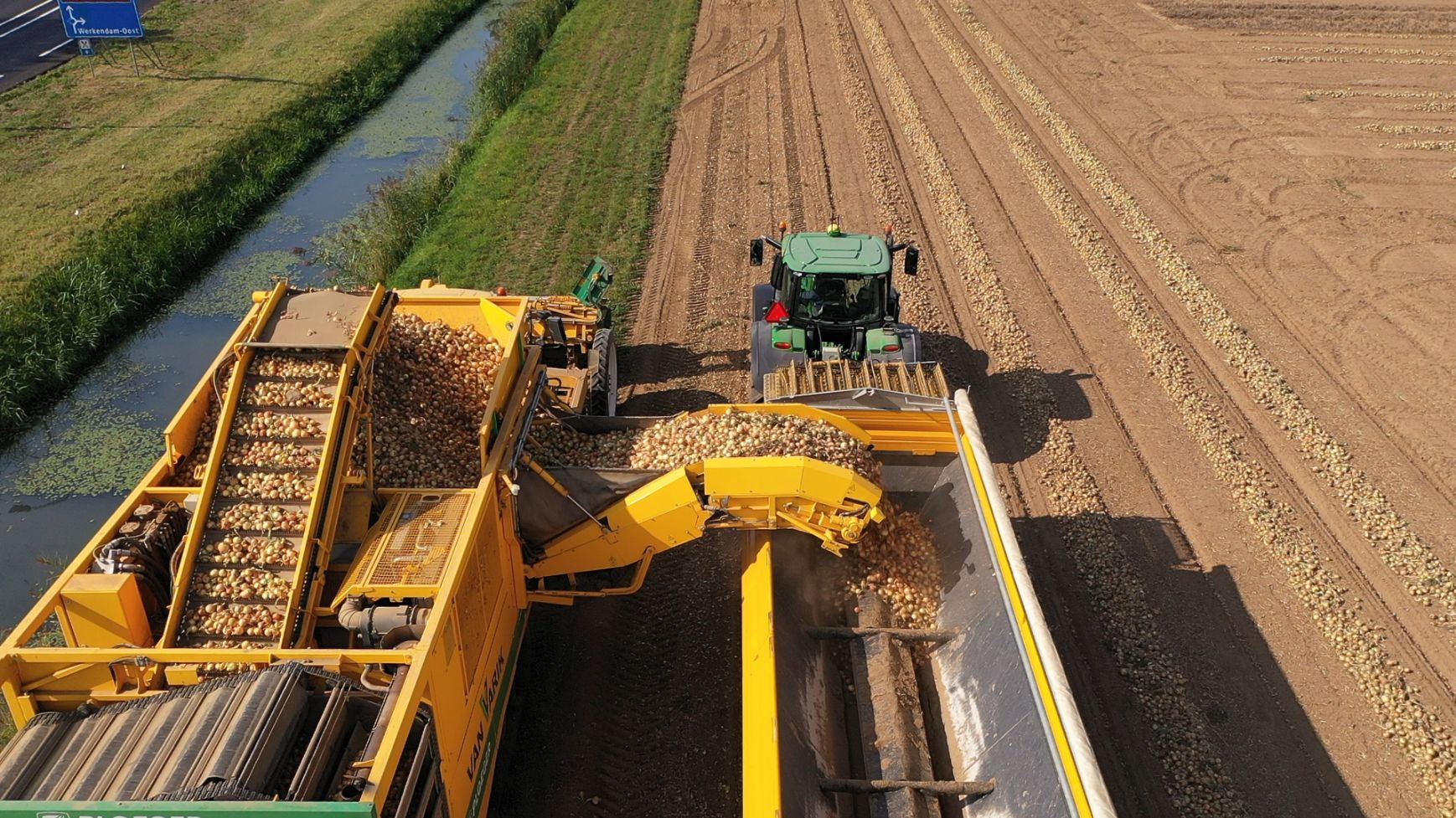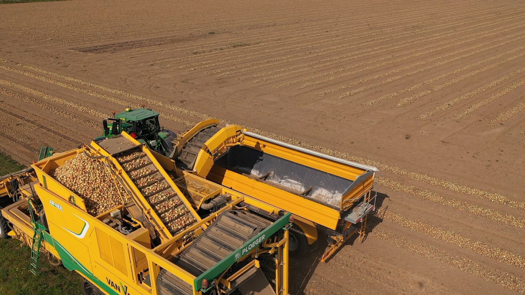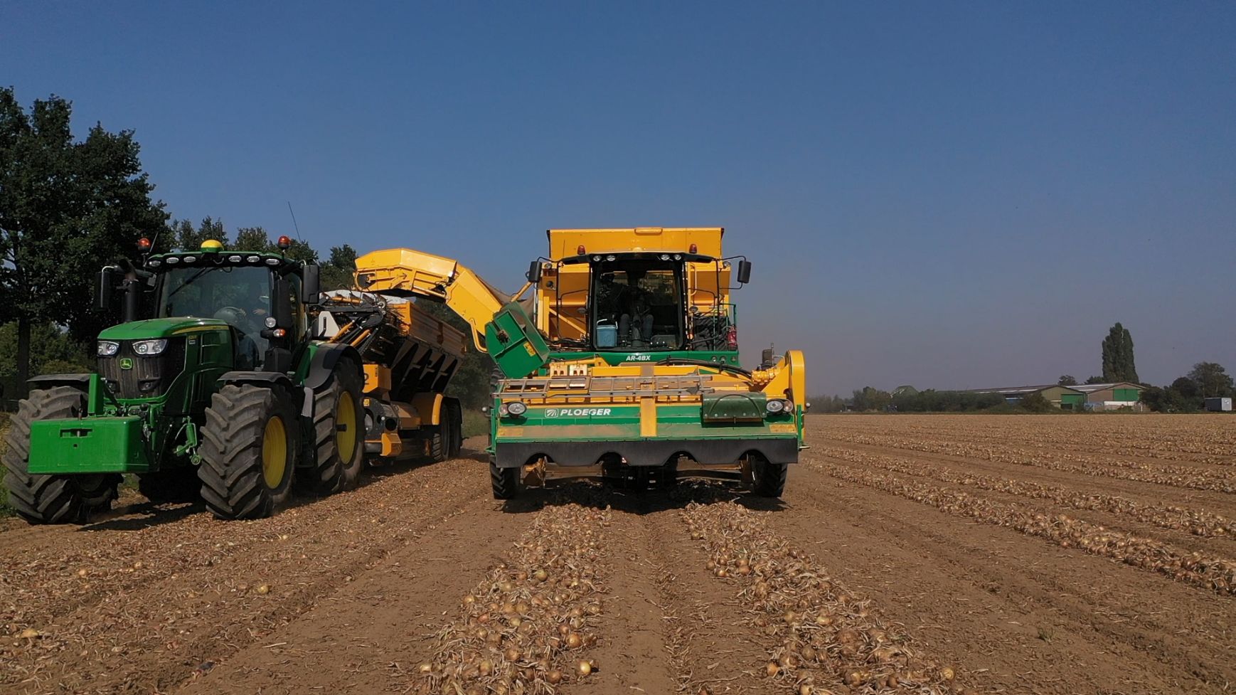 Loon- en akkerbouwbedrijf van Varik met de Ploeger AR-4BX in de uienoogst. De Brettmeister-overlaadwagen zorgt voor het transport van de uien naar de kipwagens.