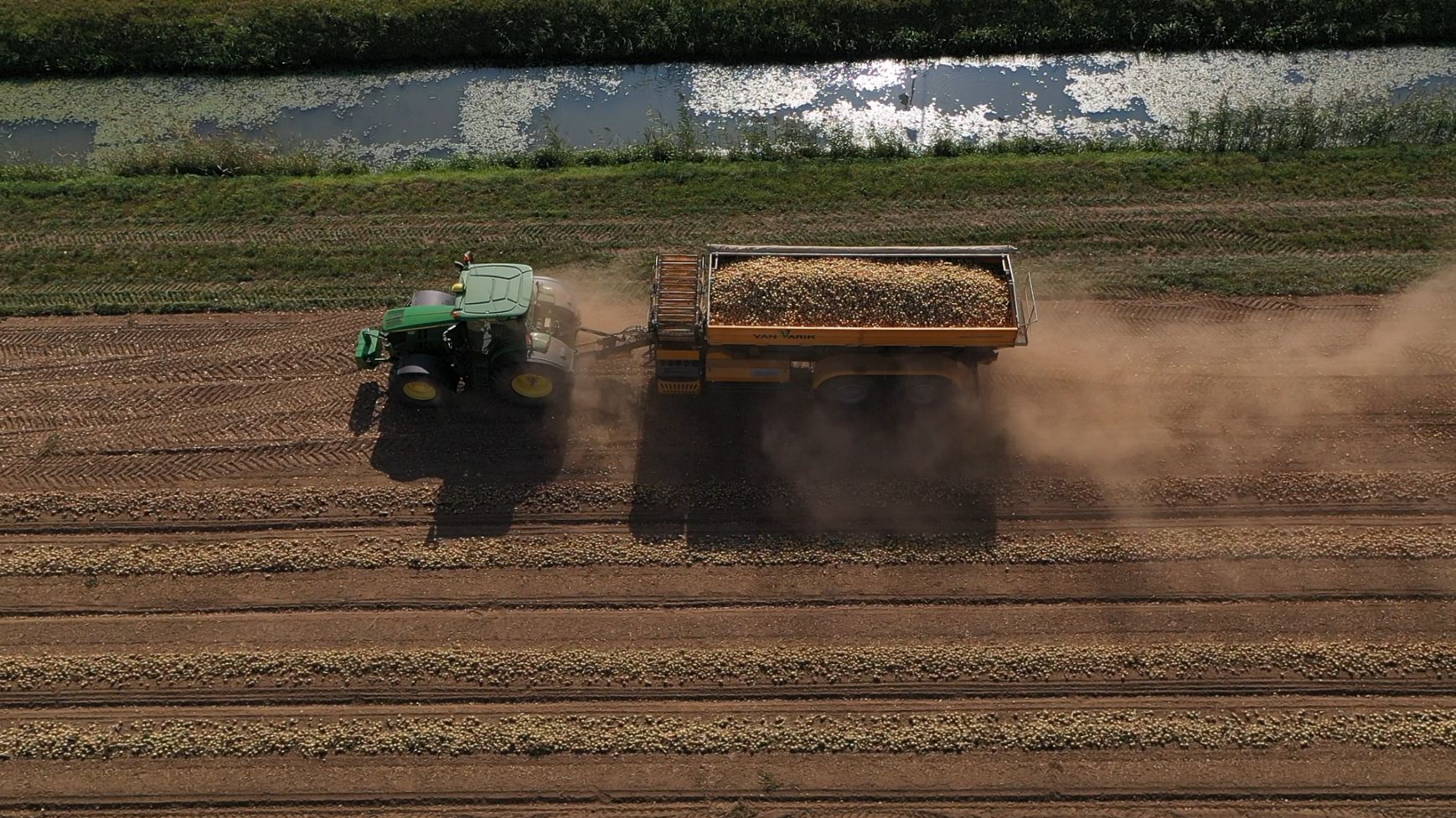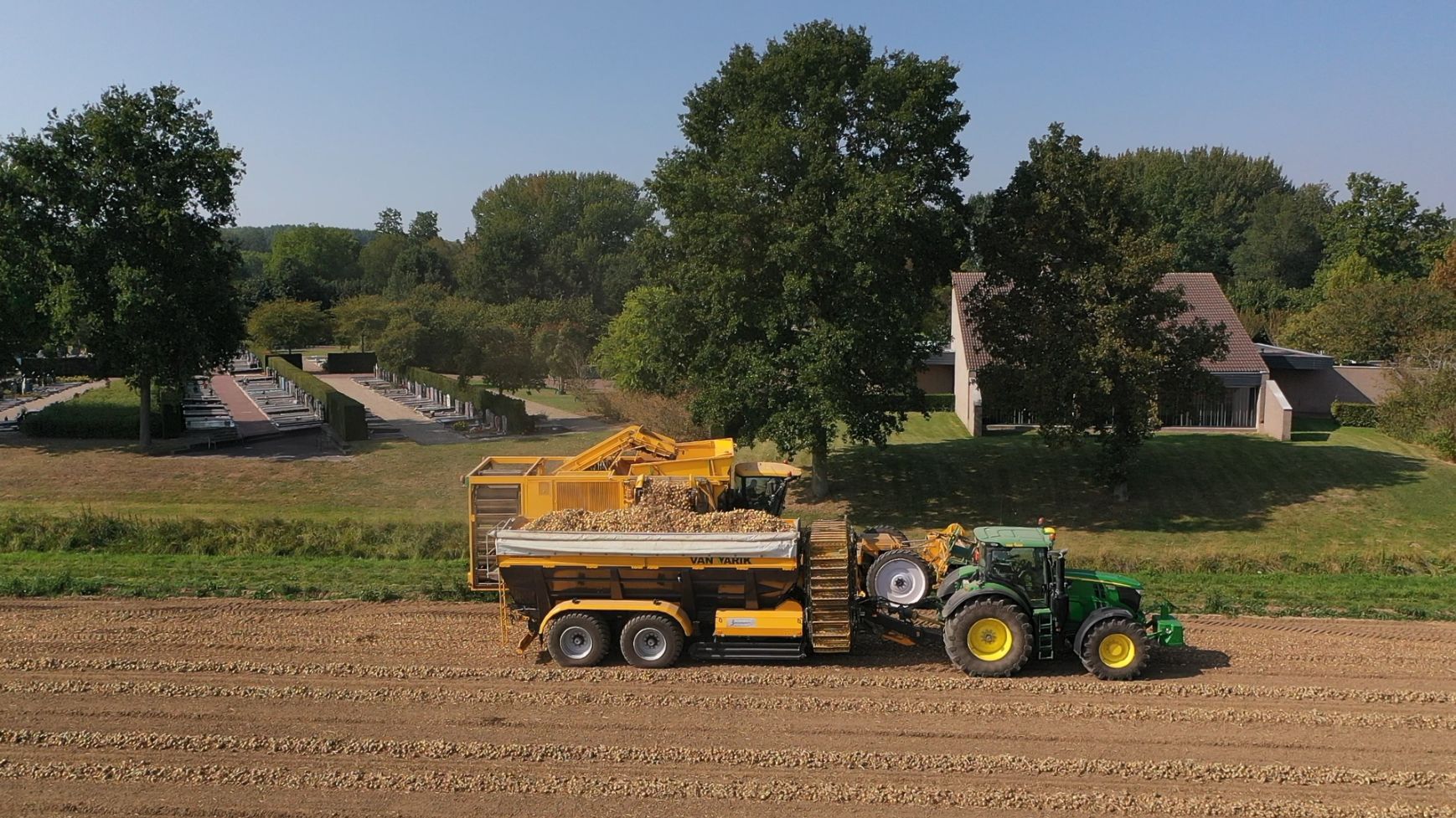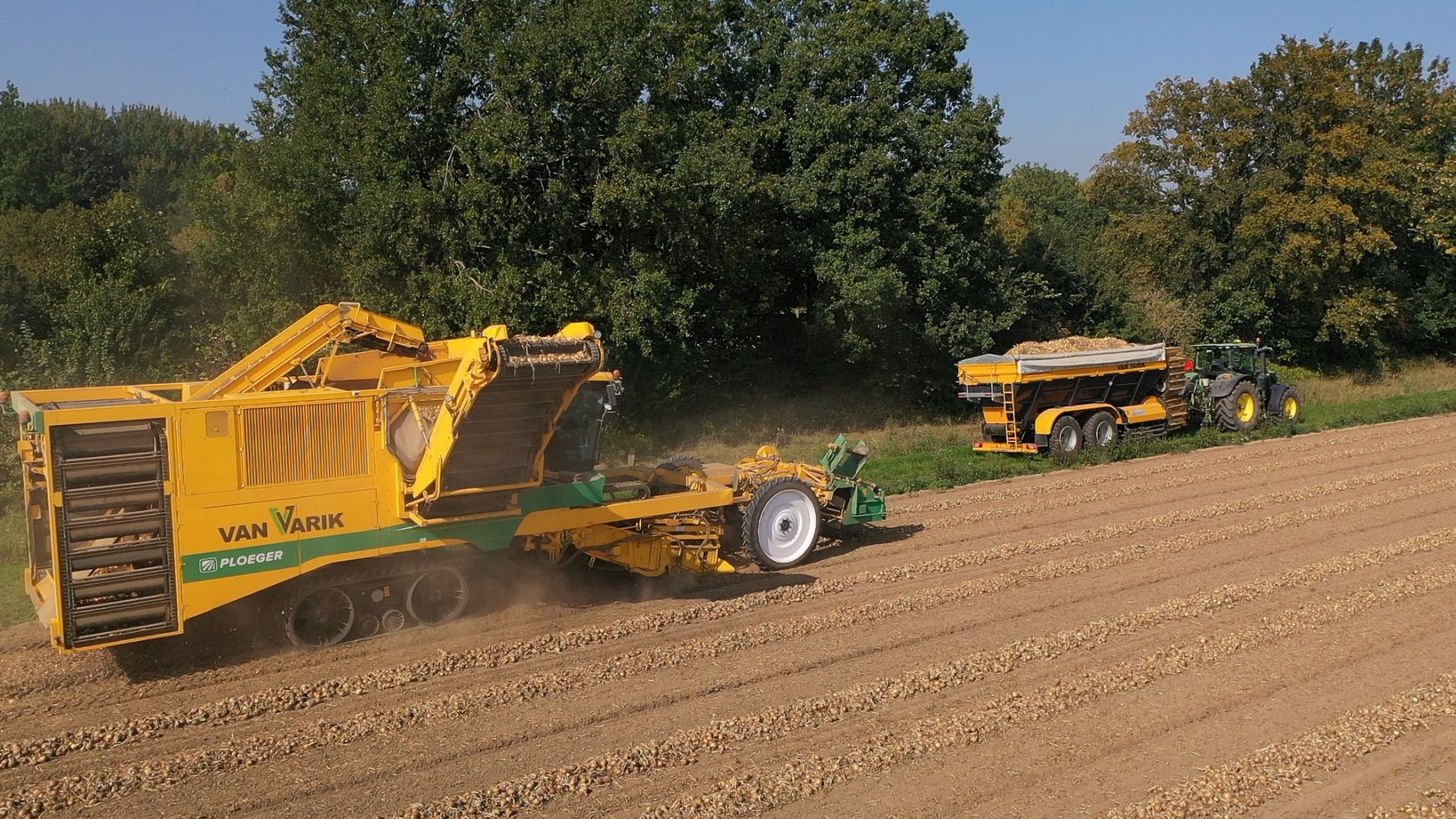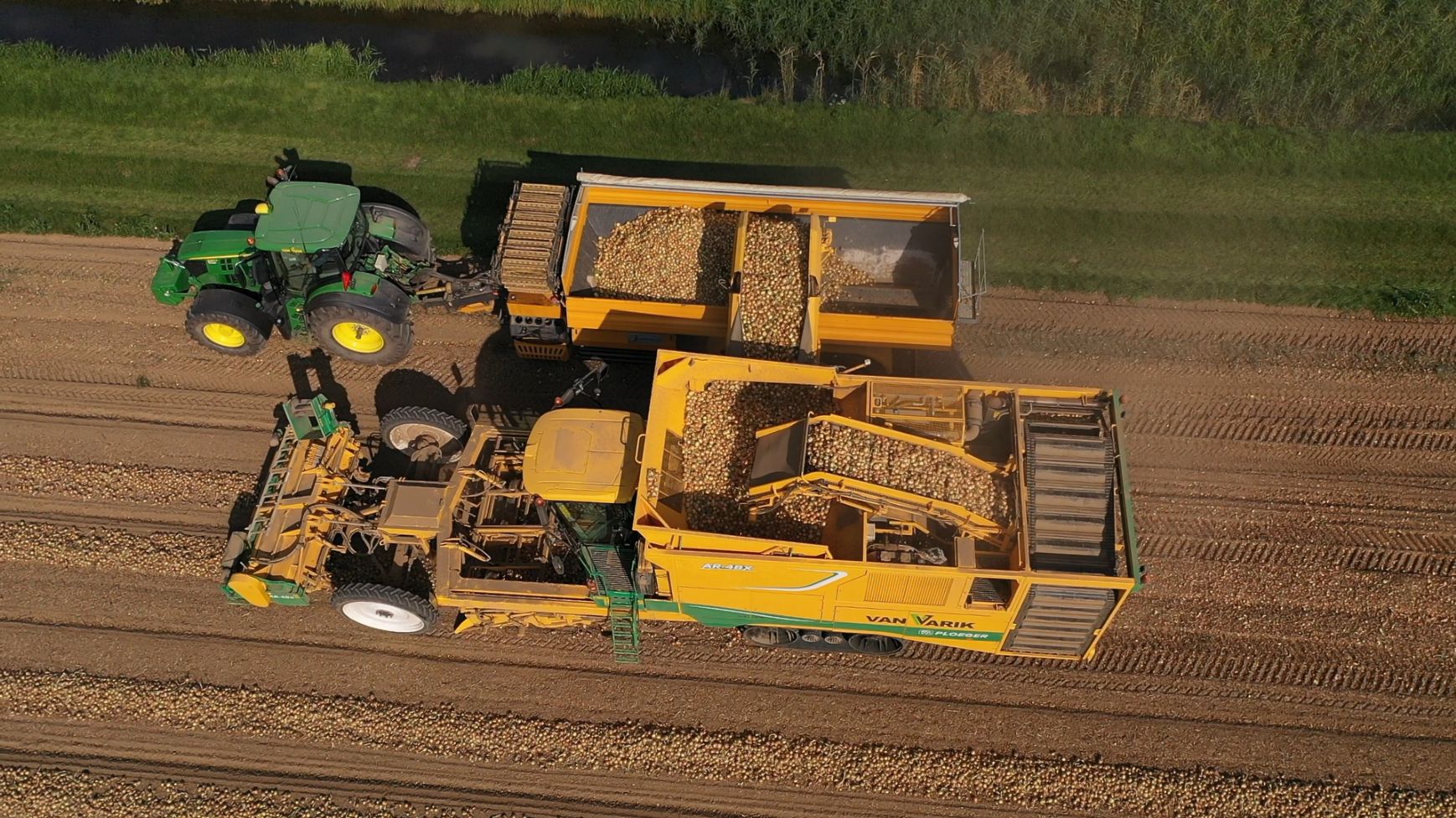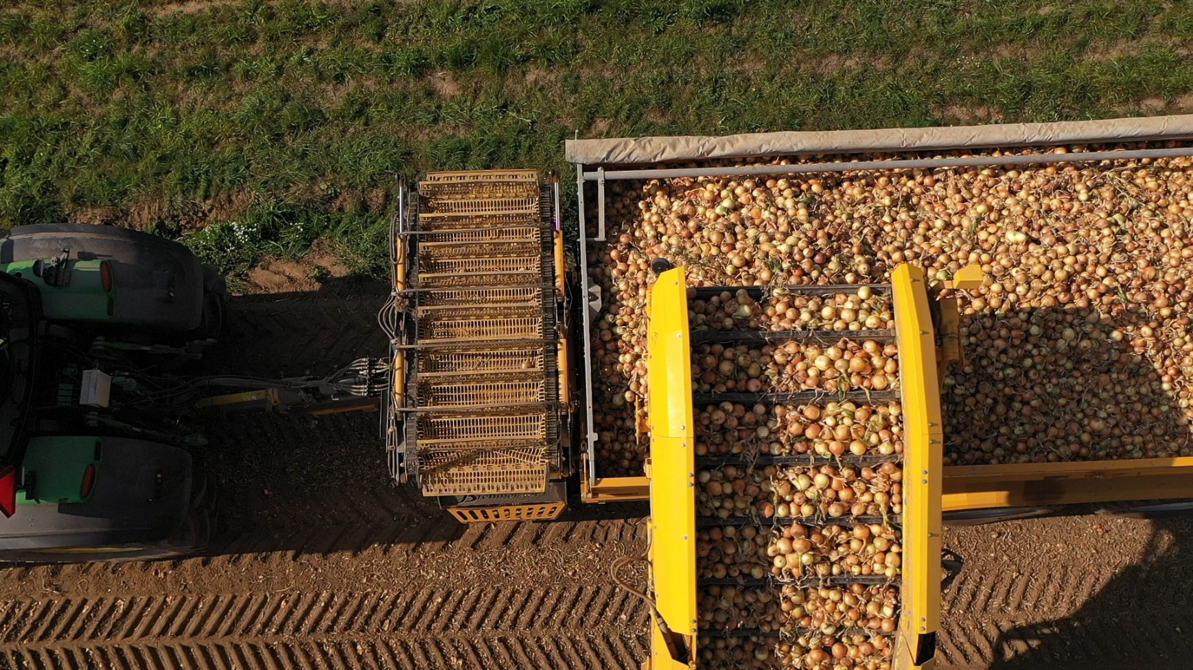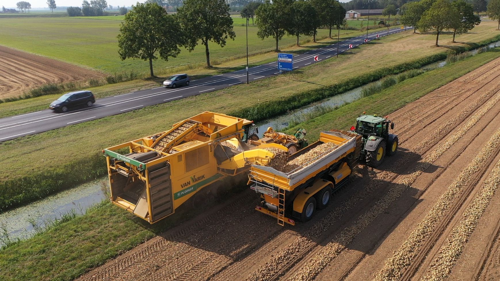 Loon- en akkerbouwbedrijf van Varik met de Ploeger AR-4BX in de uienoogst. De Brettmeister-overlaadwagen zorgt voor het transport van de uien naar de kipwagens.