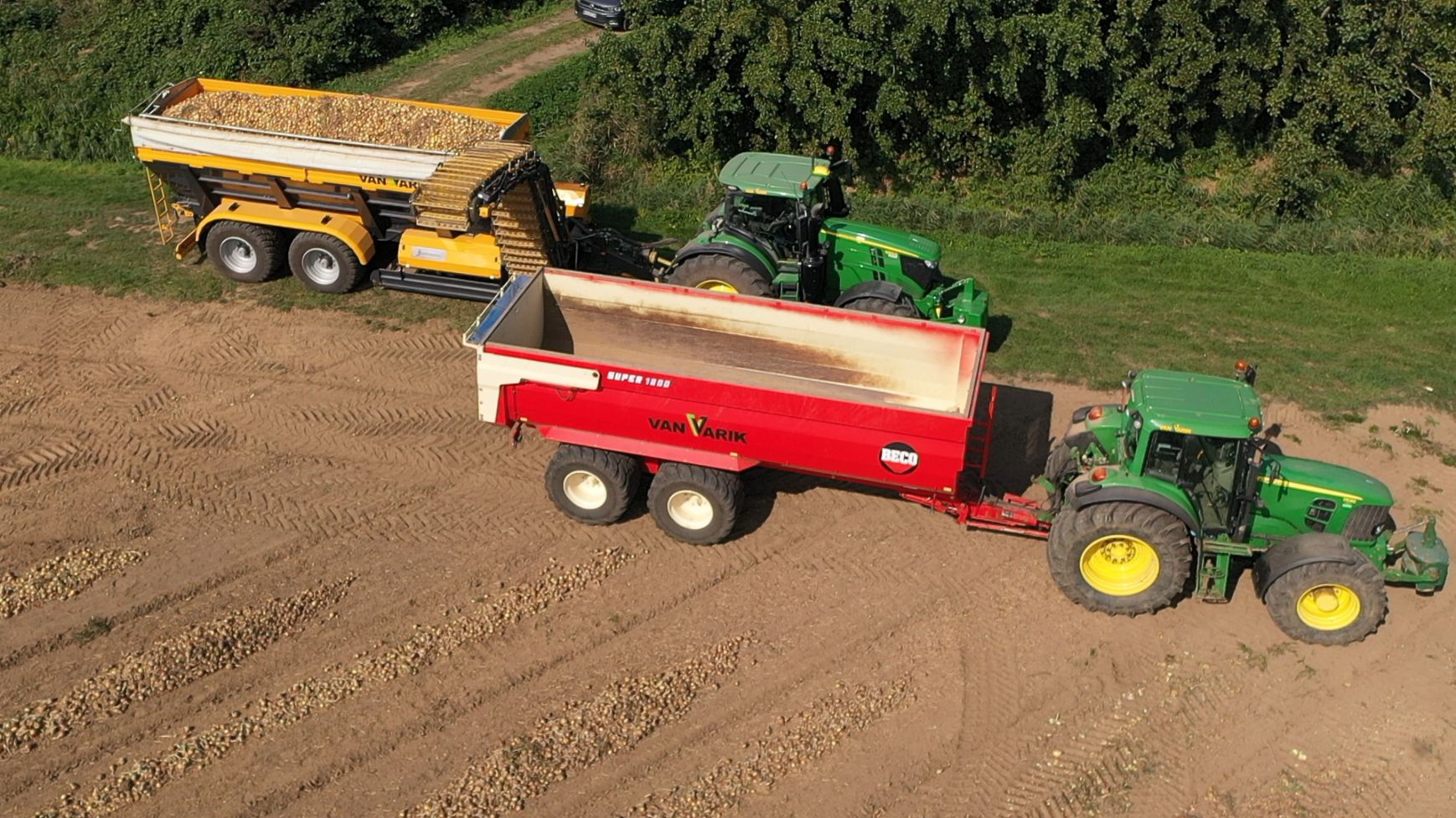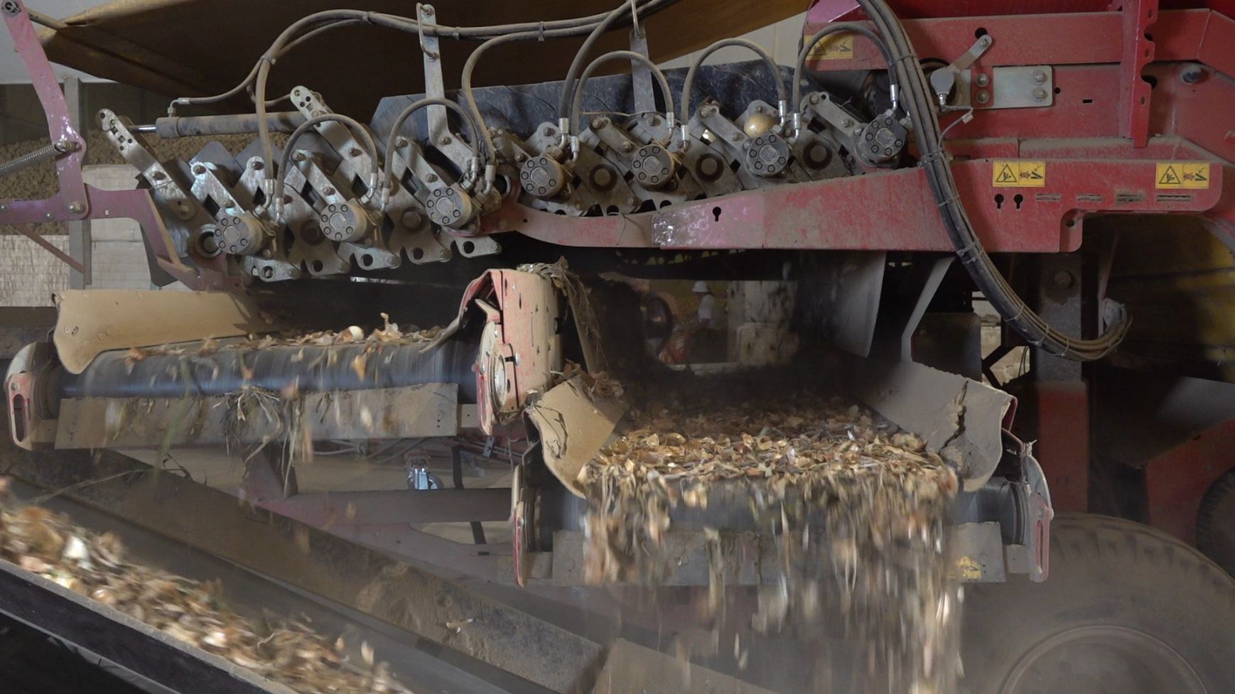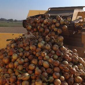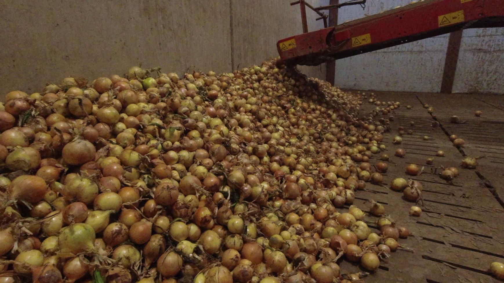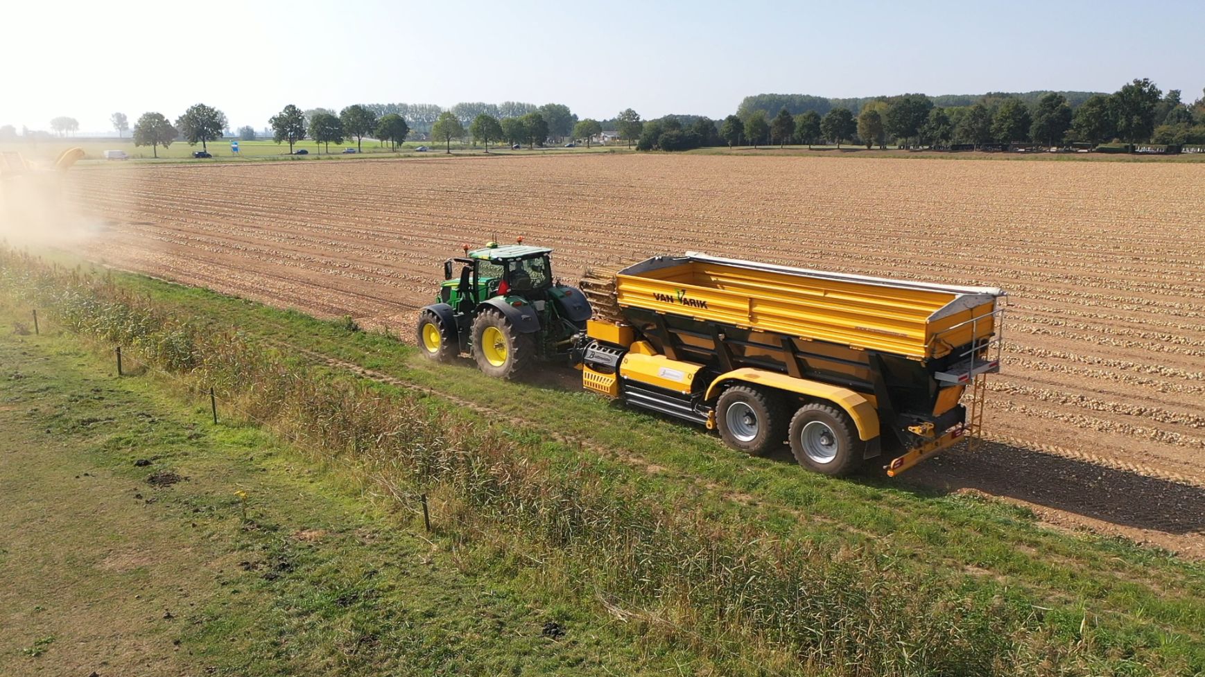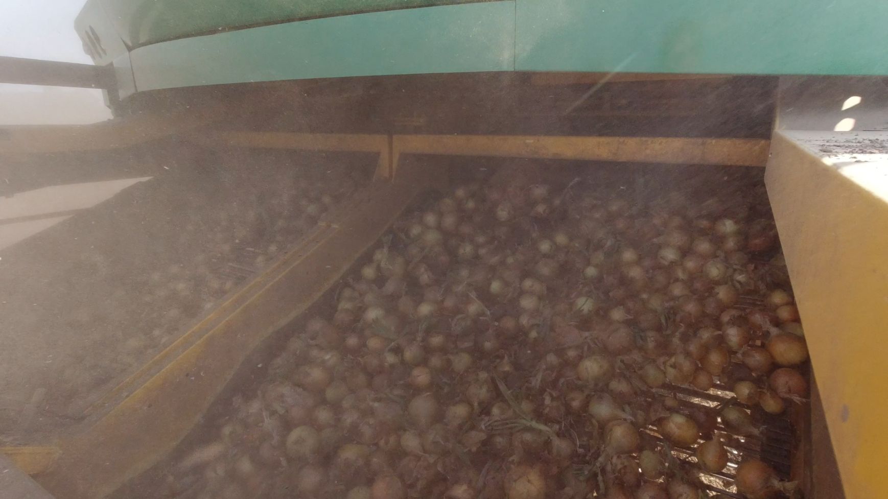 Loon- en akkerbouwbedrijf van Varik met de Ploeger AR-4BX in de uienoogst. De Brettmeister-overlaadwagen zorgt voor het transport van de uien naar de kipwagens.