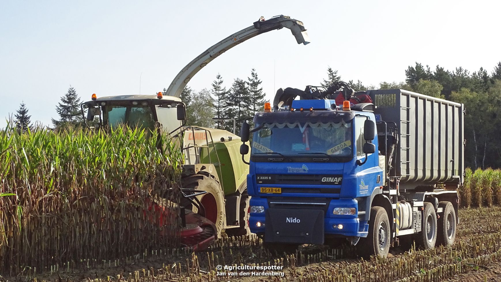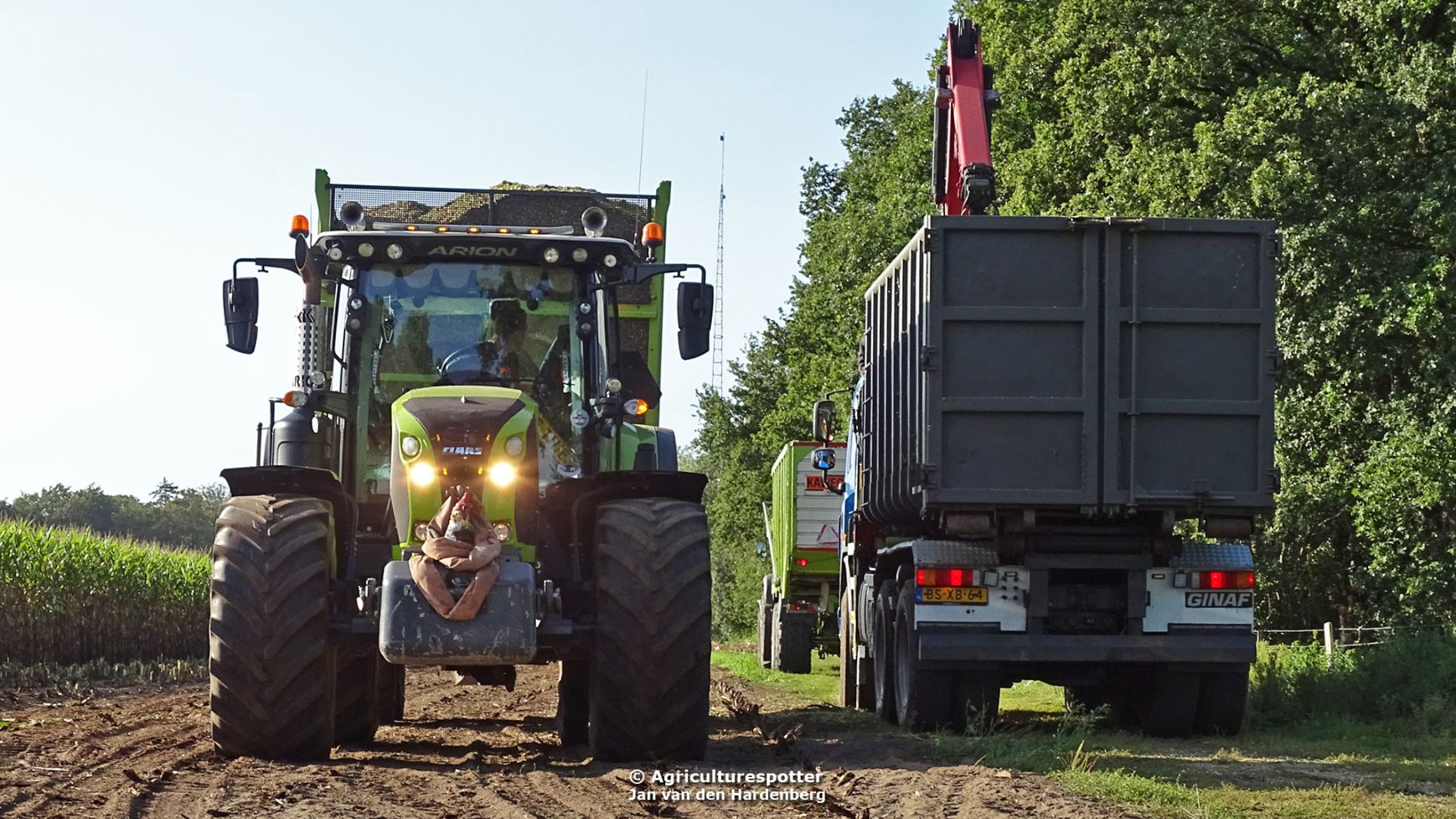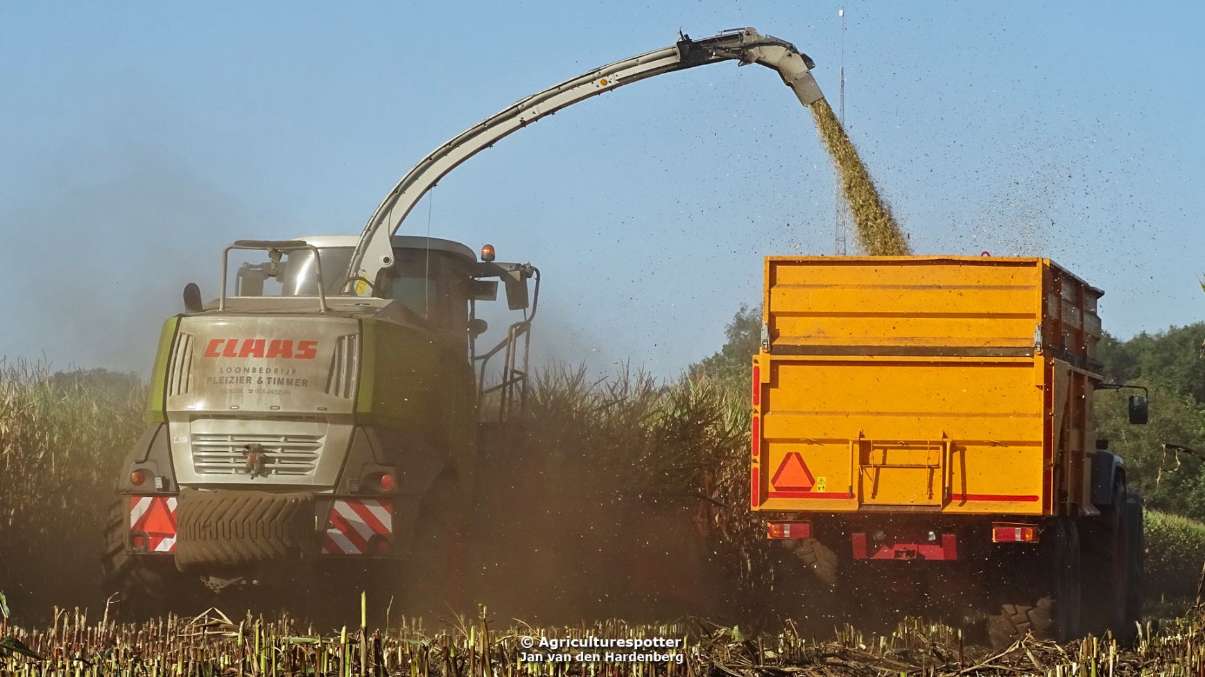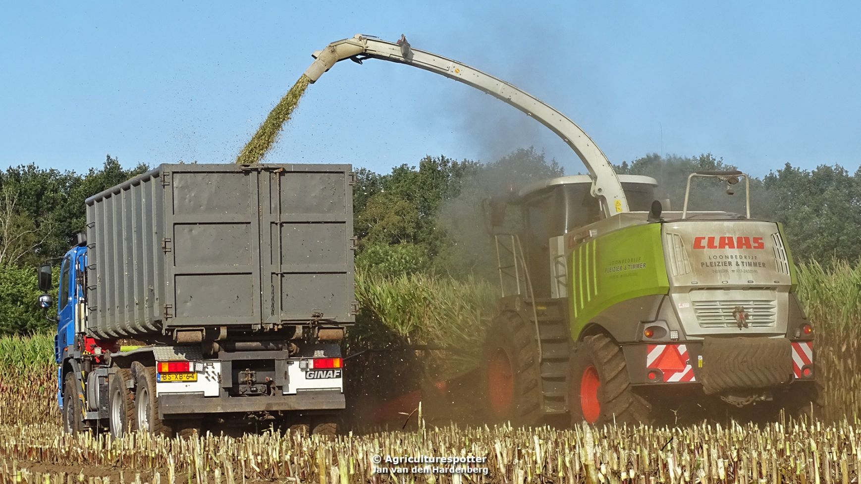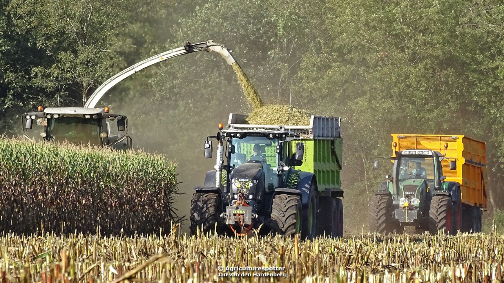 Loonbedrijf Pleizier & Timmer uit Nijkerk al vroeg in de ochtend aan het mais hakselen in Meerveld en Uddel met een Claas Jaguar 965 en een Kemper 460 Plus (8-rijer). Het grote transport werd gedaan met diverse combinaties zoals een Claas Axion 850 Black Edition, een Ginaf-truck, Case IH Puma 225, Fendt Favorit 916 Vario en diverse Claas-tractoren met Kaweco-, Jaco- en Veenhuis-silagewagens.