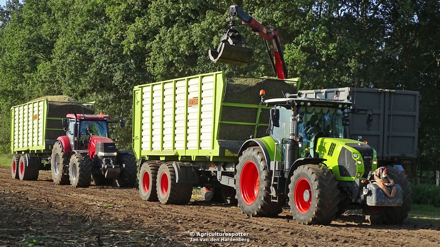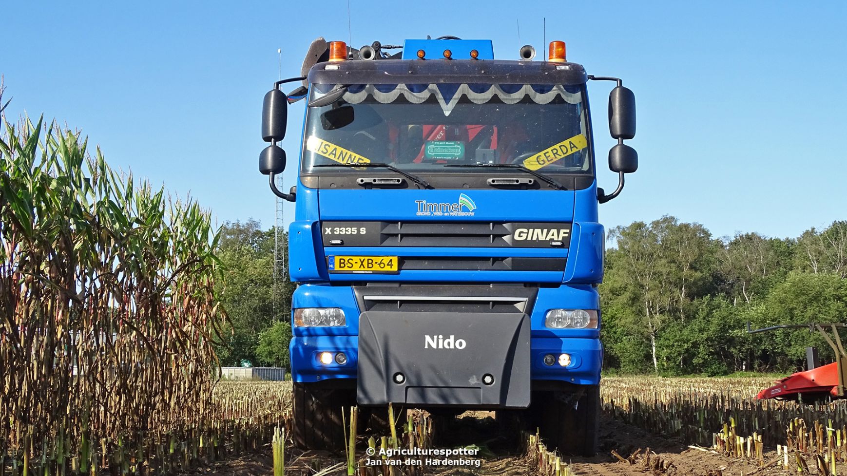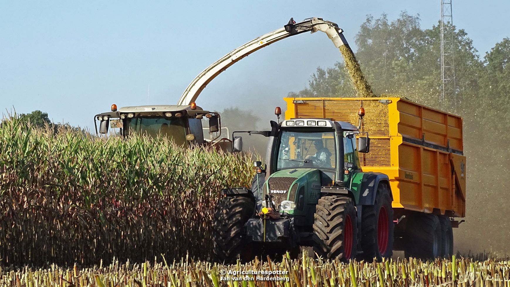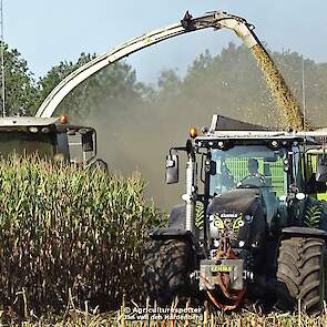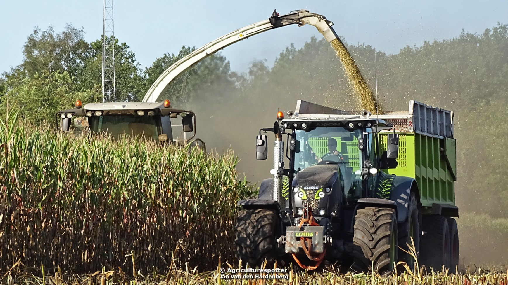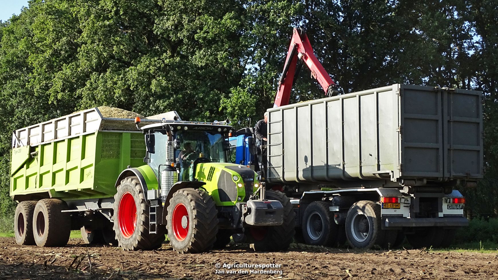 Loonbedrijf Pleizier & Timmer uit Nijkerk al vroeg in de ochtend aan het mais hakselen in Meerveld en Uddel met een Claas Jaguar 965 en een Kemper 460 Plus (8-rijer). Het grote transport werd gedaan met diverse combinaties zoals een Claas Axion 850 Black Edition, een Ginaf-truck, Case IH Puma 225, Fendt Favorit 916 Vario en diverse Claas-tractoren met Kaweco-, Jaco- en Veenhuis-silagewagens.