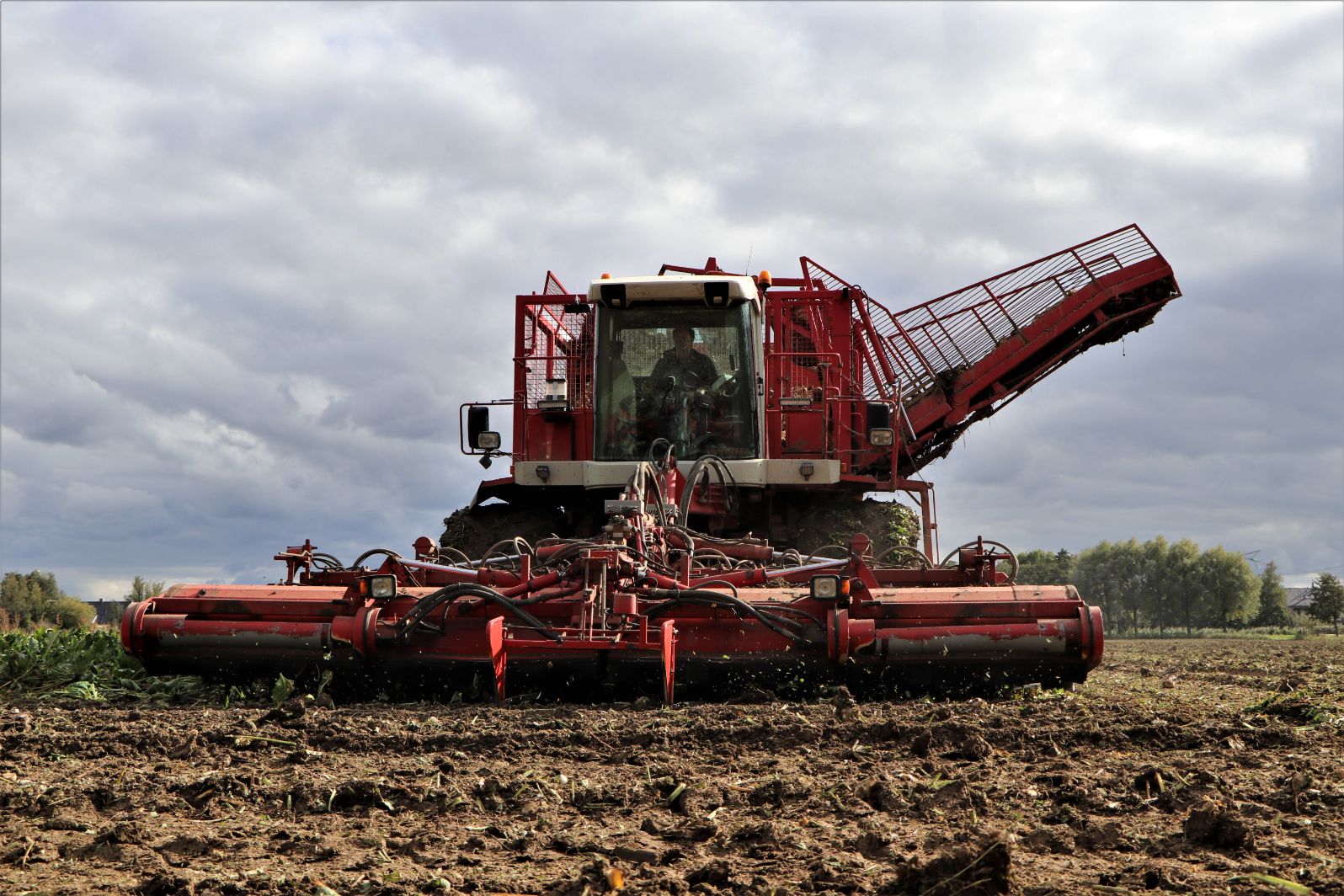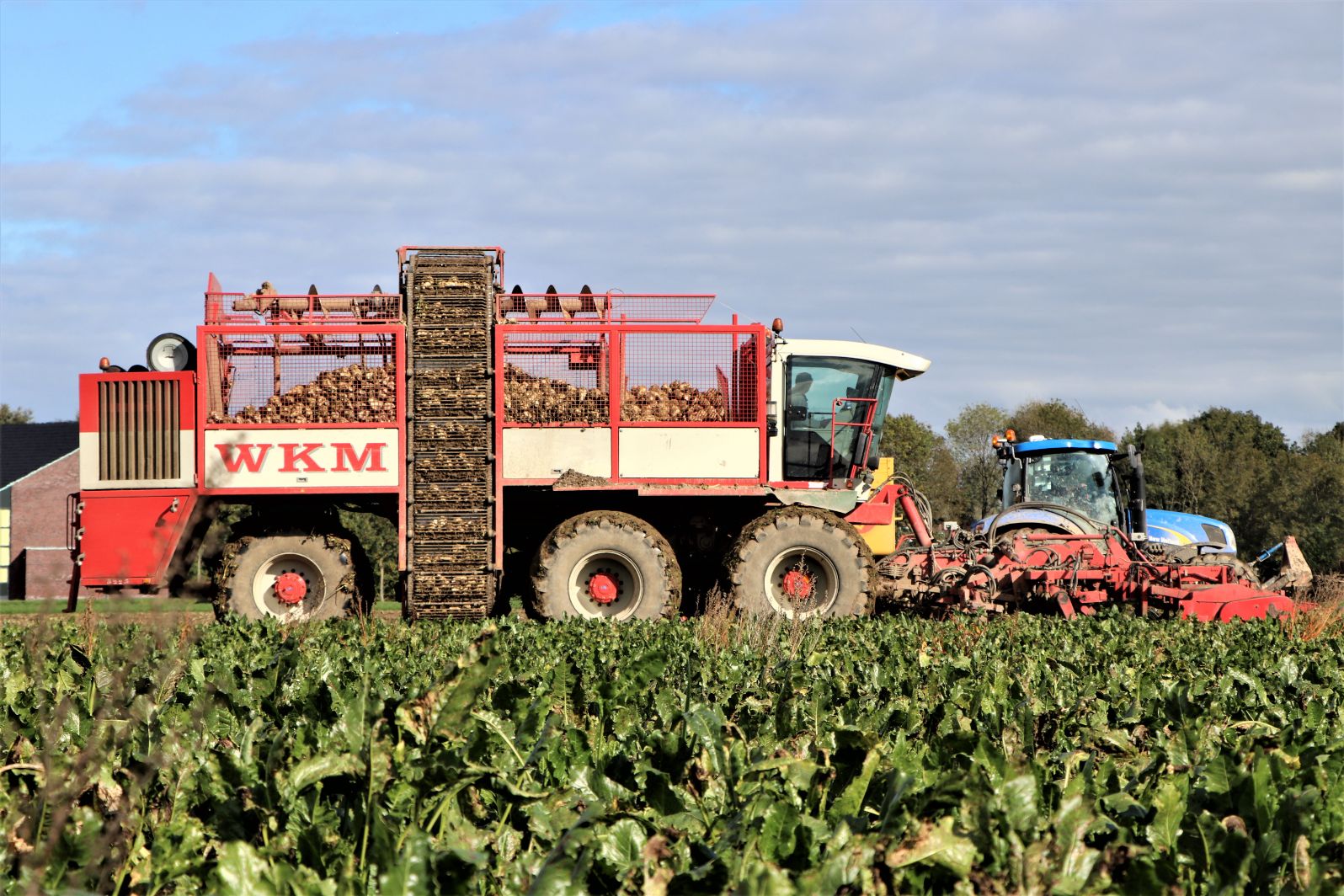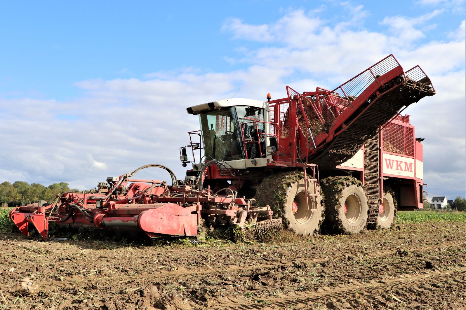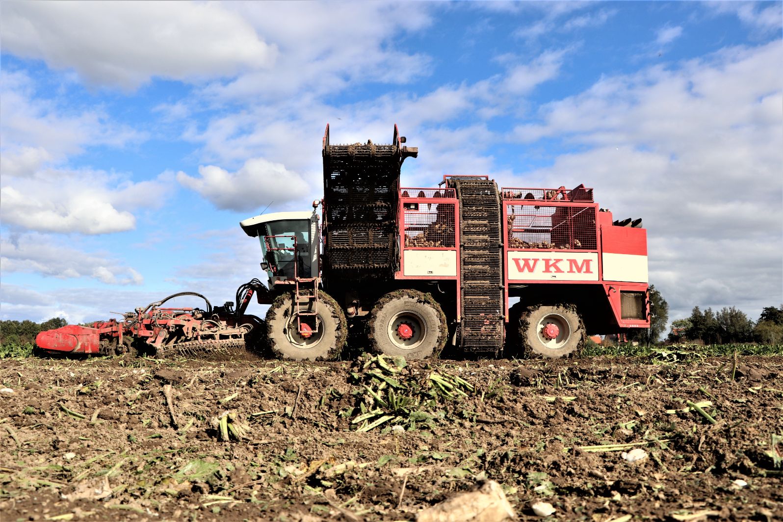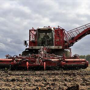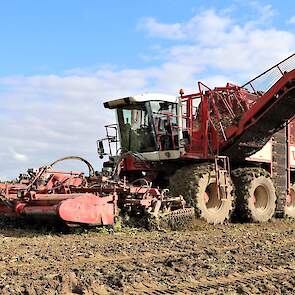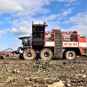 De WKM drie-asser bietenrooier aan het twaalf rijen bieten tegelijk oogsten aan de sportlaan in Maasdam.
