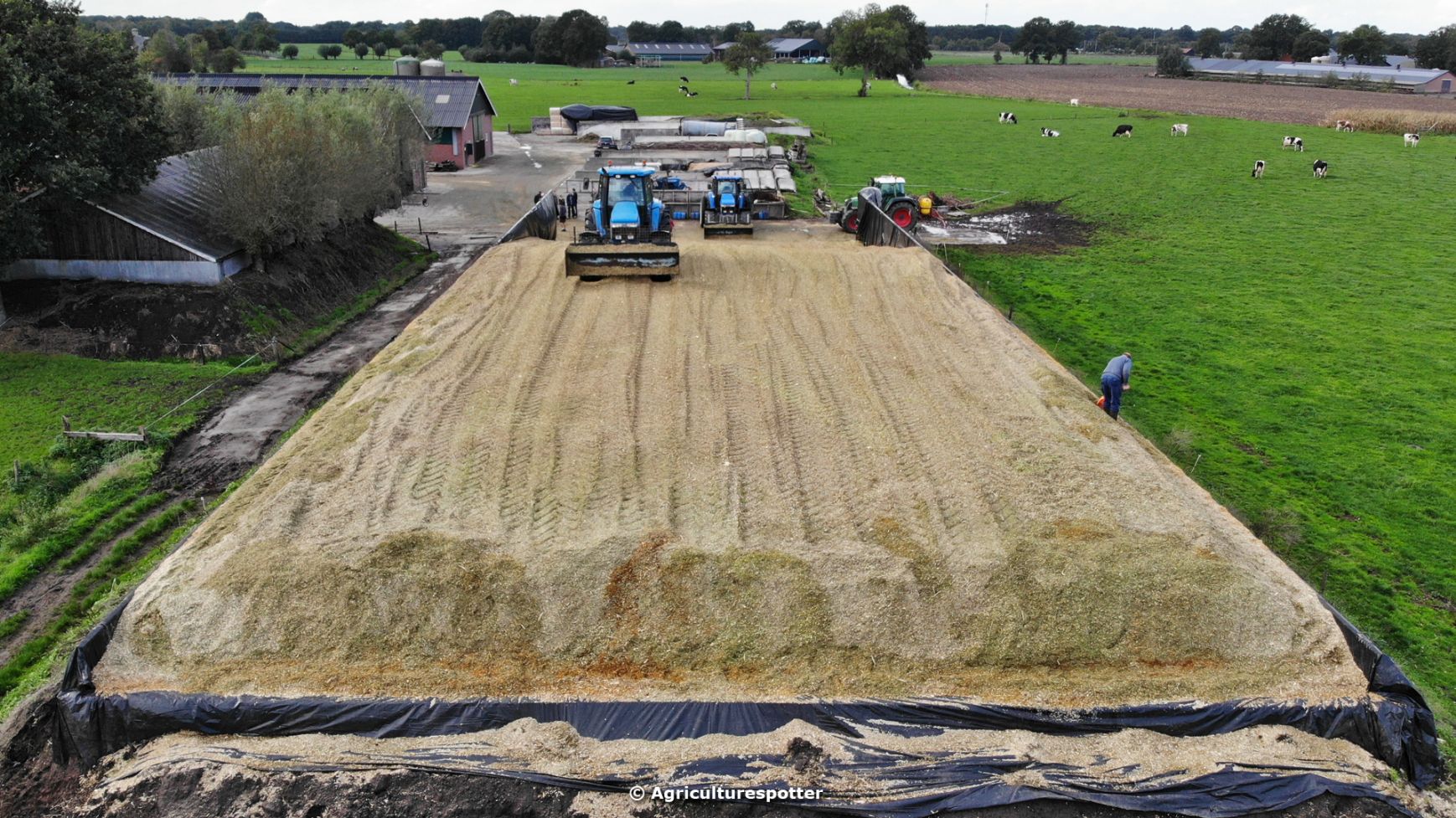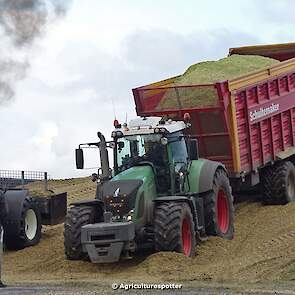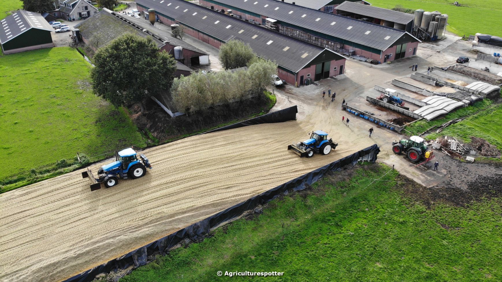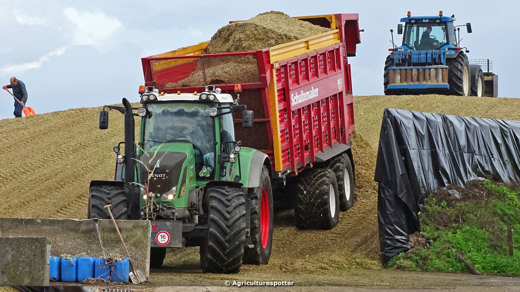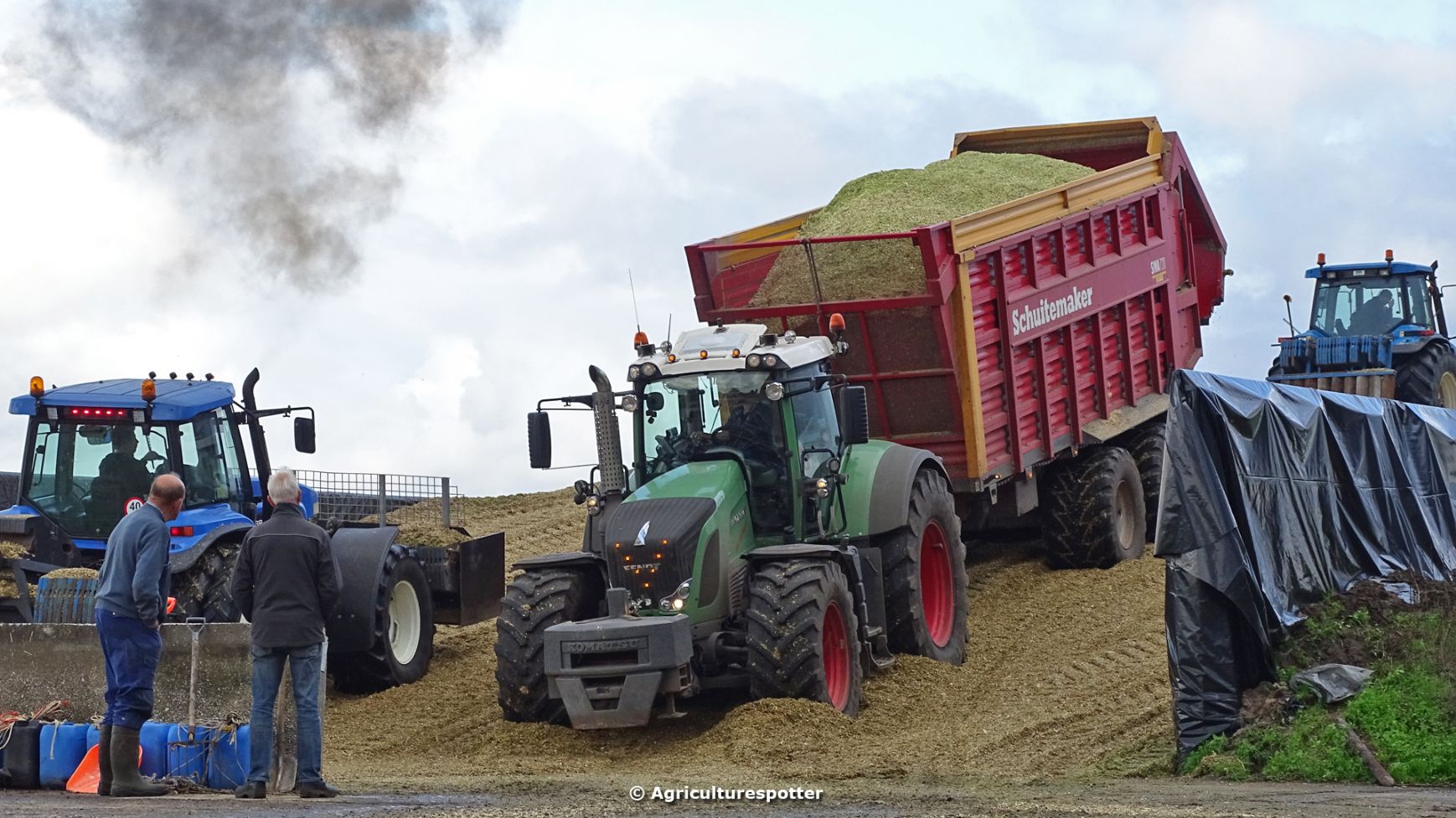 Mais hakselen en inkuilen in Terschuur (GD) met een Ford New Holland 8870 en een Ford New Holland 8670 op de kuil. De mais werd gehakseld met een John Deere 8600i en getransporteerd met een Fendt 930 Vario en een Fendt 828 Vario met Schuitemaker Siwa 720-silagewagens van loonbedrijf Gebr. Blankespoor uit Harskamp (GD).