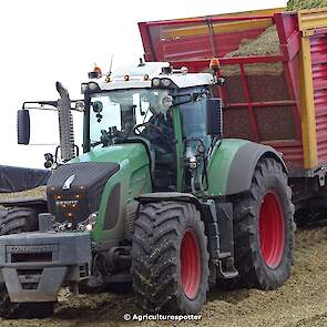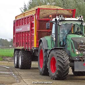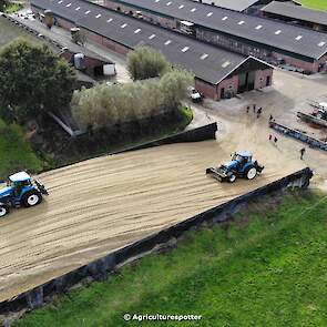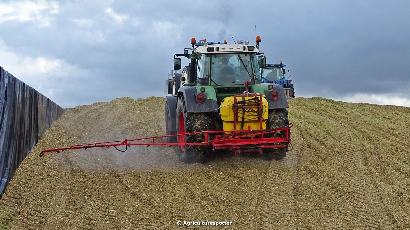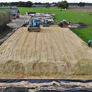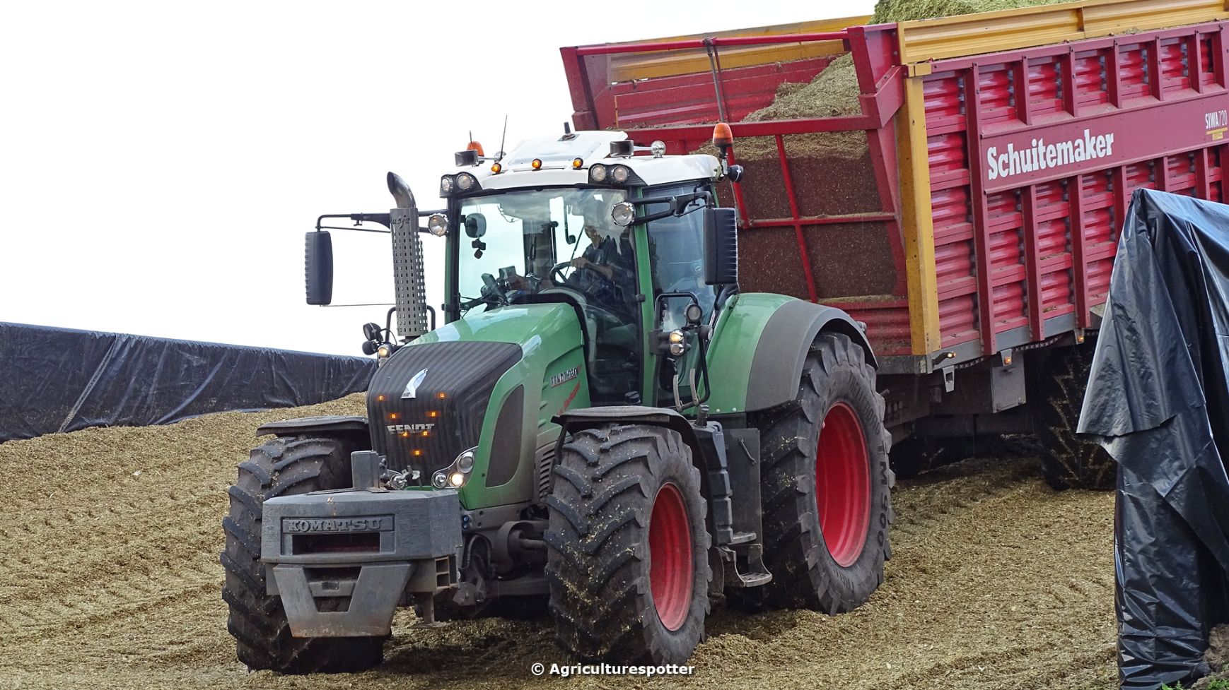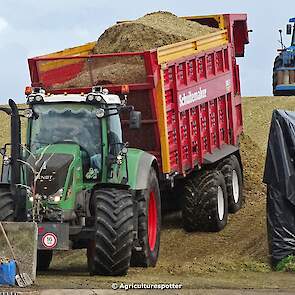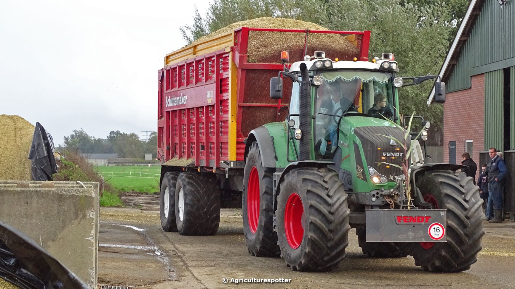 Mais hakselen en inkuilen in Terschuur (GD) met een Ford New Holland 8870 en een Ford New Holland 8670 op de kuil. De mais werd gehakseld met een John Deere 8600i en getransporteerd met een Fendt 930 Vario en een Fendt 828 Vario met Schuitemaker Siwa 720-silagewagens van loonbedrijf Gebr. Blankespoor uit Harskamp (GD).