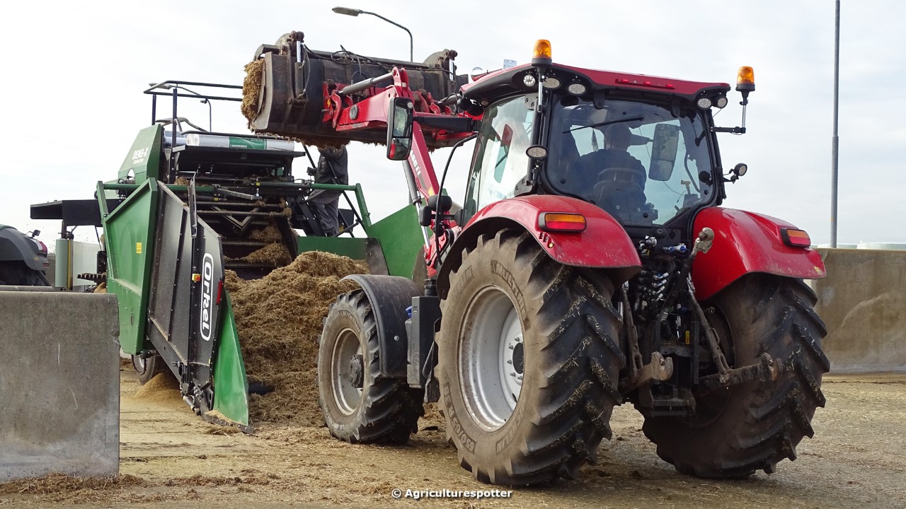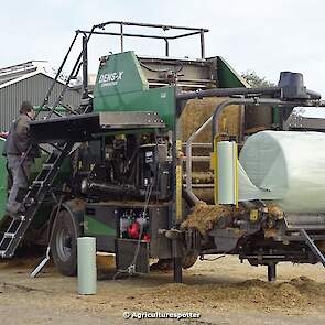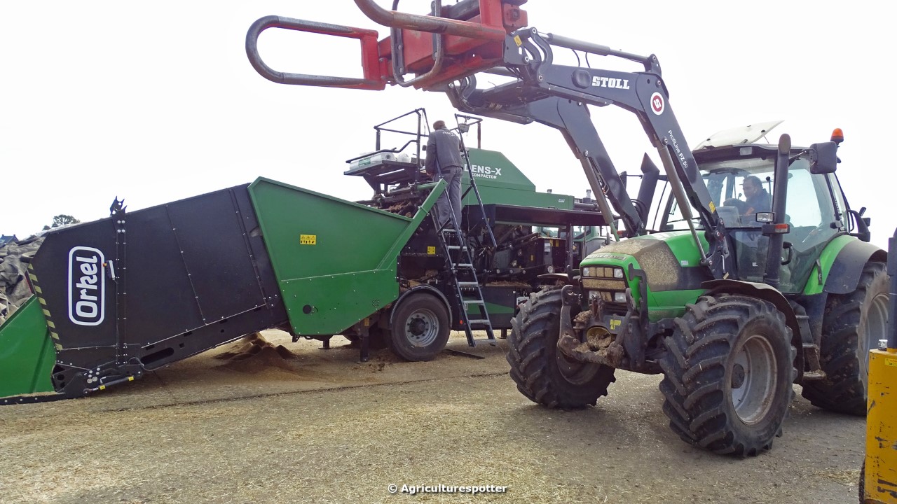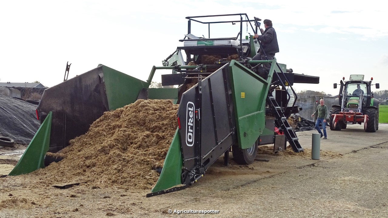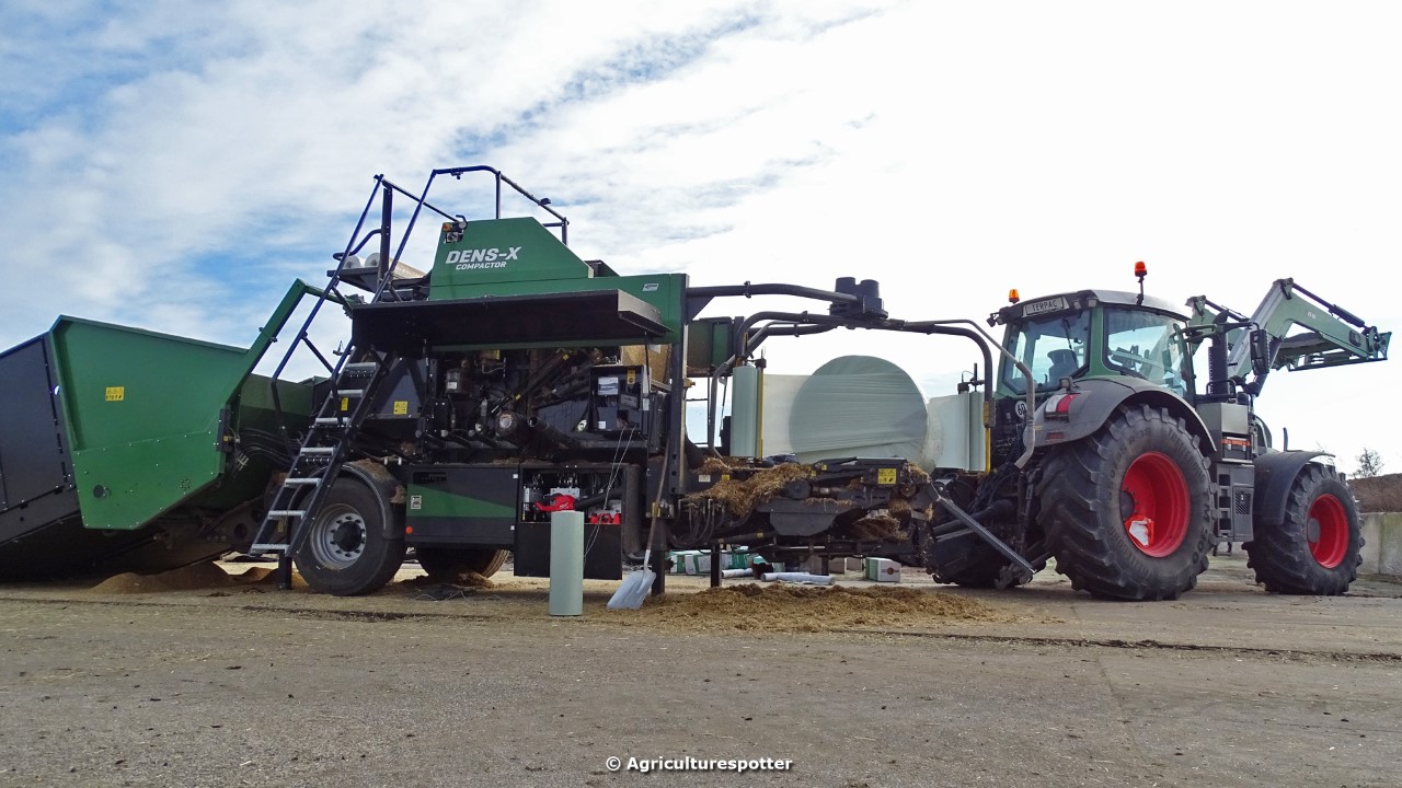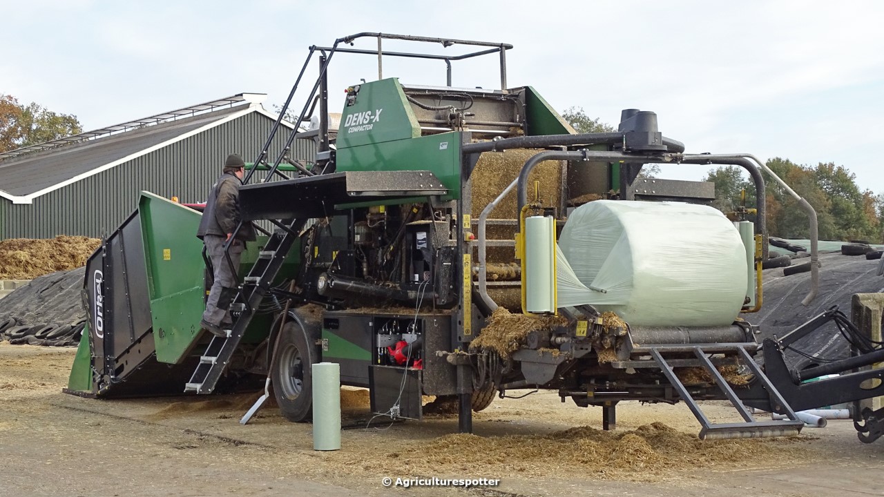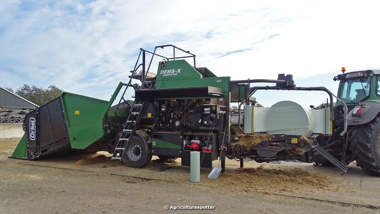 Mengbalen persen voor ABZ Diervoeding met een Orkel Dens-X compactor van Agrar Services Termaat uit Putten bij melkveehouder V.O.F. Van Heerikhuize in Lunteren (GD). De grote voorraadbunker werd gevuld met een Case IH Maxxum 125 (Kees Steenbeek) en het verplaatsen van de balen werd gedaan met een Deutz-Fahr Agrotron (Jan van Heerikhuize). De Orkel Dens-X compactor werd aangedreven door een Fendt 828 Vario.