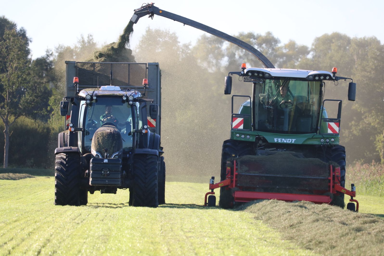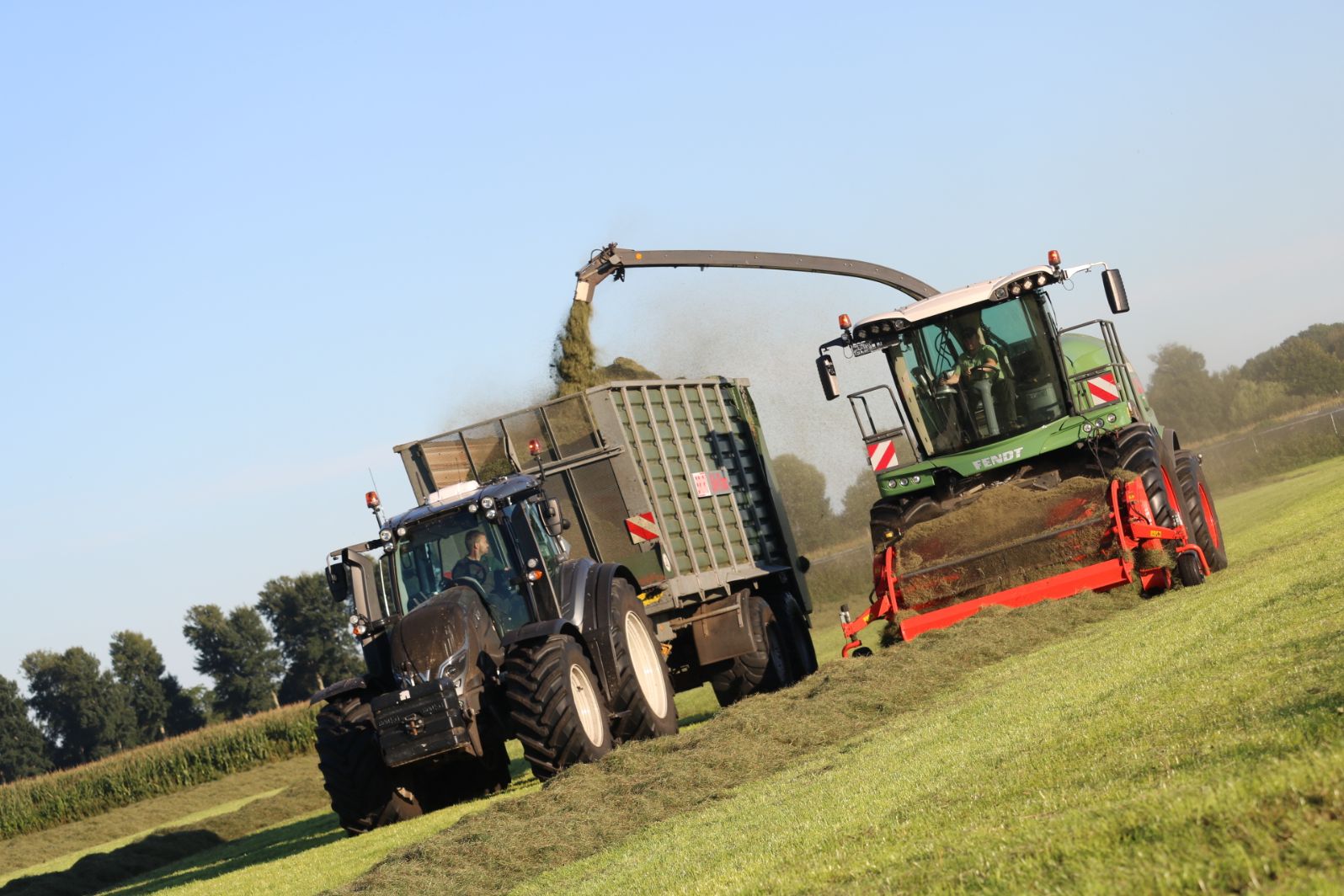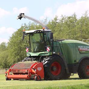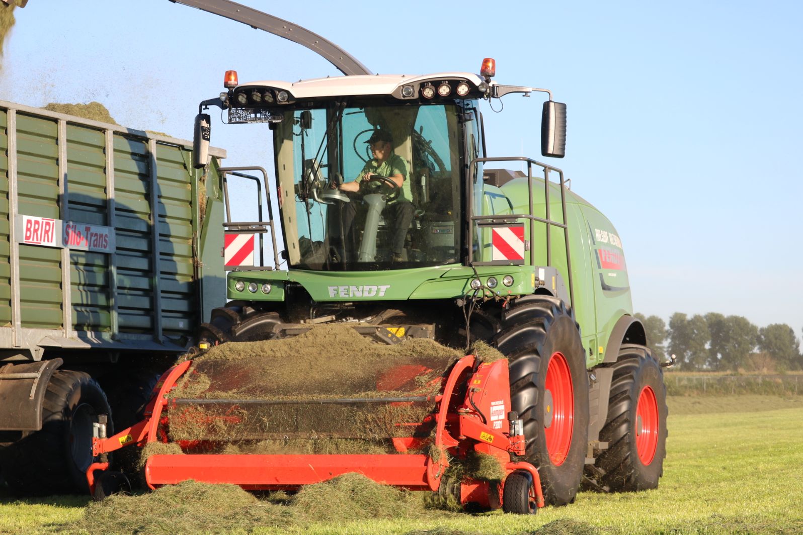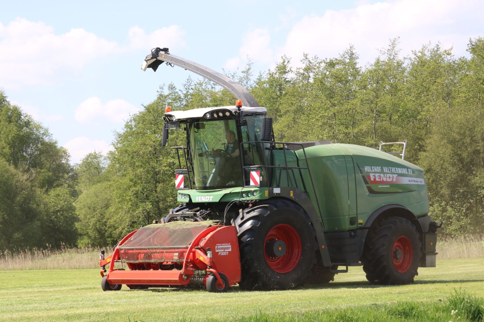 Loonbedrijf Hulshof uit Valthermond (DR) met de Fendt aan het gras hakselen.