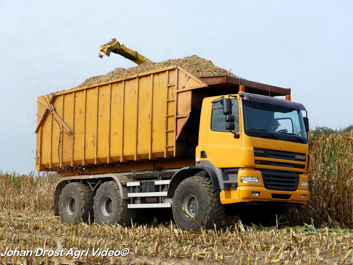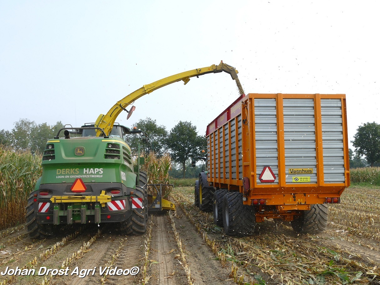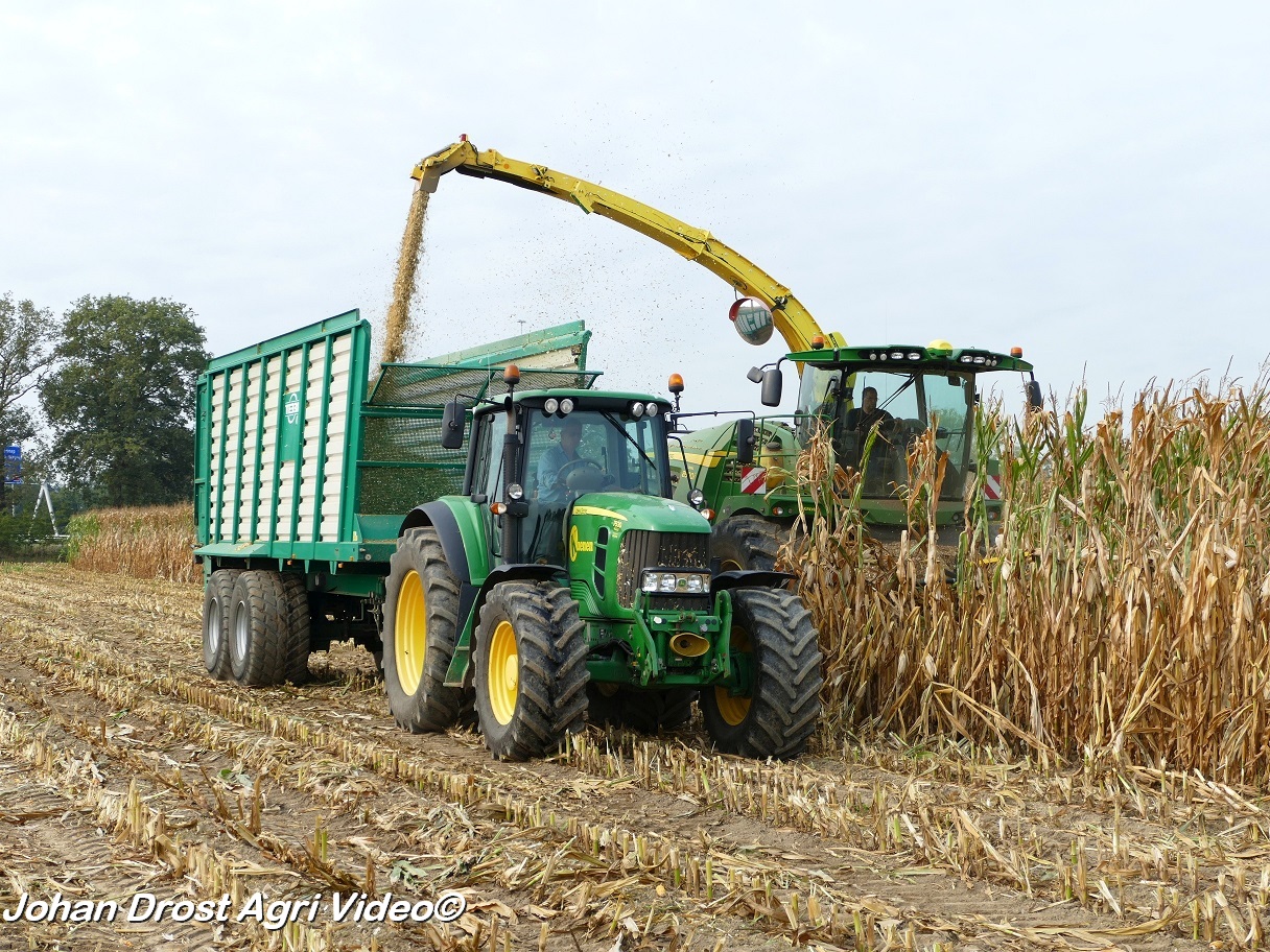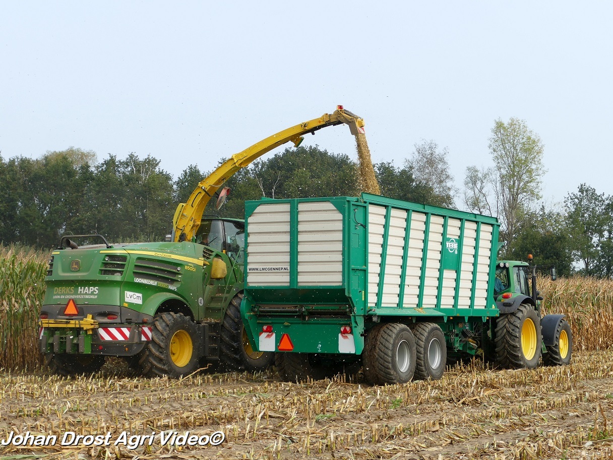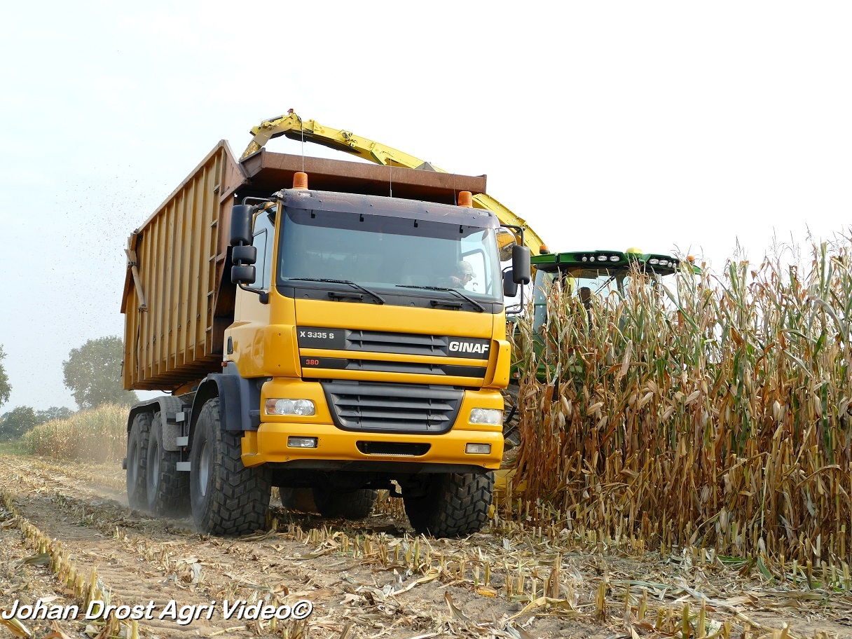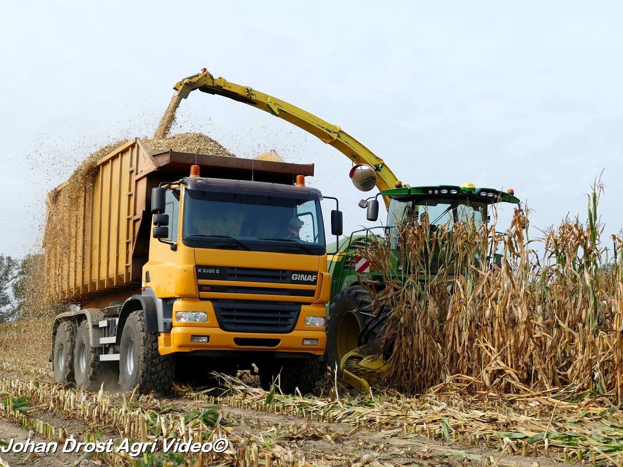 LvCm loonwerkcombinatie uit Haps - Overloon aan het mais hakselen met een John Deere 8500i en een John Deere 6145R met Veenhuis Super Silagewagen, John Deere 7530 Premium met Tebbe en een Ginaf X 3335 S-maistruck.