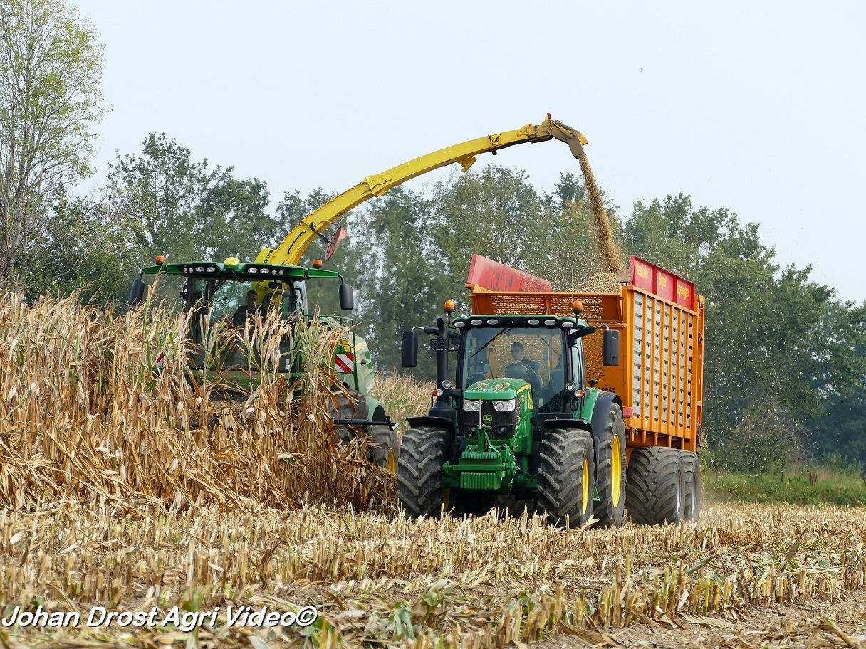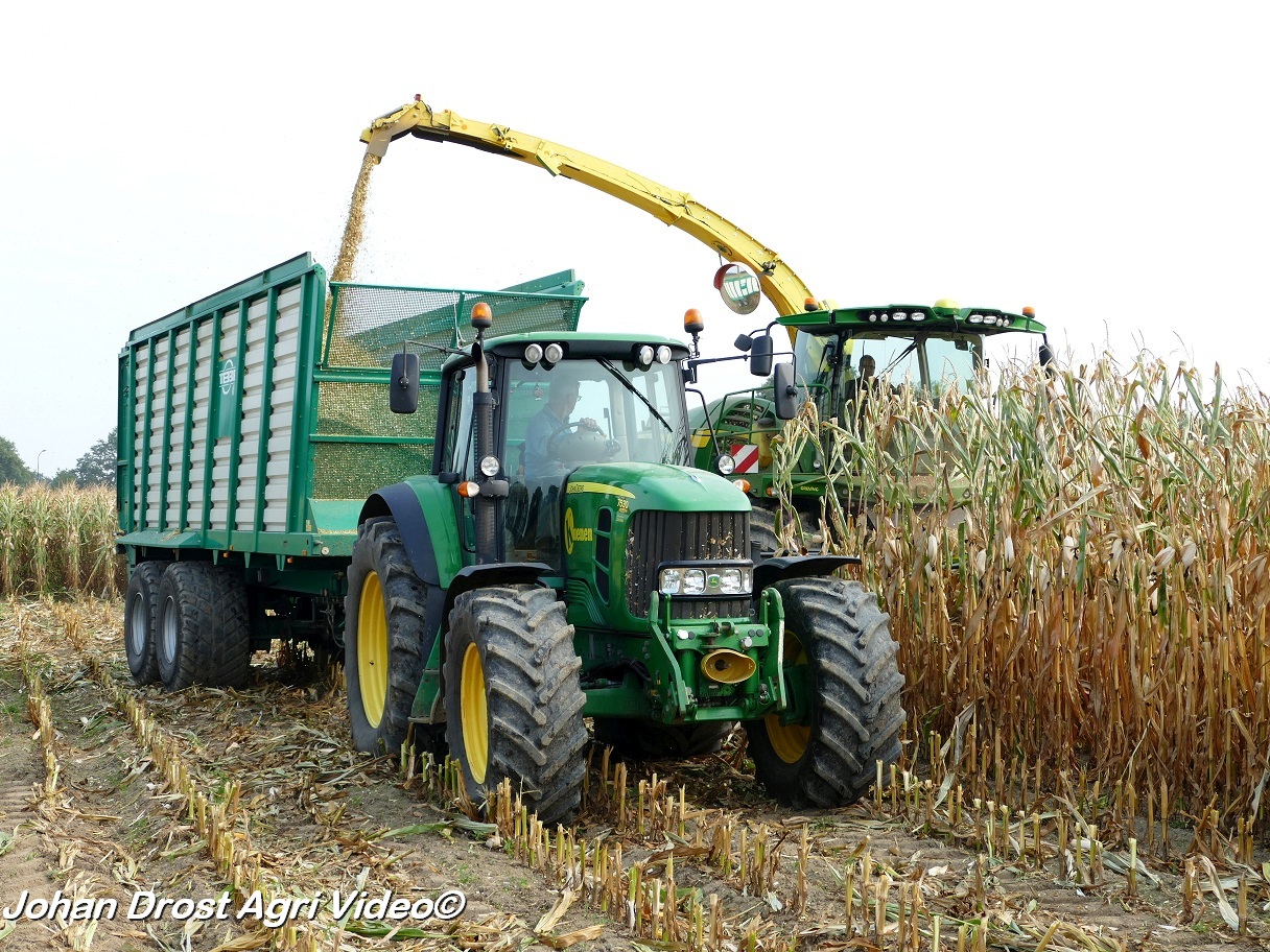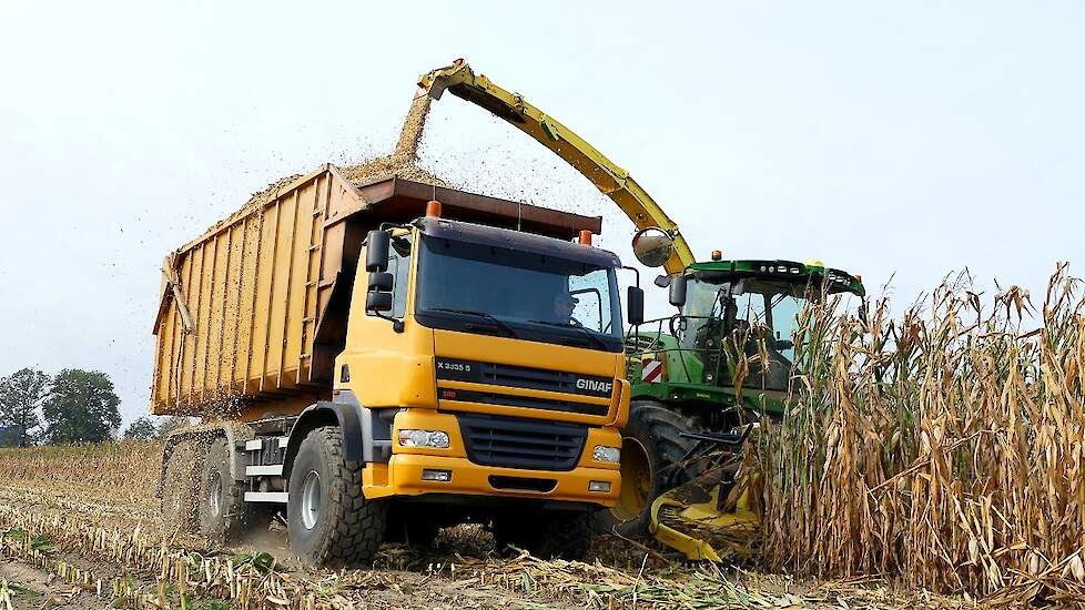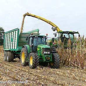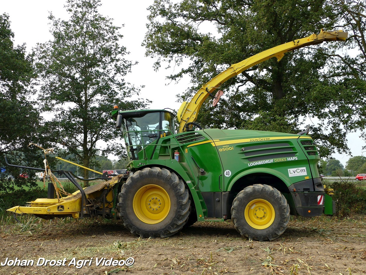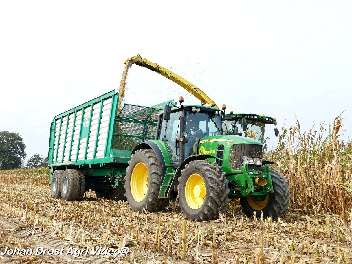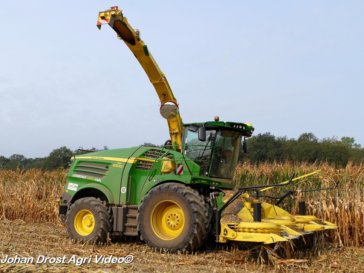 LvCm loonwerkcombinatie uit Haps - Overloon aan het mais hakselen met een John Deere 8500i en een John Deere 6145R met Veenhuis Super Silagewagen, John Deere 7530 Premium met Tebbe en een Ginaf X 3335 S-maistruck.