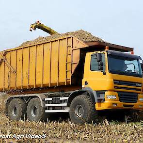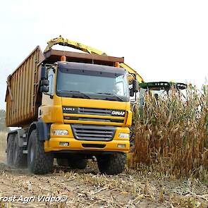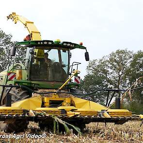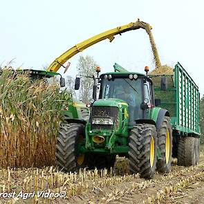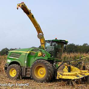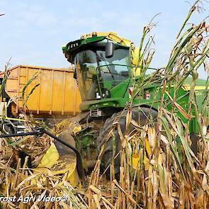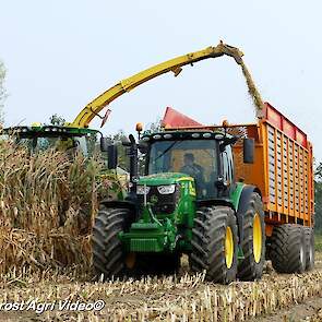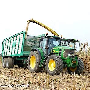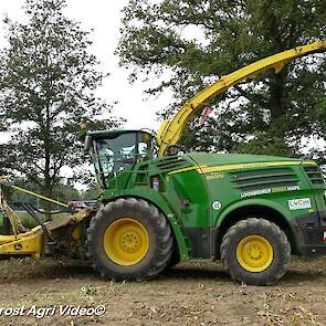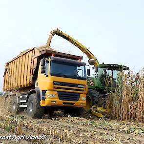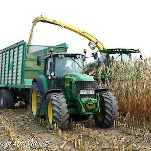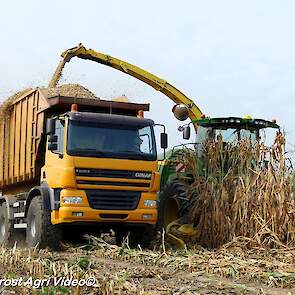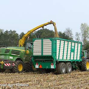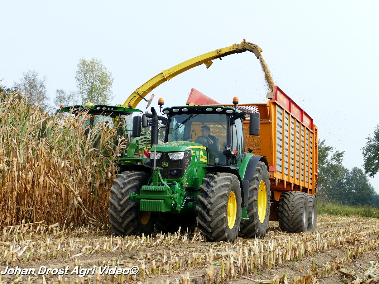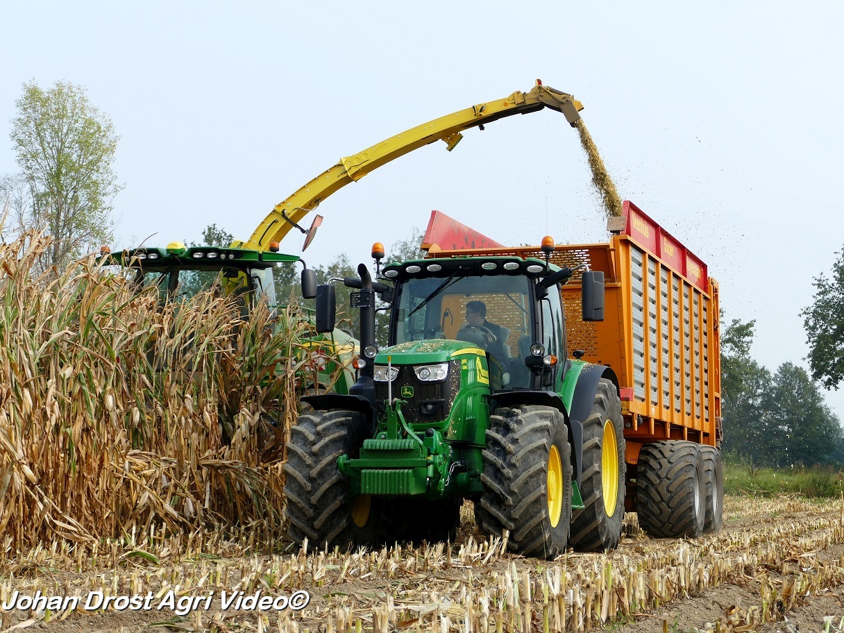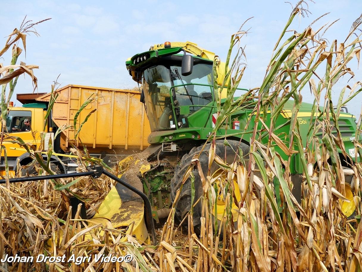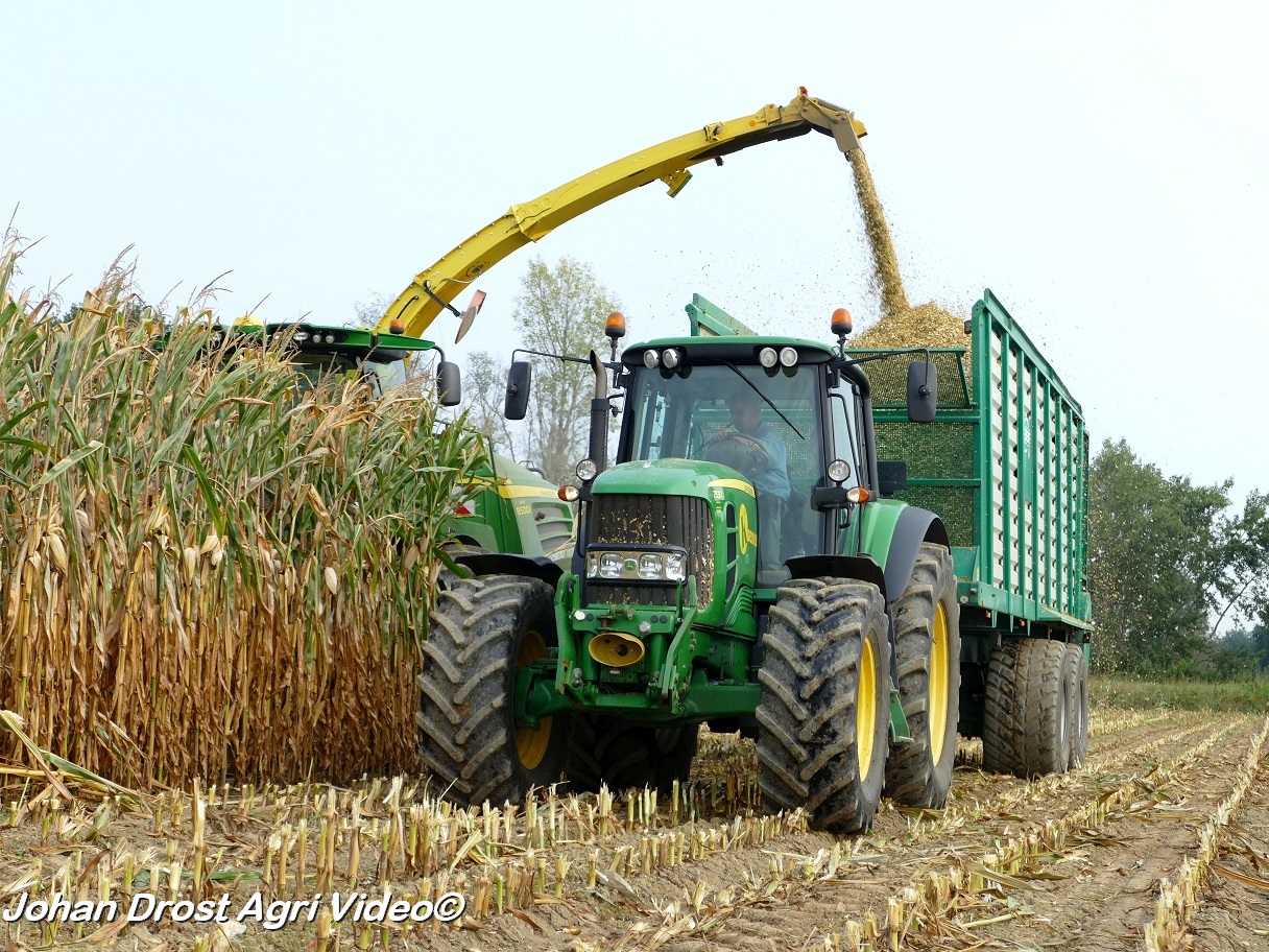 LvCm loonwerkcombinatie uit Haps - Overloon aan het mais hakselen met een John Deere 8500i en een John Deere 6145R met Veenhuis Super Silagewagen, John Deere 7530 Premium met Tebbe en een Ginaf X 3335 S-maistruck.