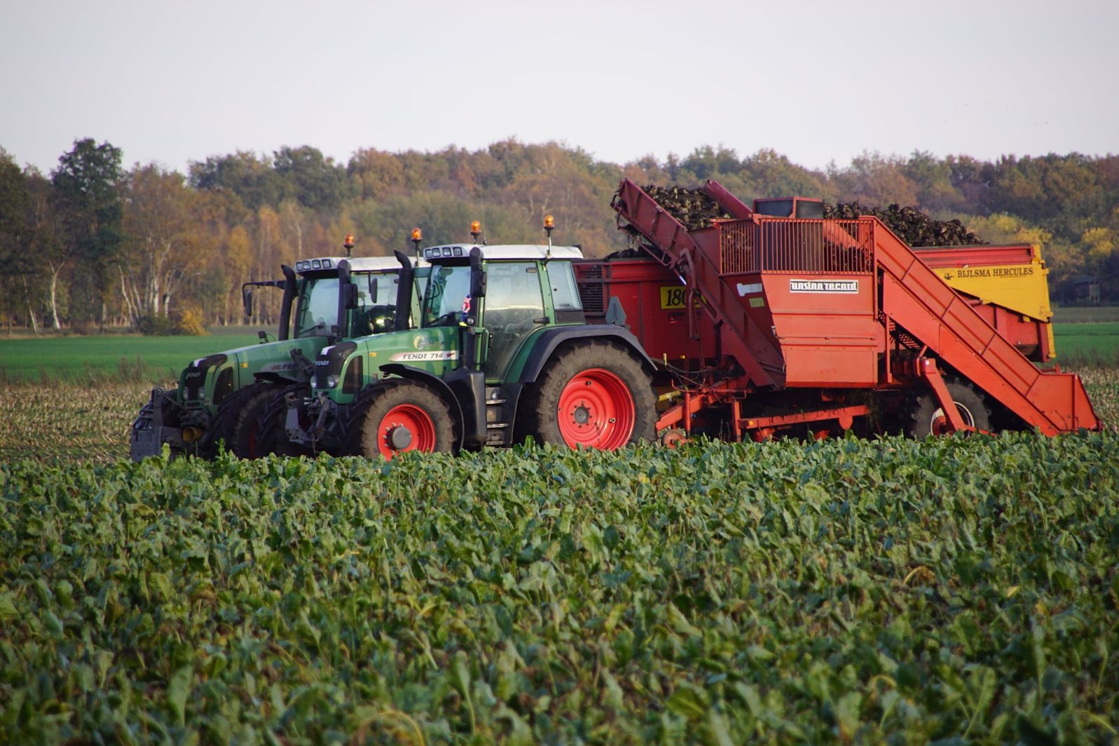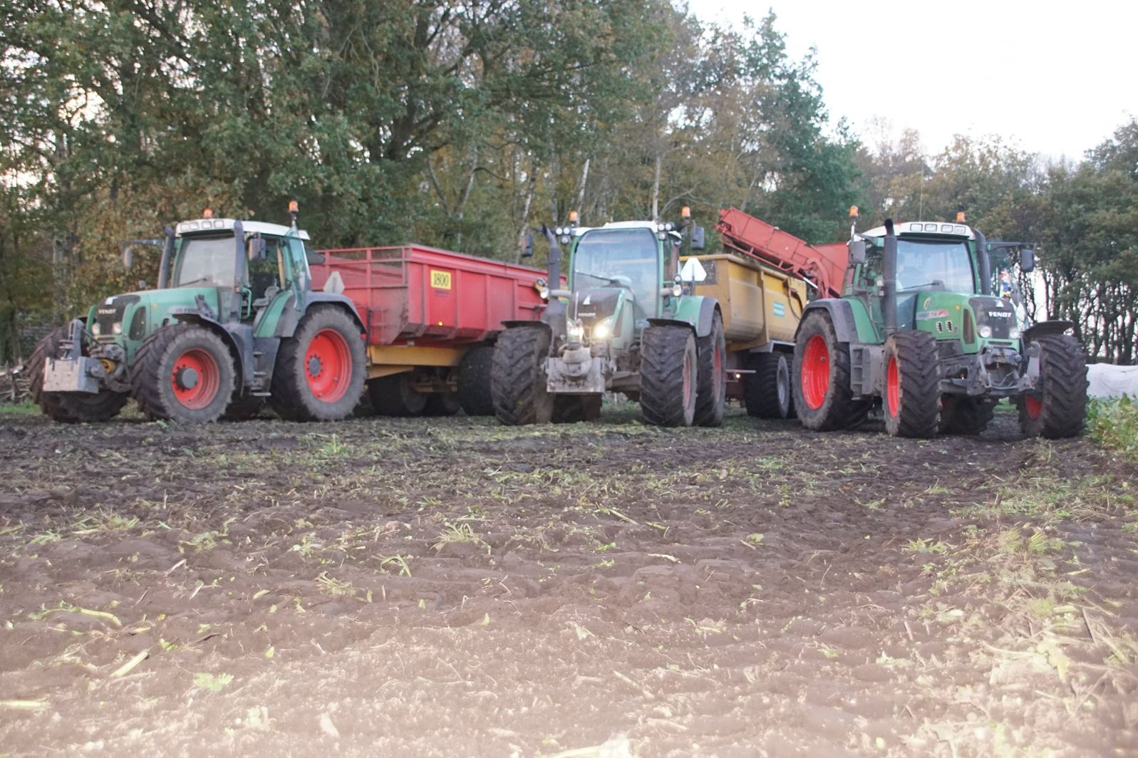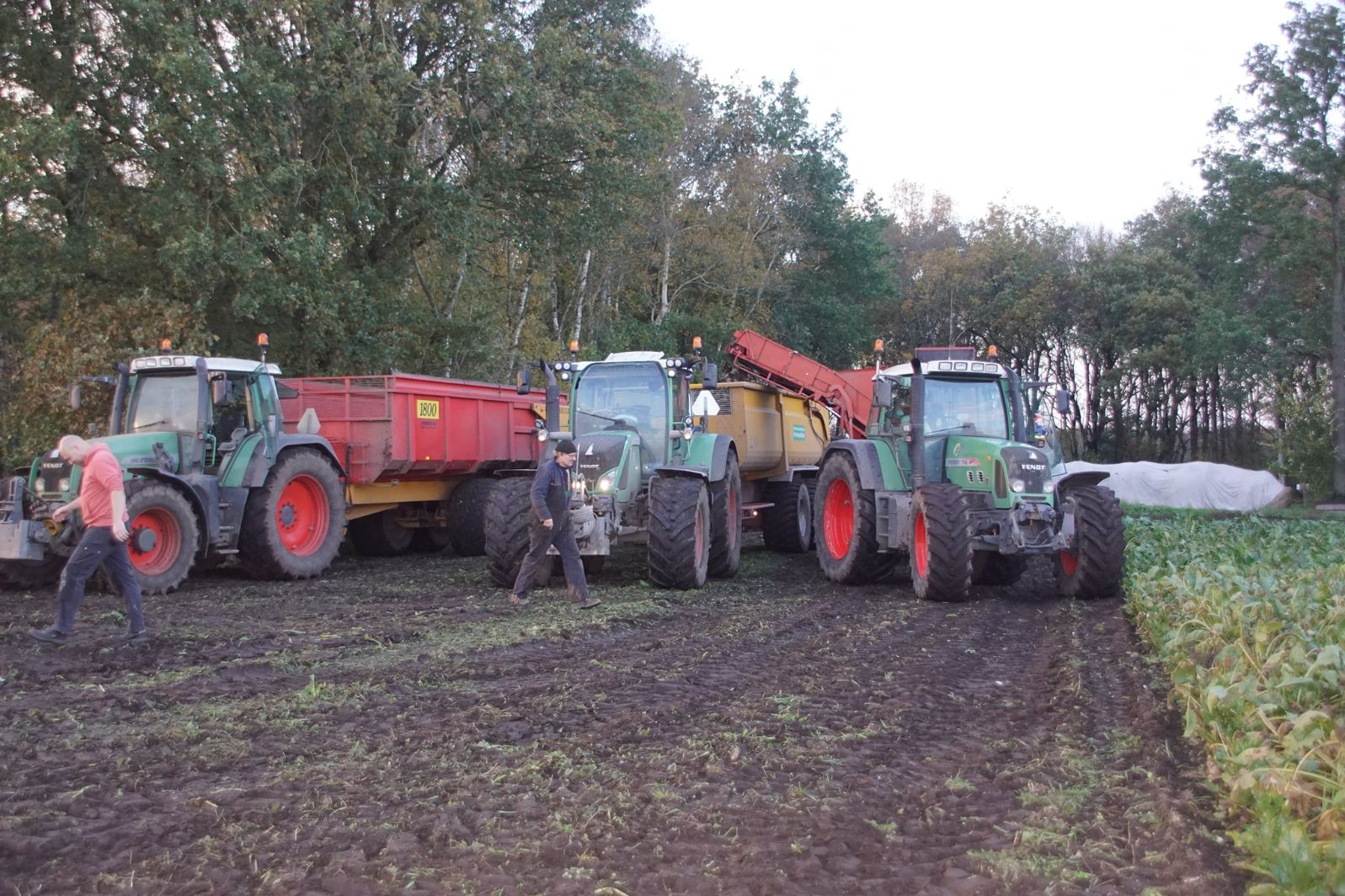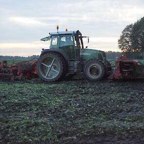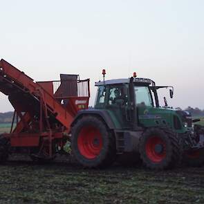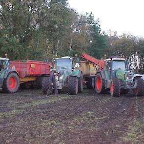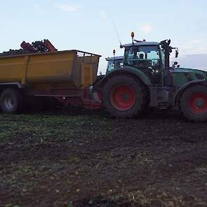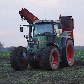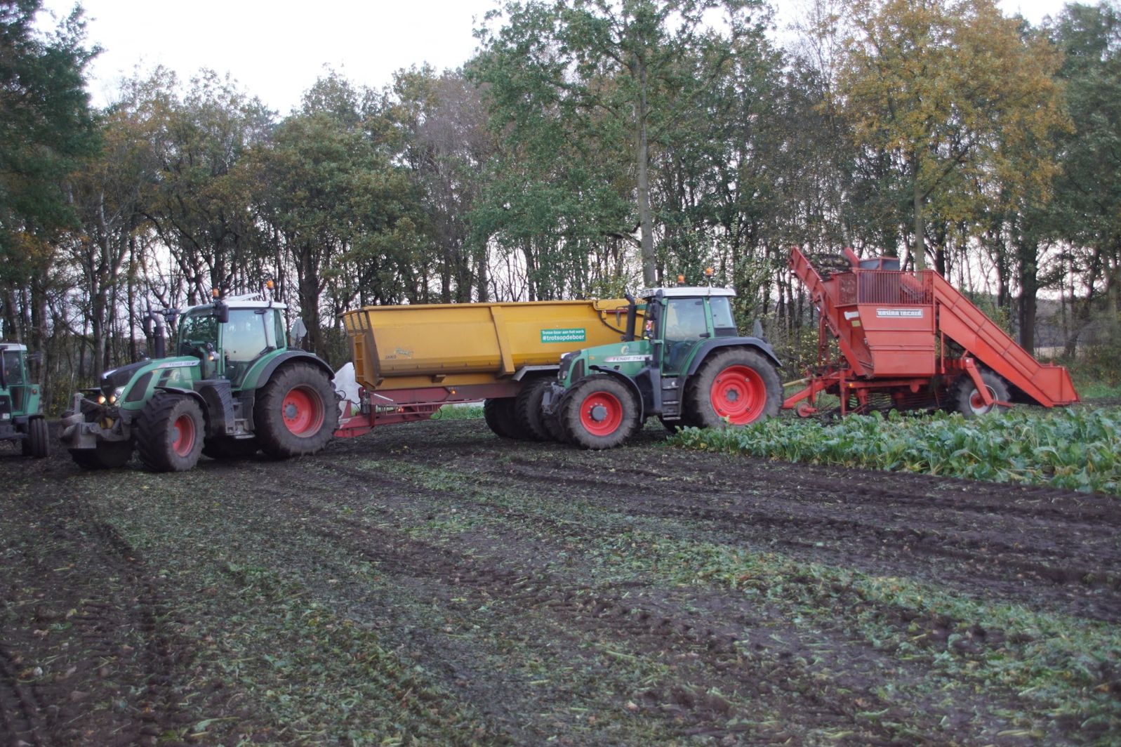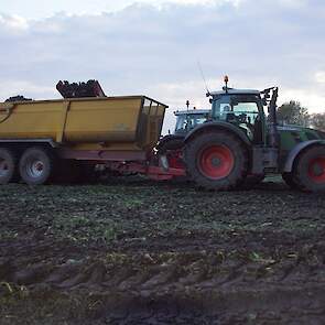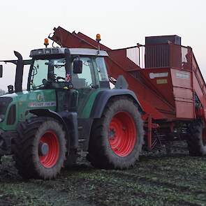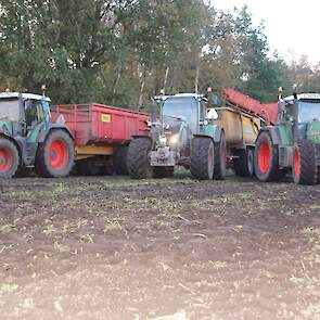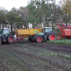 Loonbedrijf Schepers uit Oosterhesselen aan het tweefasen suikerbieten rooien met onder andere een Fendt 415 en 818 en een Fendt 714 met Gilles-rooimachine.