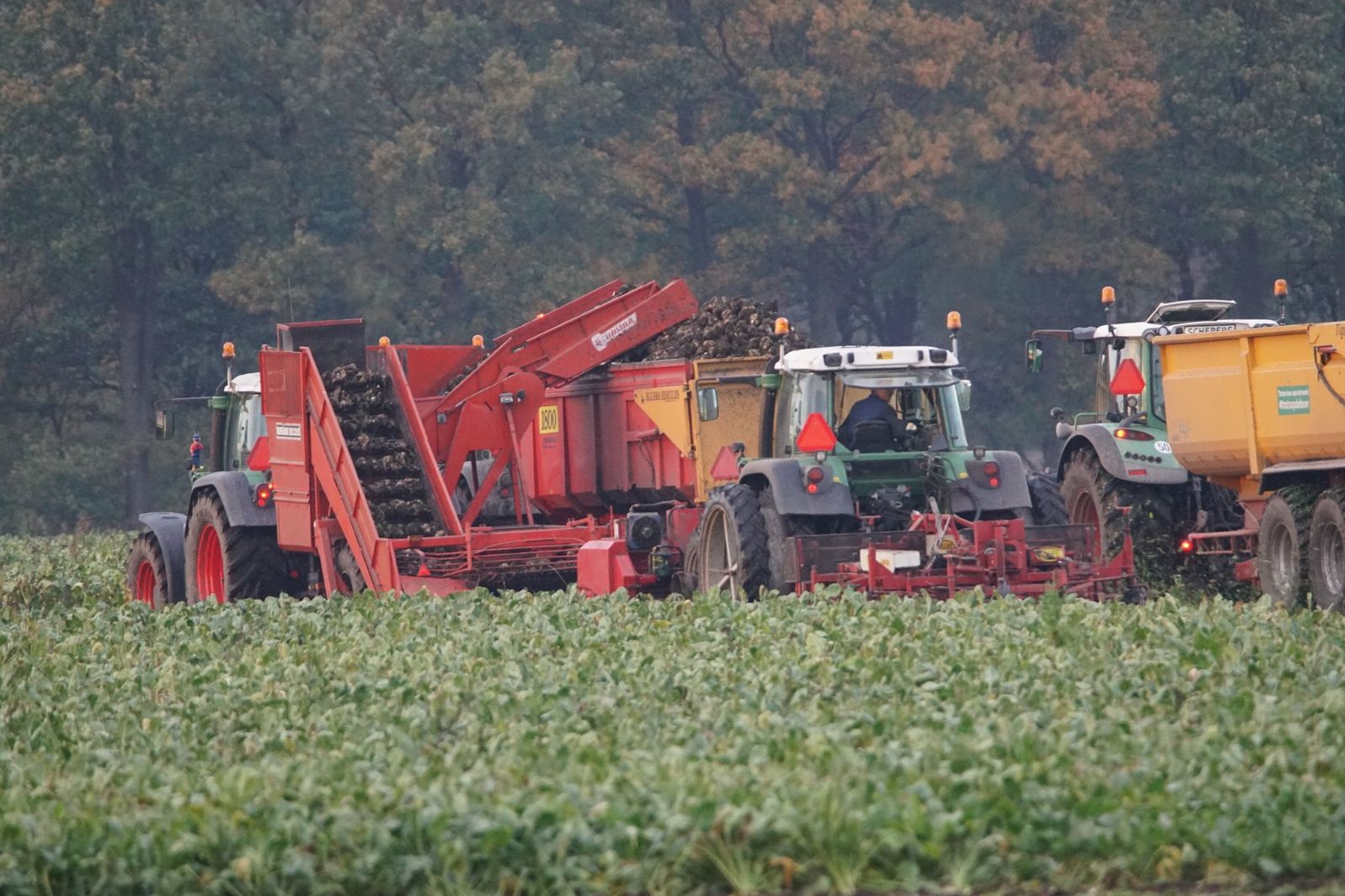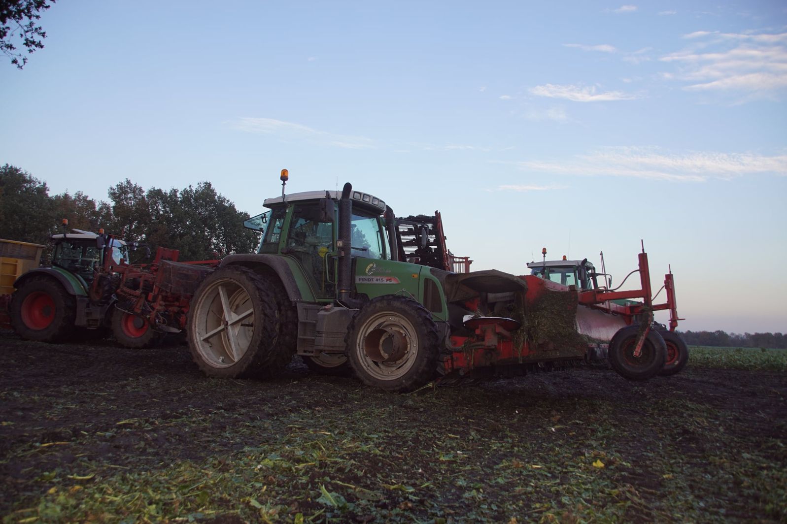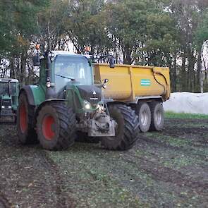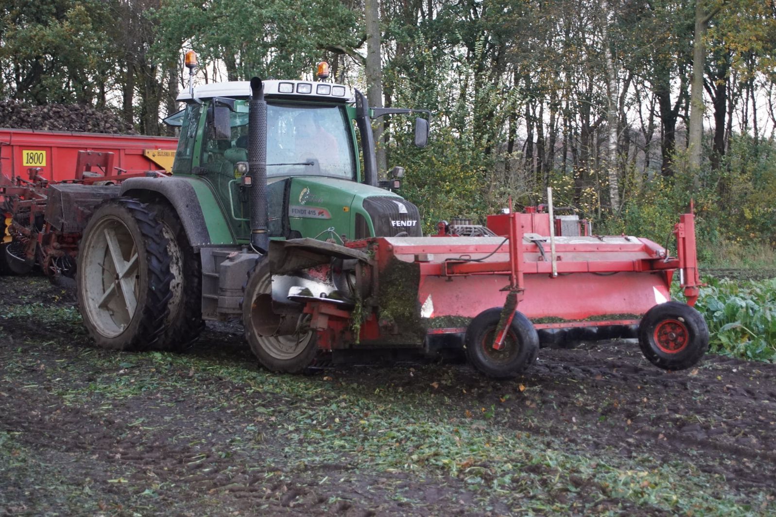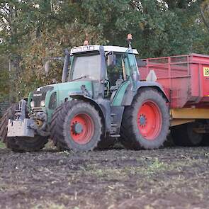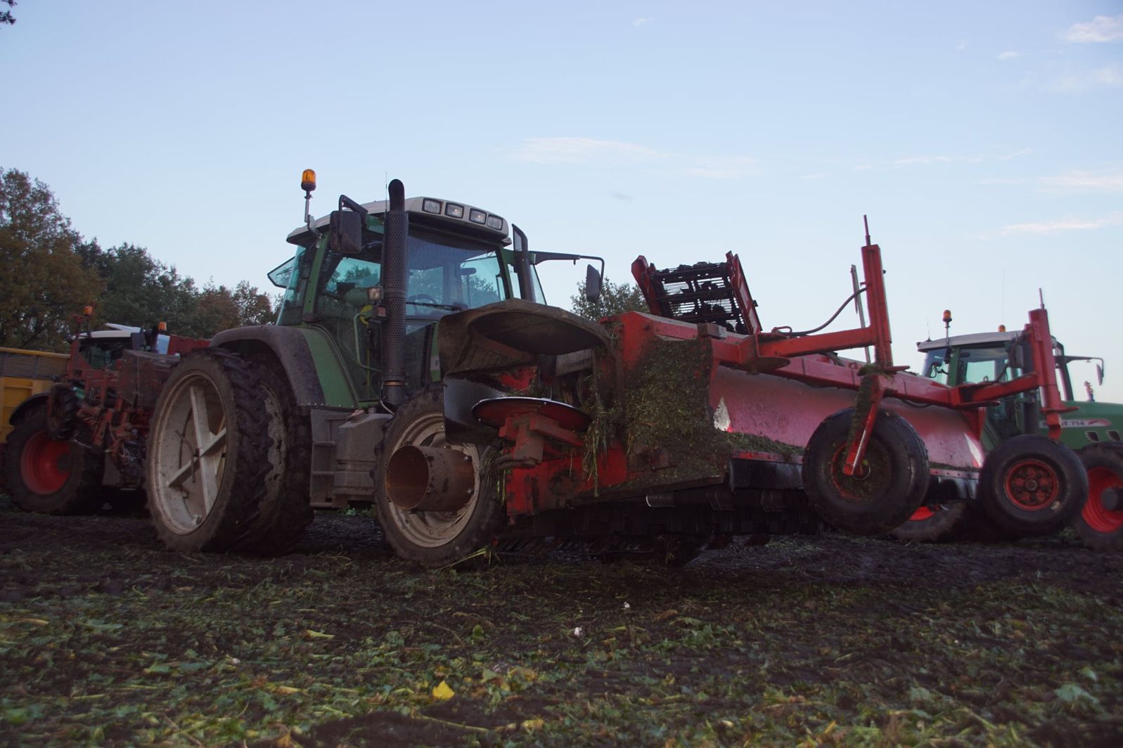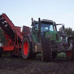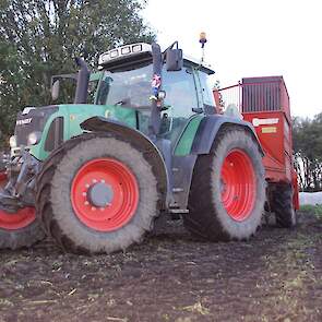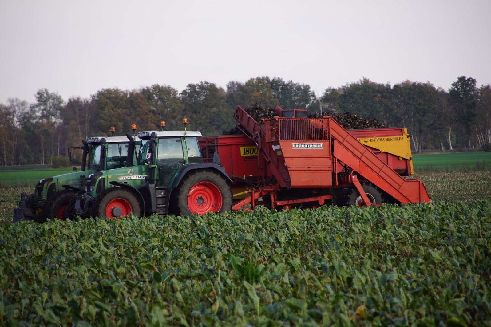 Loonbedrijf Schepers uit Oosterhesselen aan het tweefasen suikerbieten rooien met onder andere een Fendt 415 en 818 en een Fendt 714 met Gilles-rooimachine.