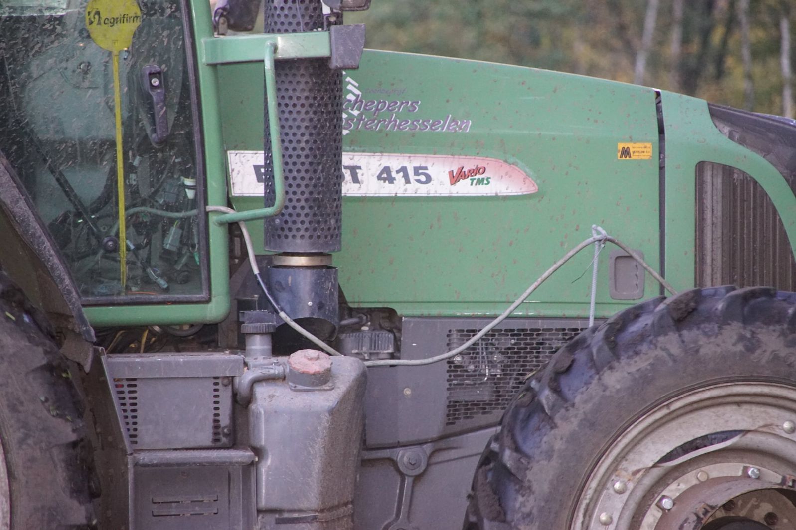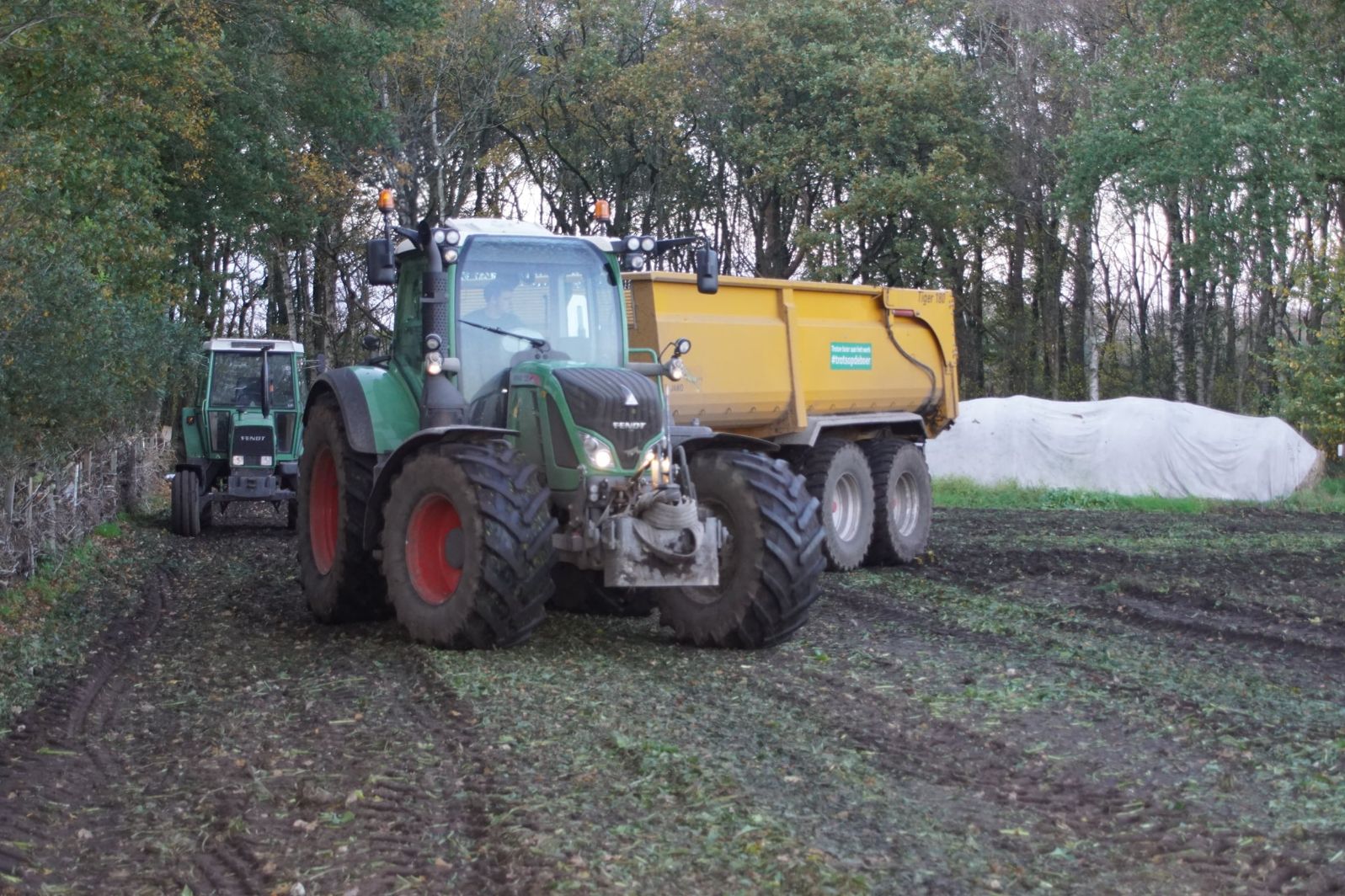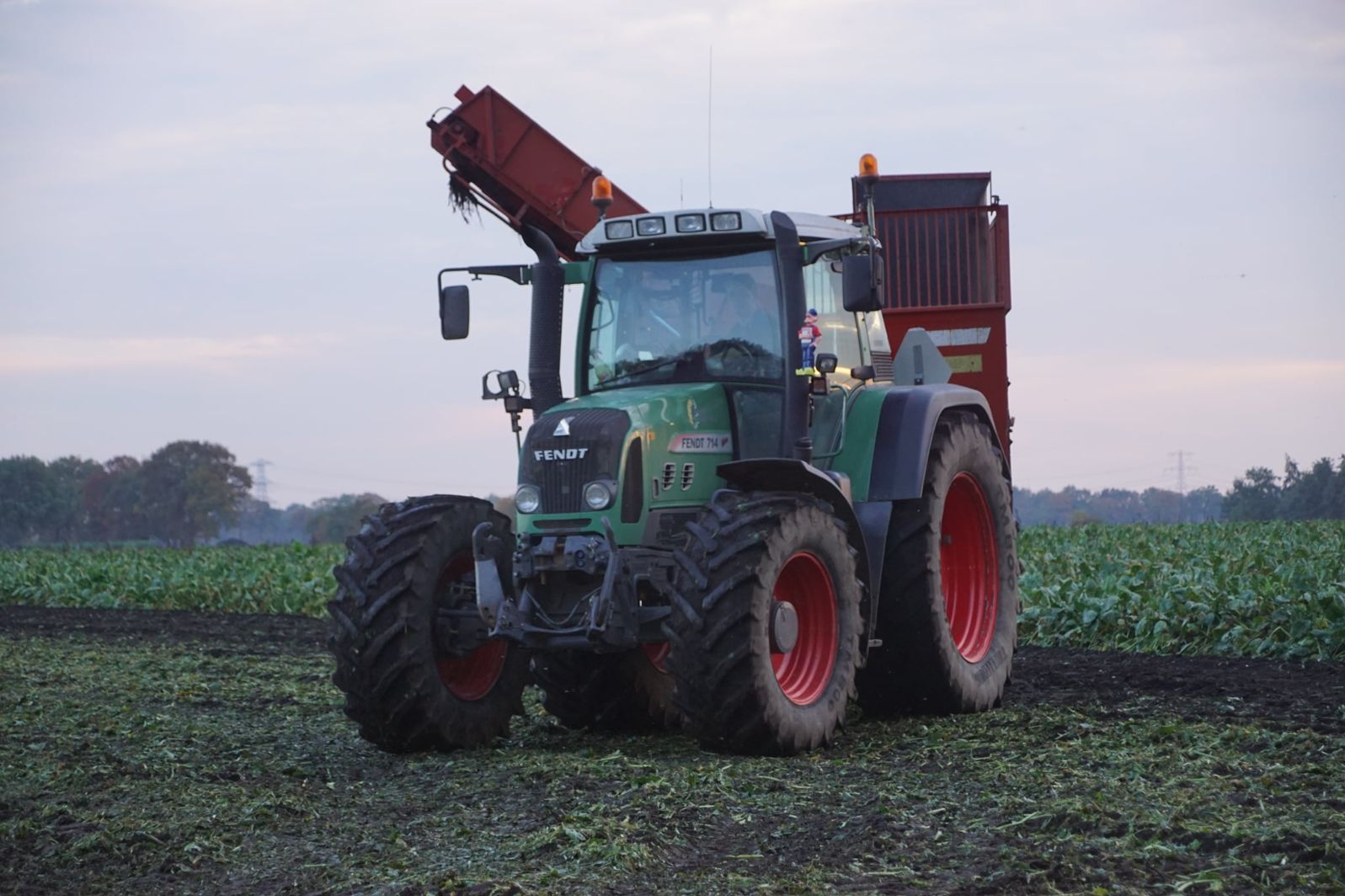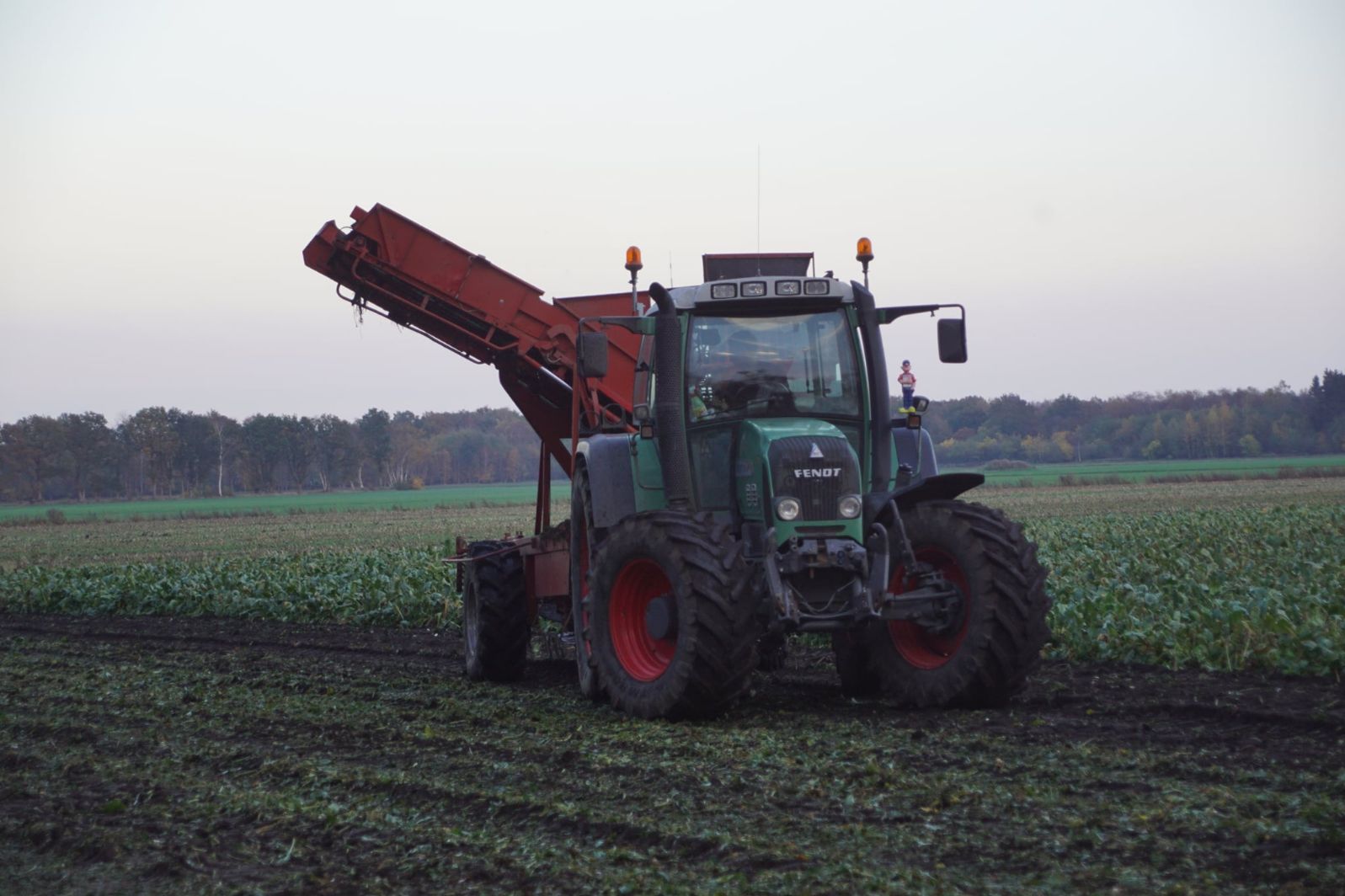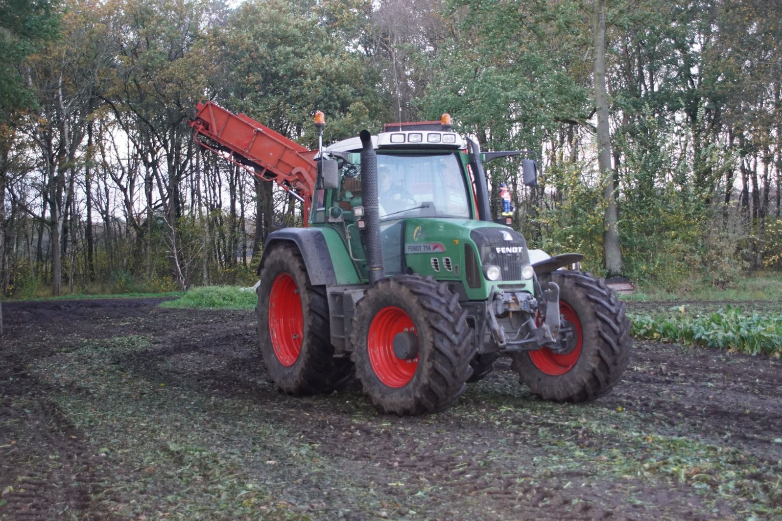 Loonbedrijf Schepers uit Oosterhesselen aan het tweefasen suikerbieten rooien met onder andere een Fendt 415 en 818 en een Fendt 714 met Gilles-rooimachine.