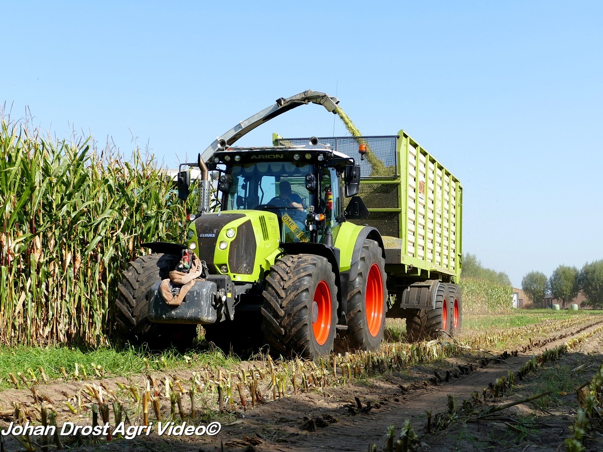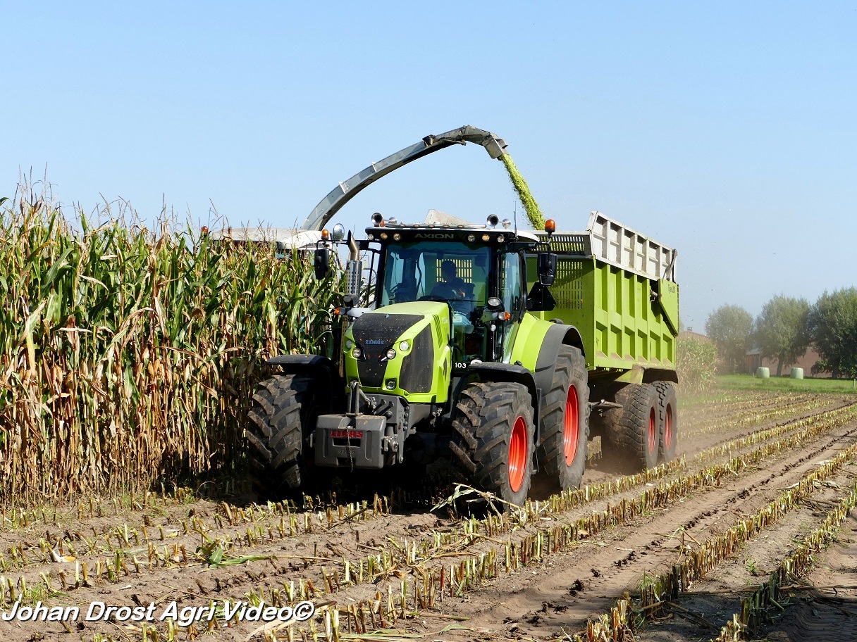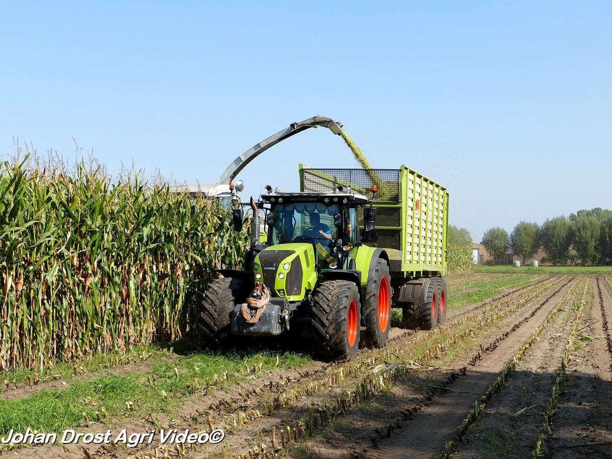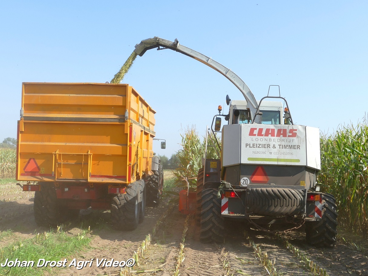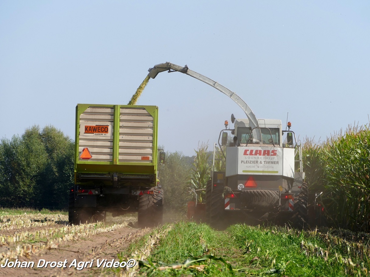 Loonbedrijf Pleizier en Timmer uit Nijkerk (GD) aan het mais hakselen met een Claas Jaguar 870 (6-rijer), een Fendt Favorit 916 Vario met Jan Veenhuis-silagekipper, een Claas Axion met Jako Tiger 200 en een Claas Arion met Kaweco Radium 45.