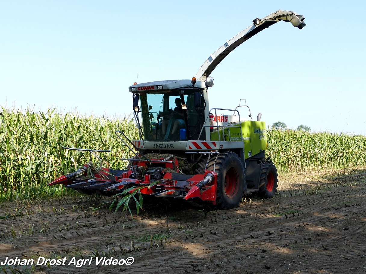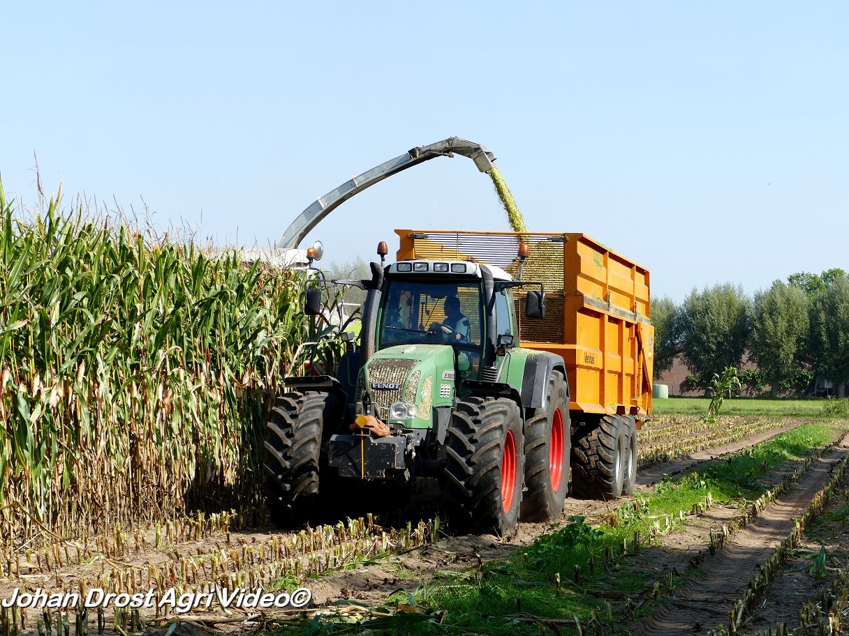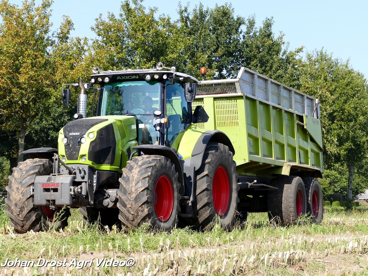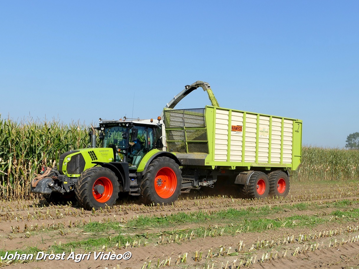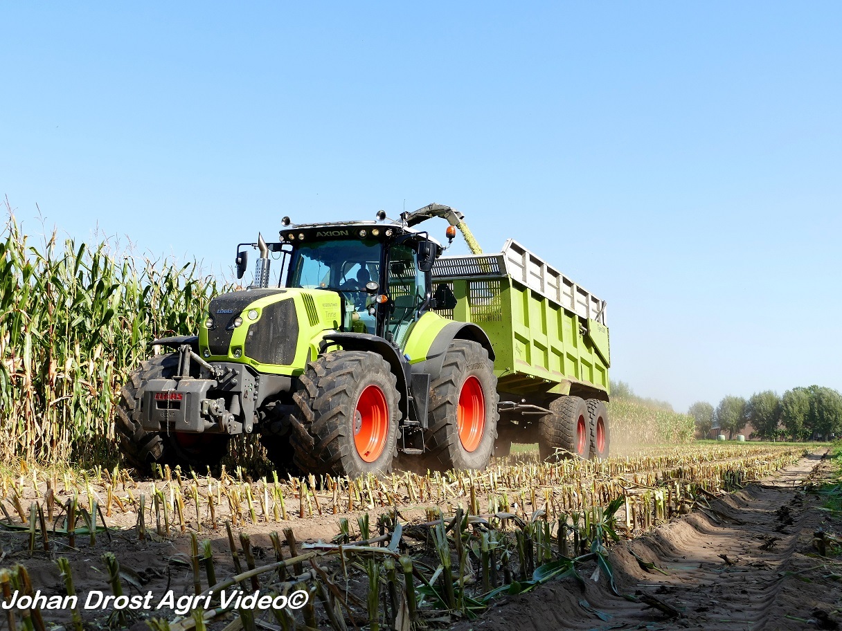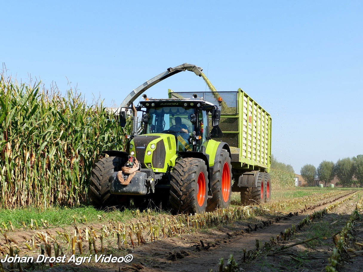 Loonbedrijf Pleizier en Timmer uit Nijkerk (GD) aan het mais hakselen met een Claas Jaguar 870 (6-rijer), een Fendt Favorit 916 Vario met Jan Veenhuis-silagekipper, een Claas Axion met Jako Tiger 200 en een Claas Arion met Kaweco Radium 45.