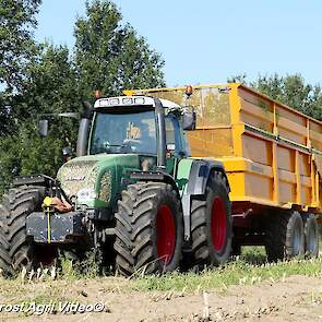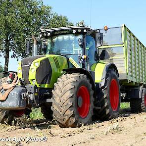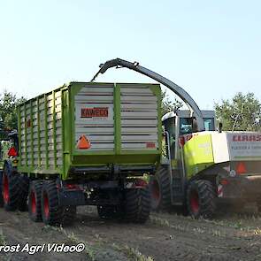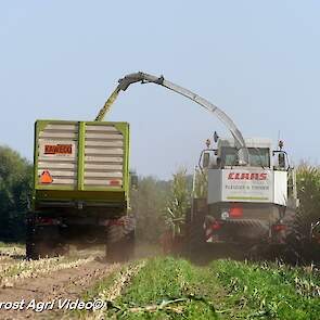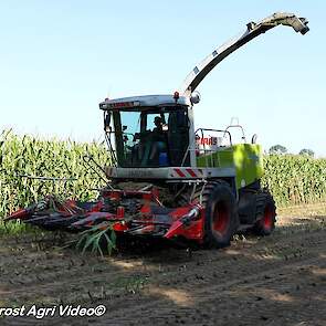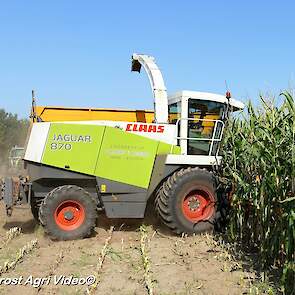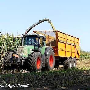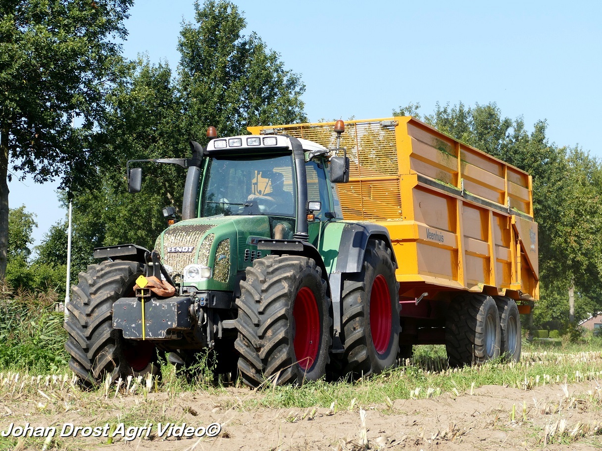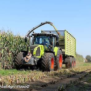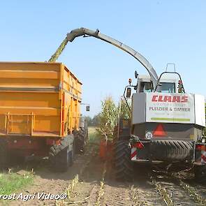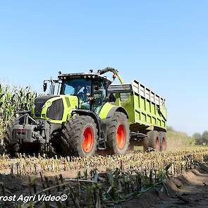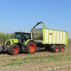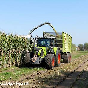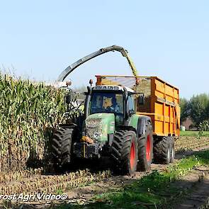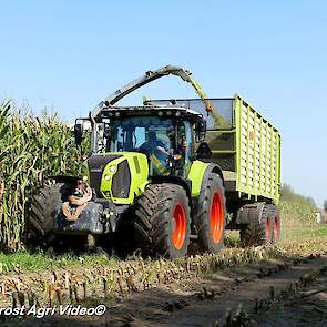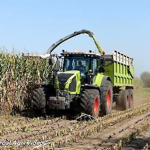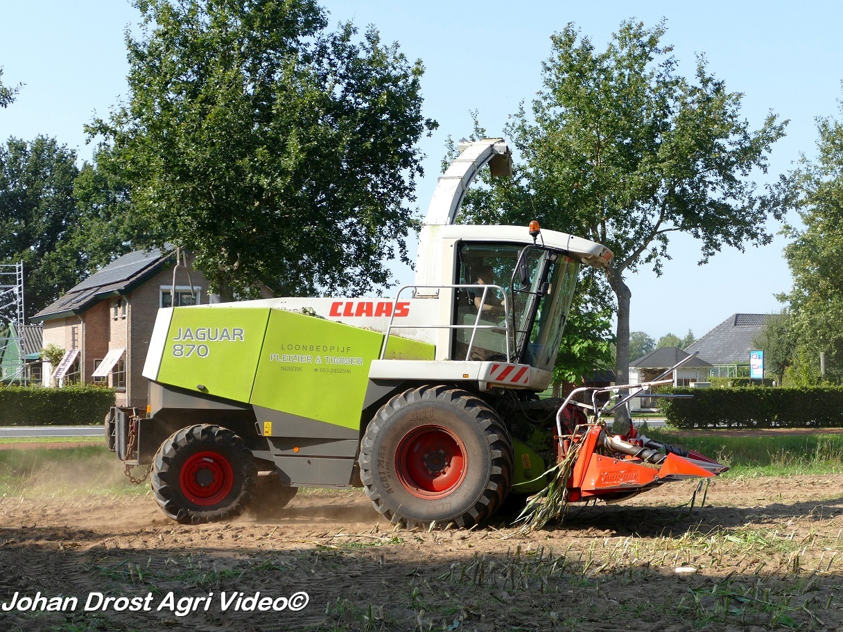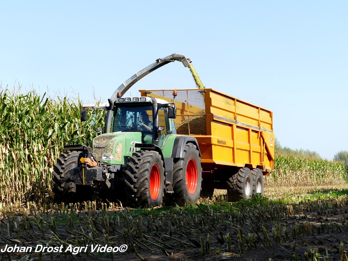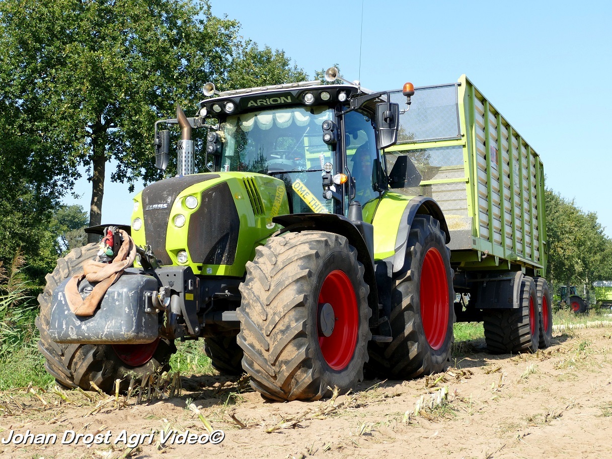 Loonbedrijf Pleizier en Timmer uit Nijkerk (GD) aan het mais hakselen met een Claas Jaguar 870 (6-rijer), een Fendt Favorit 916 Vario met Jan Veenhuis-silagekipper, een Claas Axion met Jako Tiger 200 en een Claas Arion met Kaweco Radium 45.