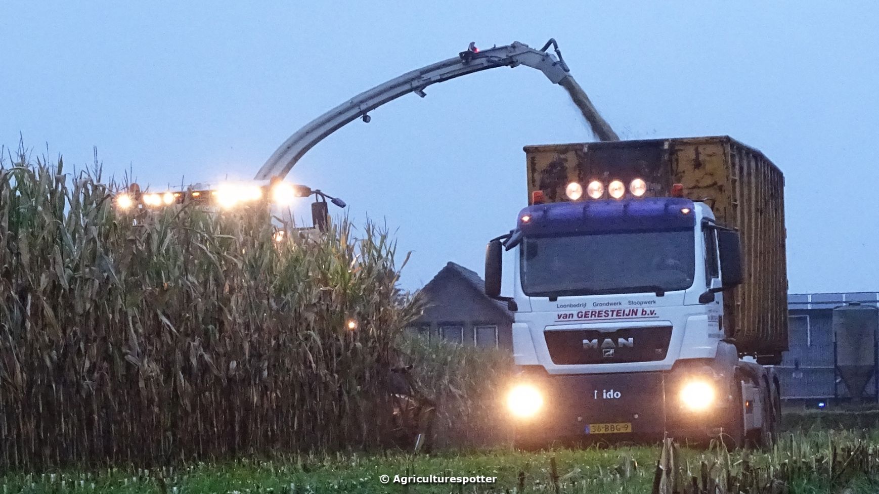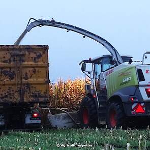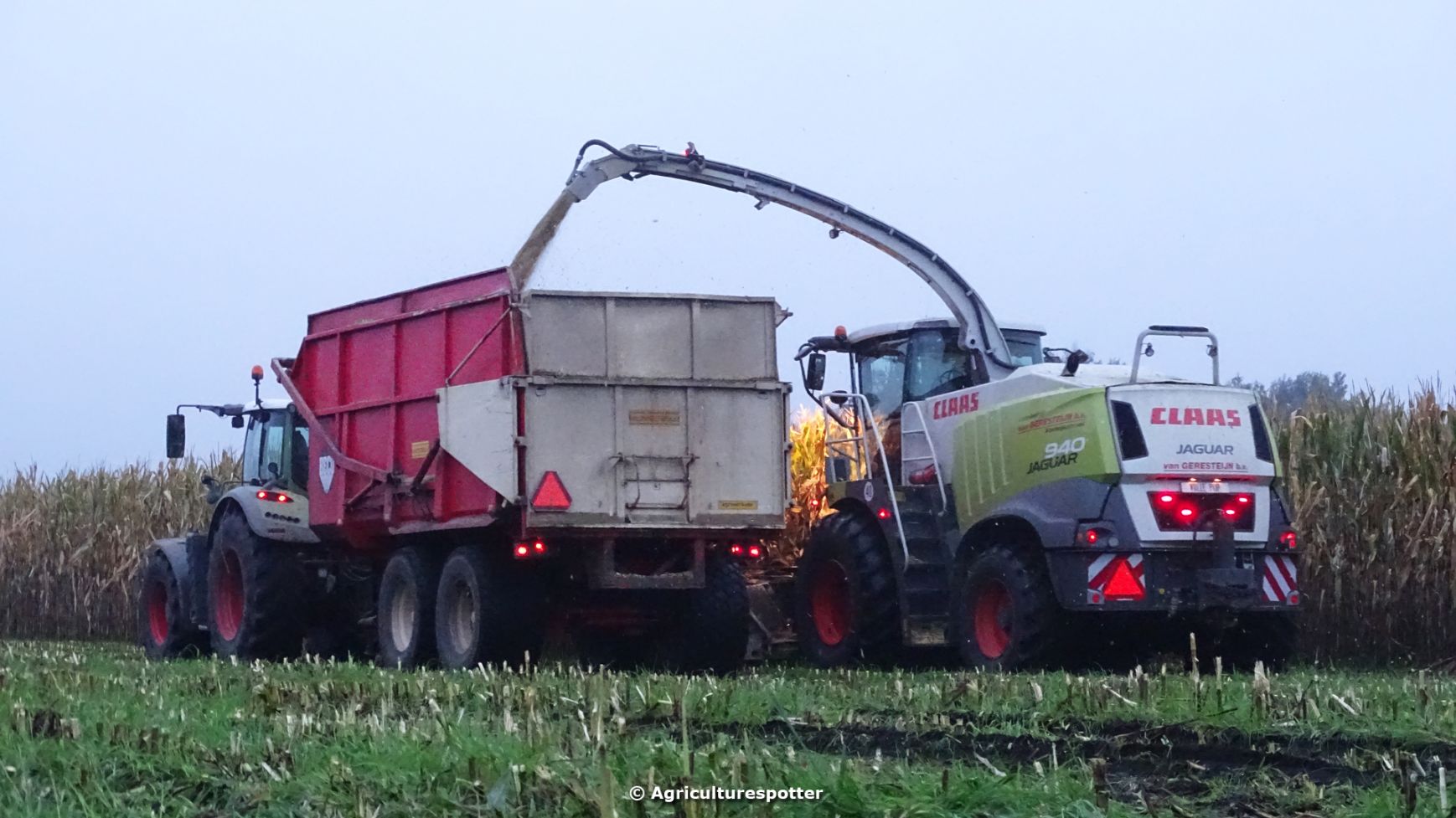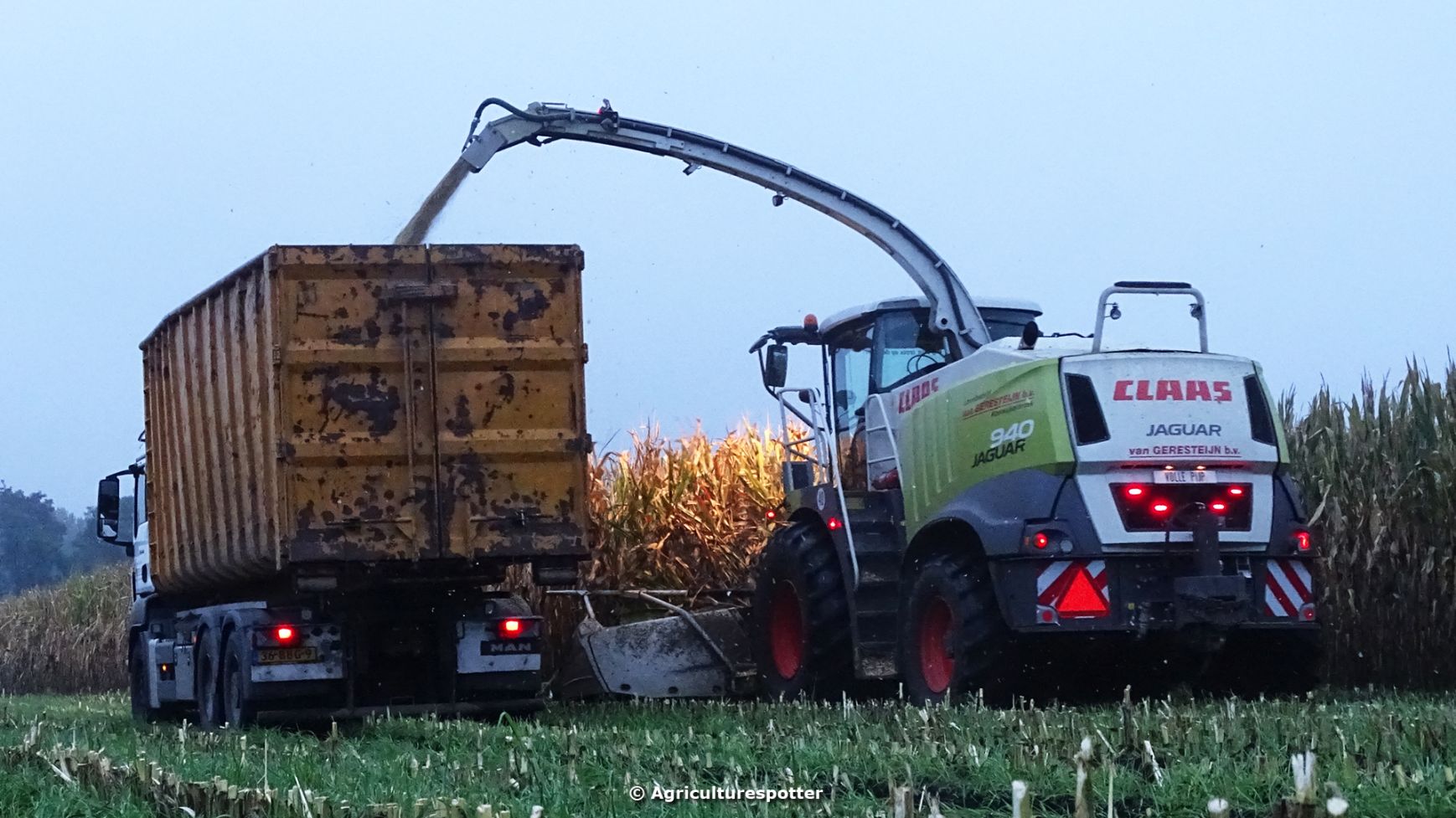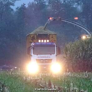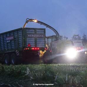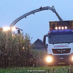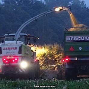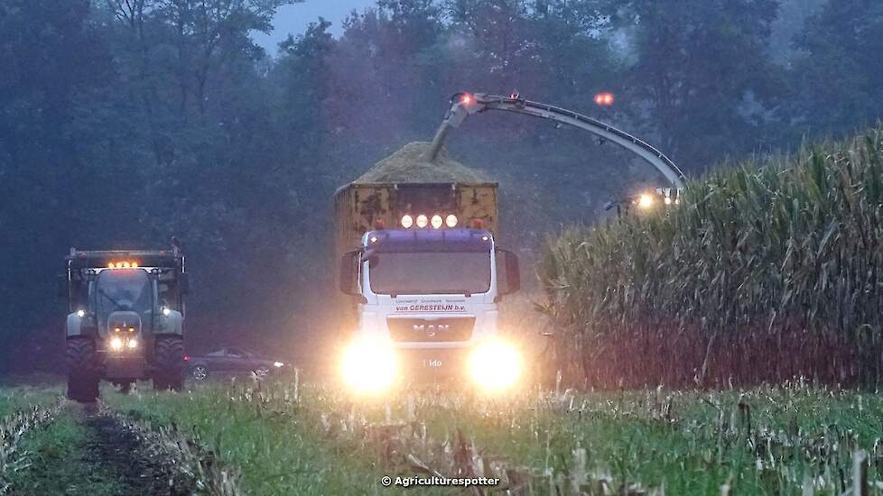Loonbedrijf Van Geresteijn B.V. uit Kootwijkerbroek (GD) 's avonds aan het mais hakselen in Uddel met een Claas Jaguar 940. Het transport werd gedaan met een MAN TGS 26.360, een Fendt 724 Vario met Beco Super-, een Fendt 820 Vario met Bergmann Shuttle 820 K- en een Fendt 930 Vario met Bergmann Carex 370 S-silagewagen.