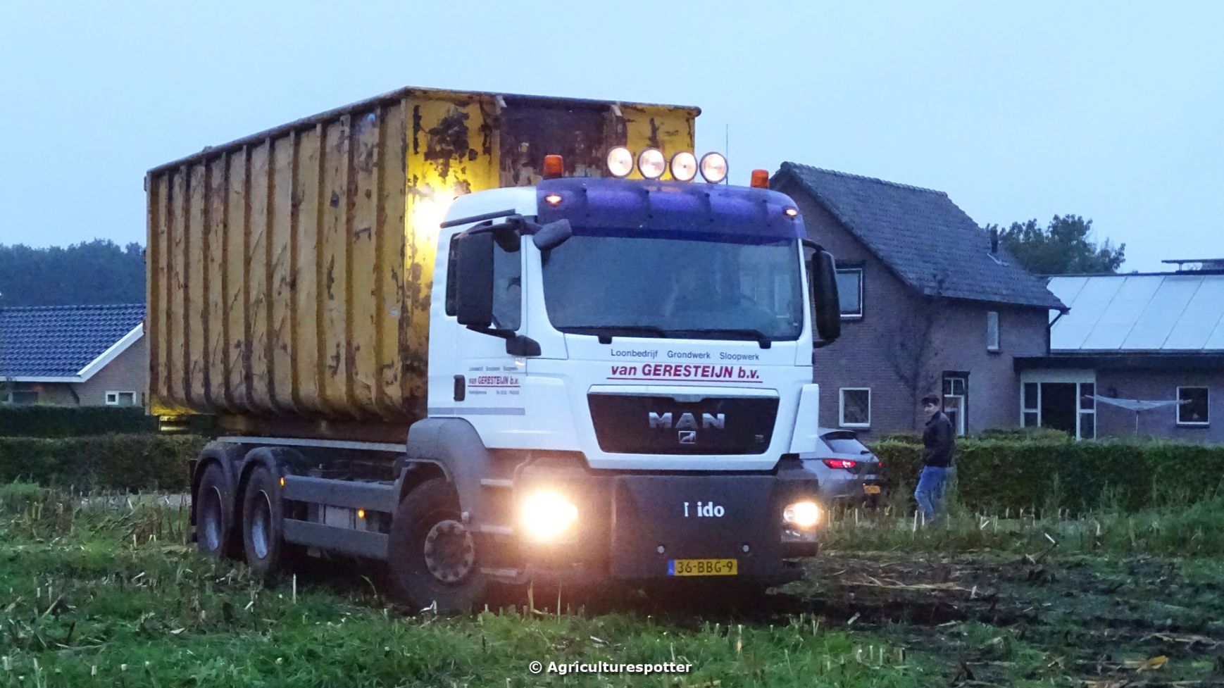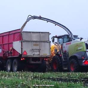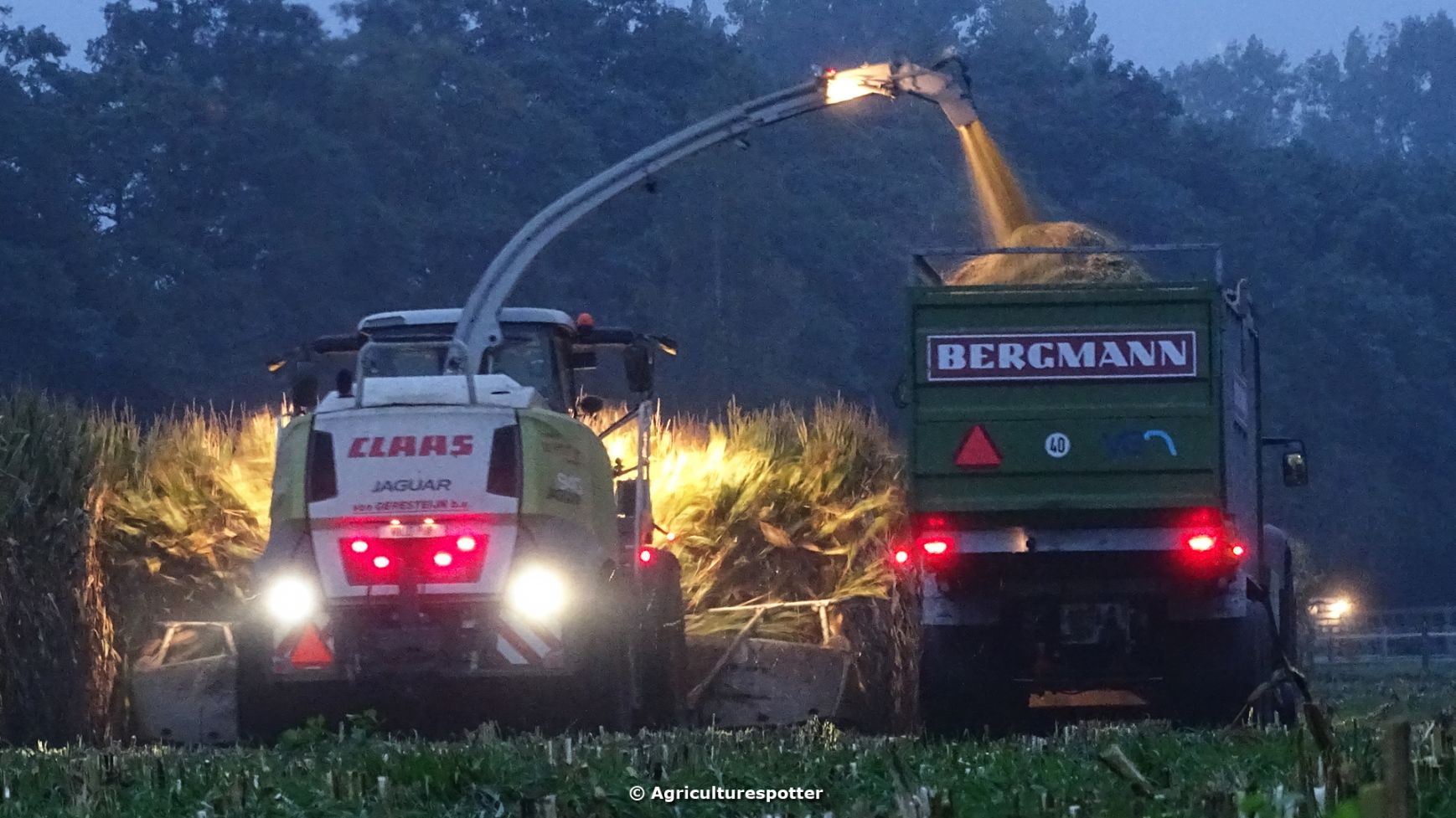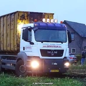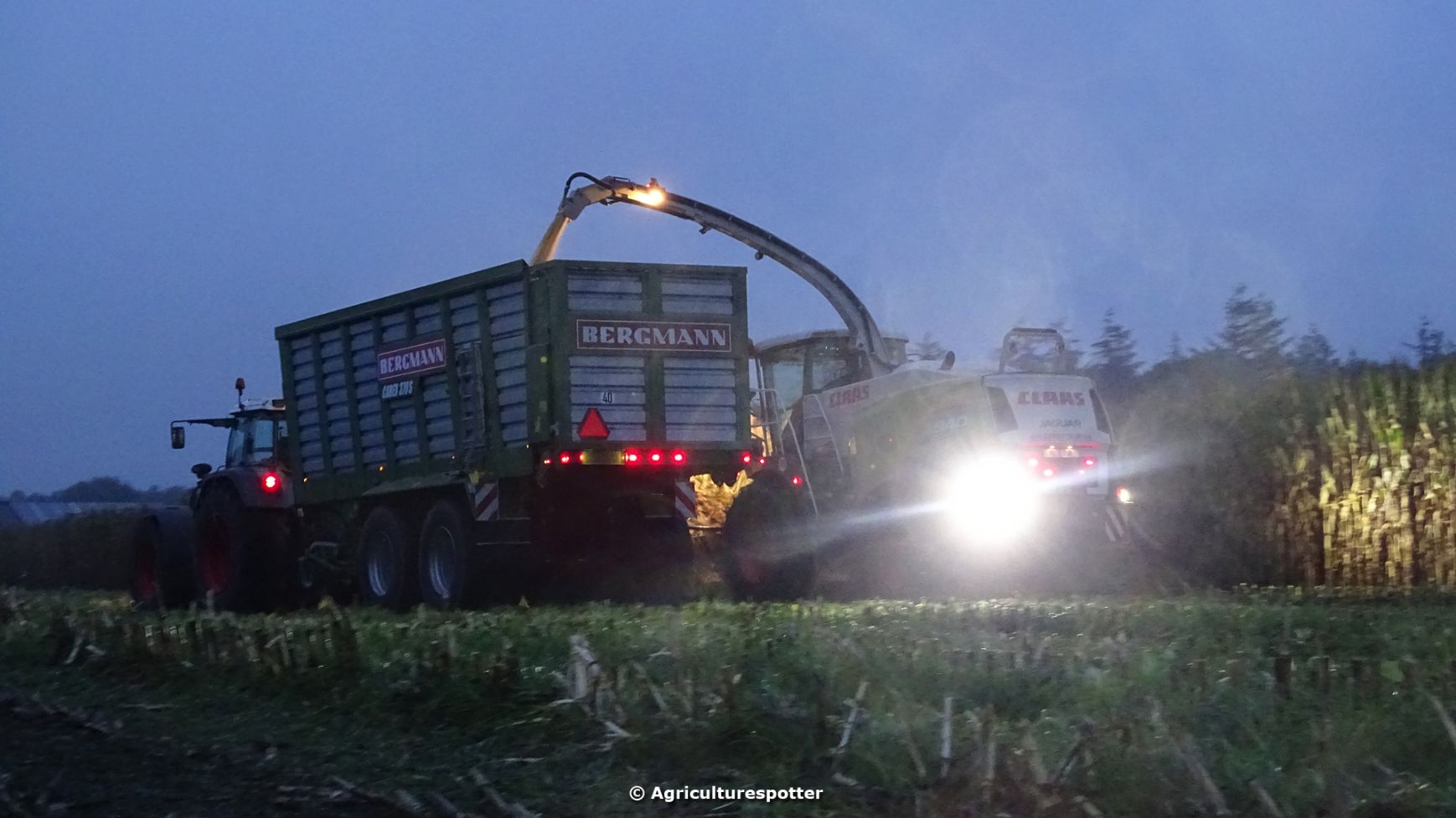 Loonbedrijf Van Geresteijn B.V. uit Kootwijkerbroek (GD) 's avonds aan het mais hakselen in Uddel met een Claas Jaguar 940. Het transport werd gedaan met een MAN TGS 26.360, een Fendt 724 Vario met Beco Super-, een Fendt 820 Vario met Bergmann Shuttle 820 K- en een Fendt 930 Vario met Bergmann Carex 370 S-silagewagen.
