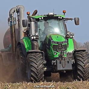 Bouwland bemesten in Voorthuizen (GD) met een Deutz-Fahr Agrotron 6215 TTV en een Jako-mesttank met Kaweco-bemester van melkveehouder V.O.F. Van Heerikhuize uit Lunteren (GD). Het transport van de mest werd gedaan door Loon- & Transportbedrijf van Roekel B.V. uit Ede (GD). De mestcontainer was van Loon- en Grondverzetbedrijf Nap V.O.F.