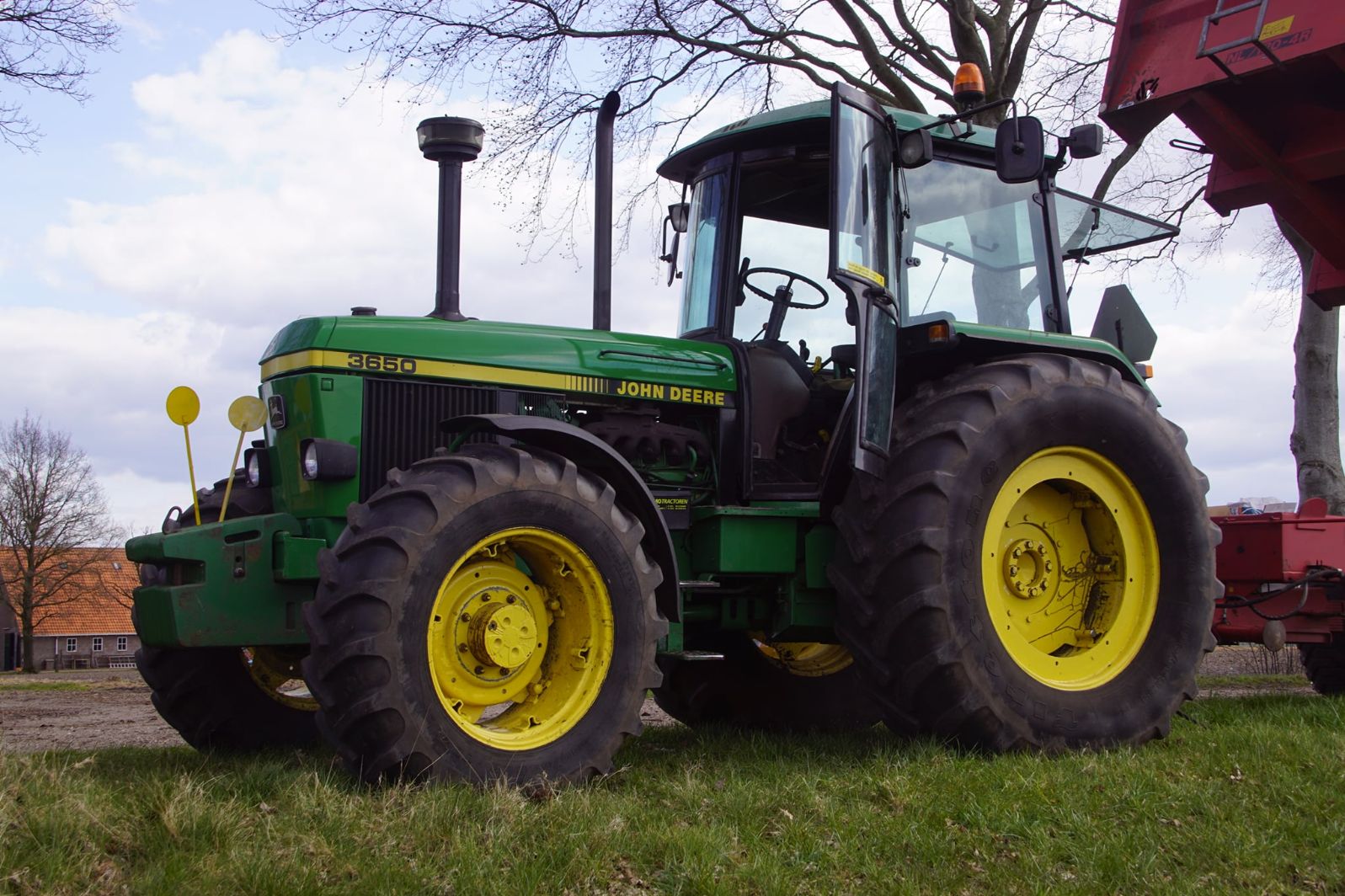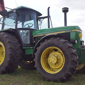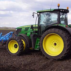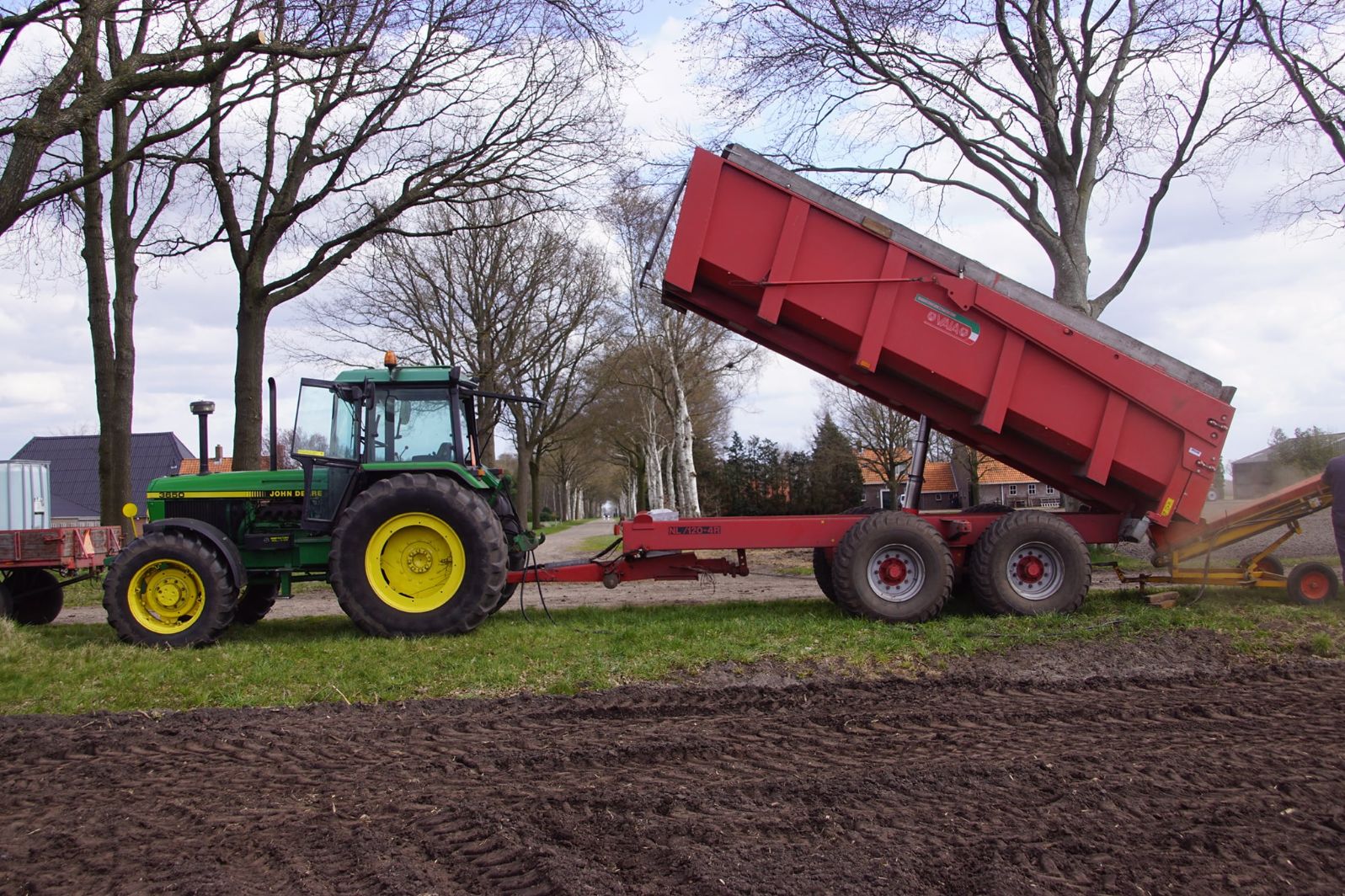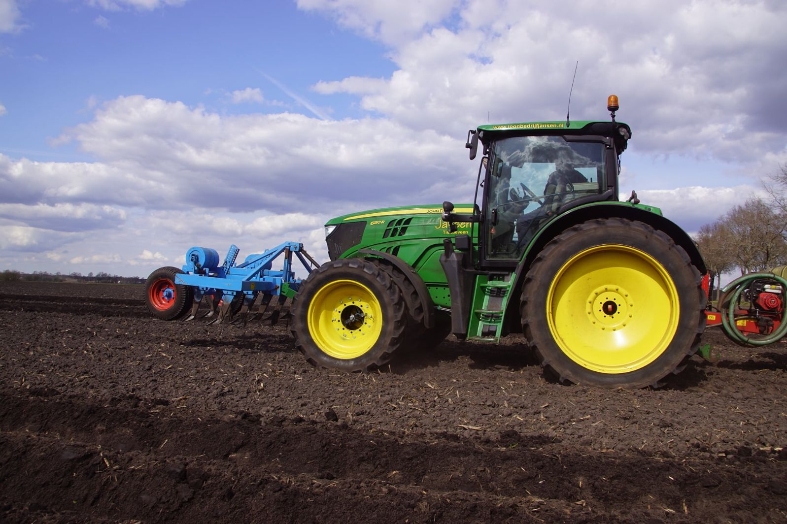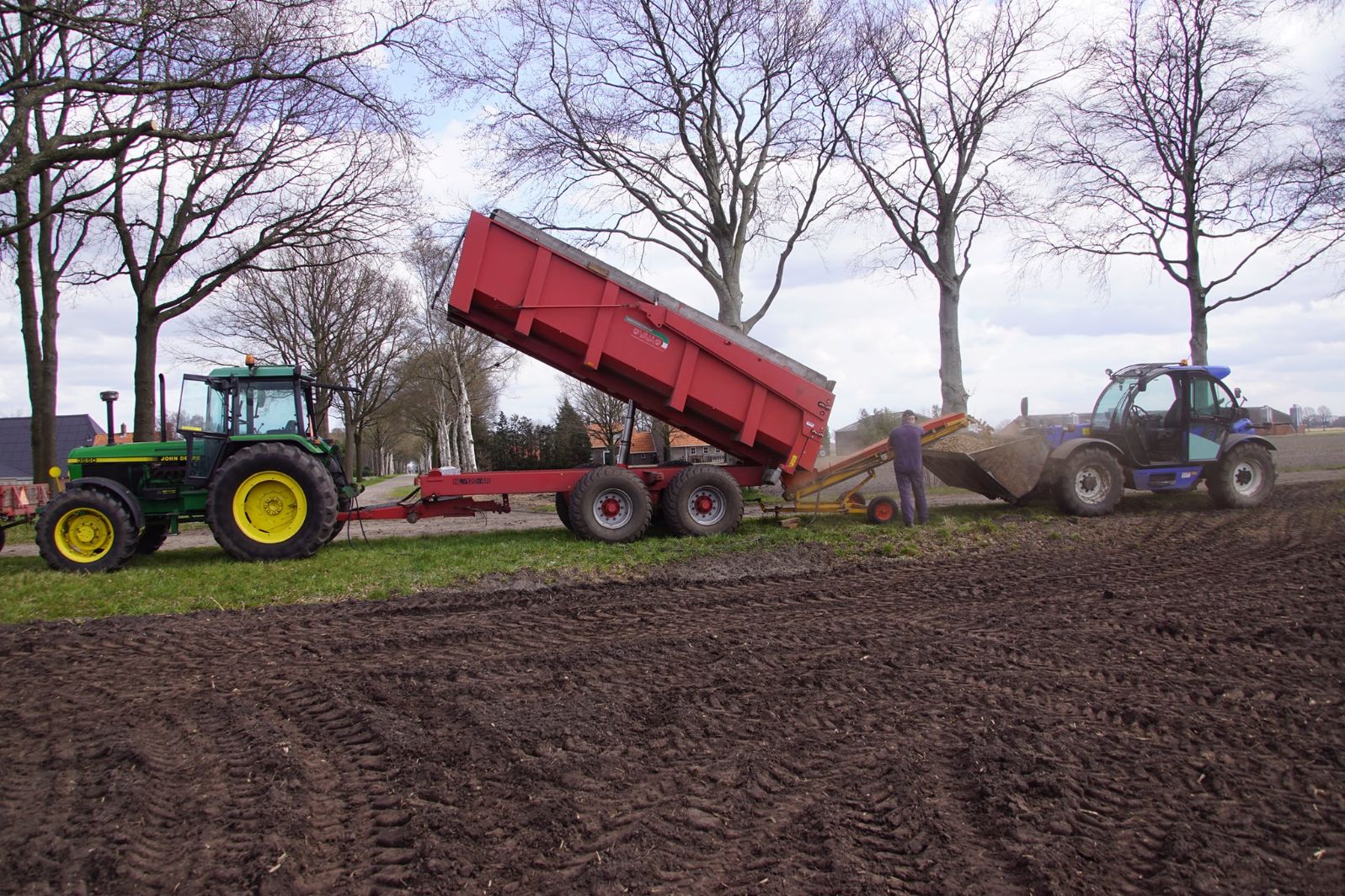 Flink wat John Deere-trekkers in actie om aardappelen te poten. Een New Holland-verreiker is er bij om de bunker van de pootmachine te voorzien van aardappelen.