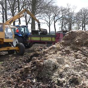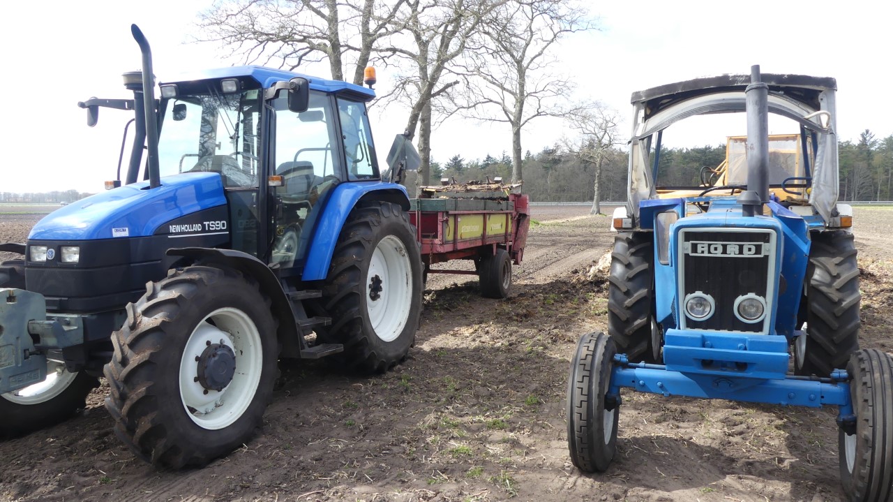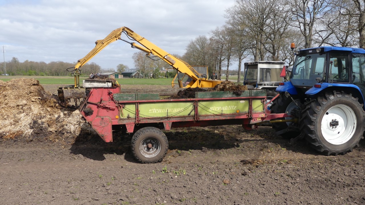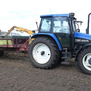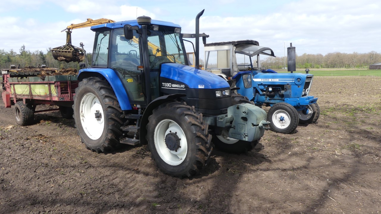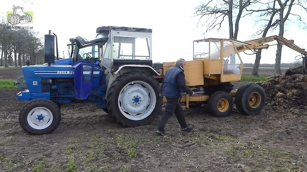 De Ford 5600 met Vaia-kraan laadt de stalmest op de Strautmann Streublitz die achter een New Holland TS 90 zit