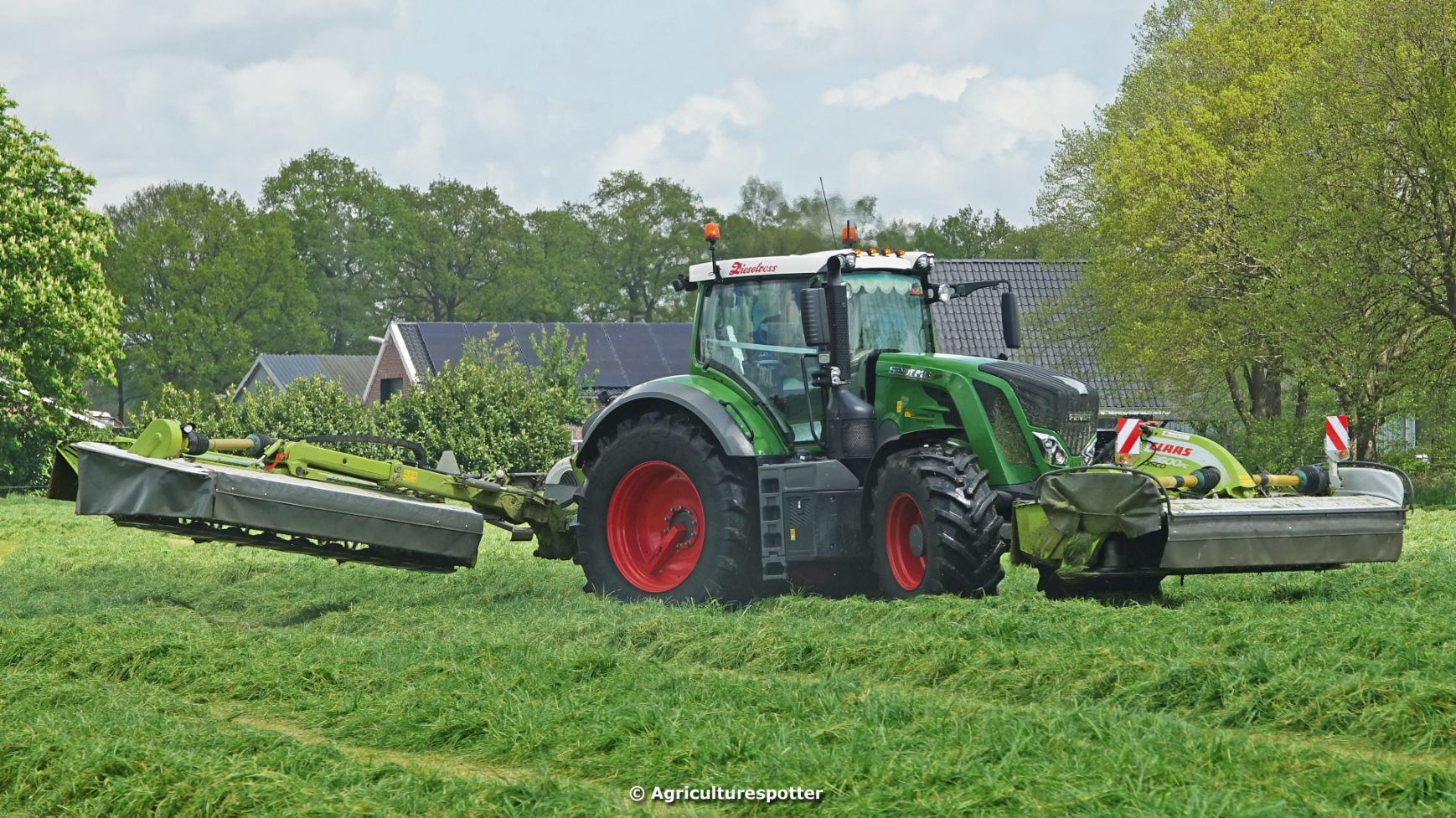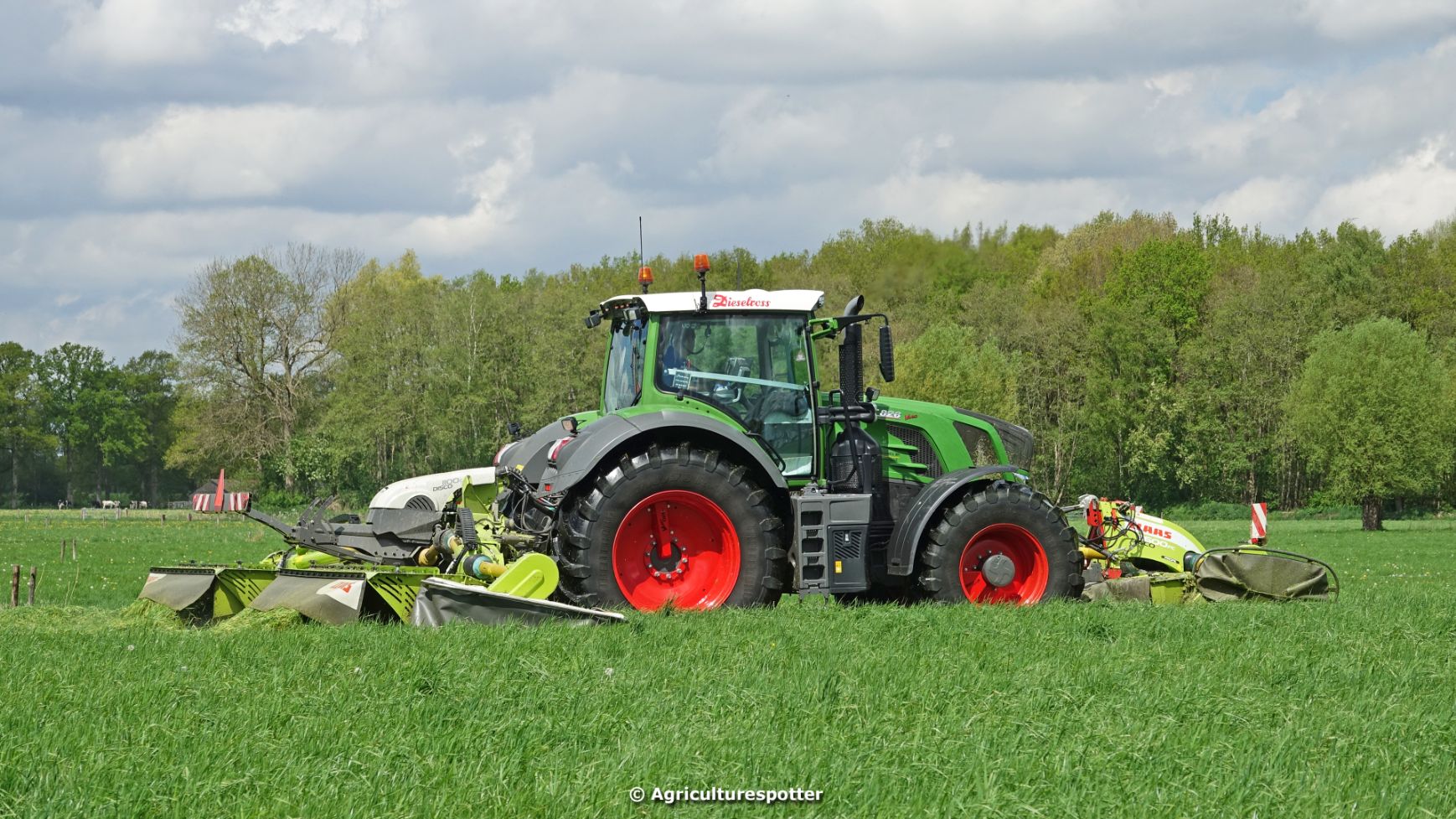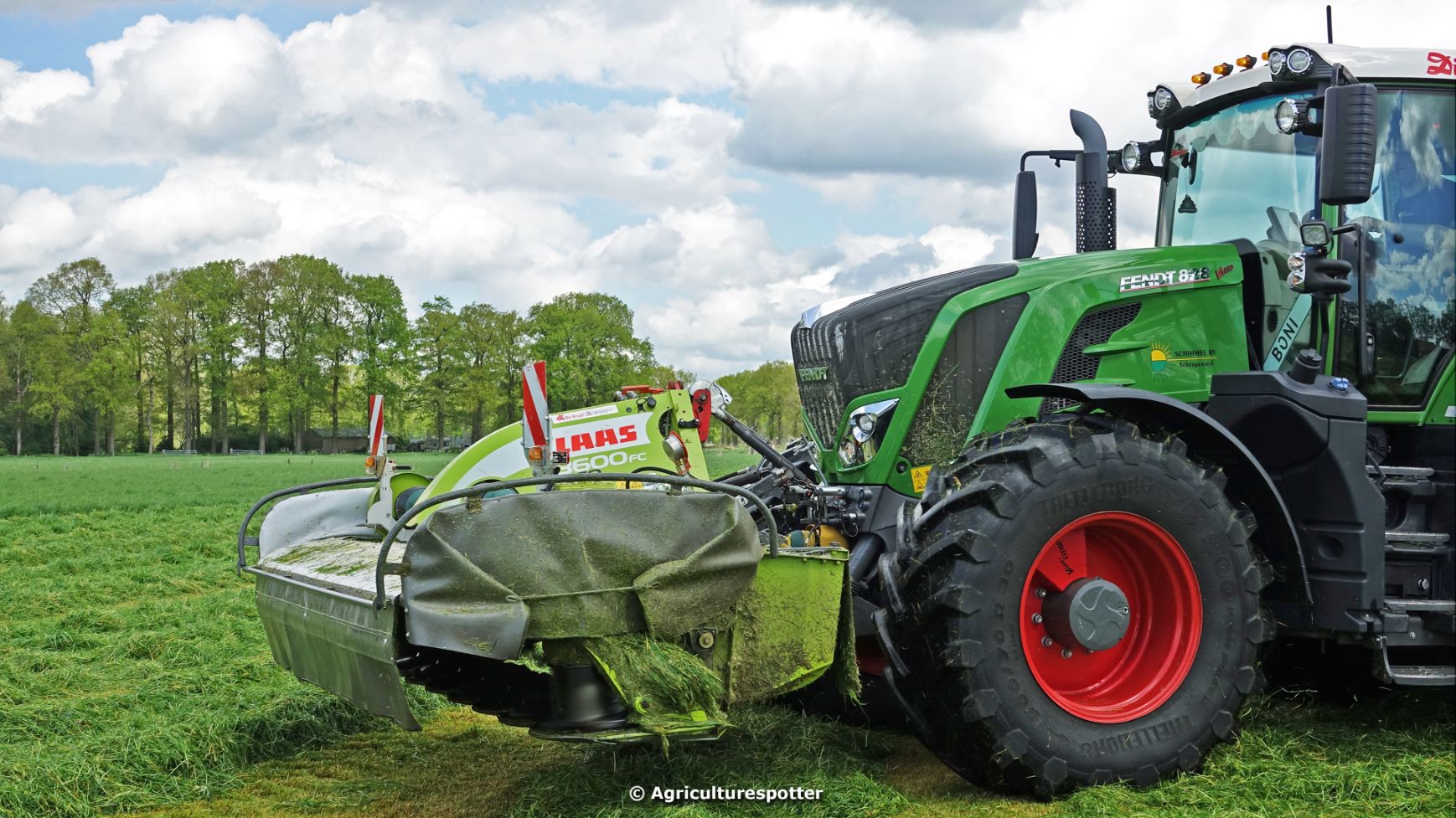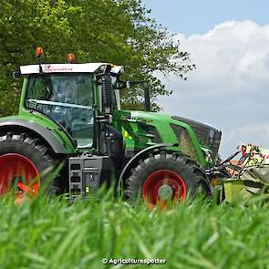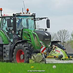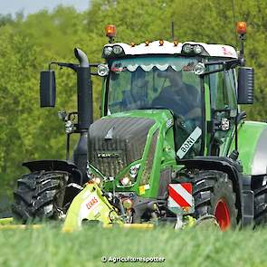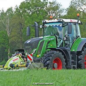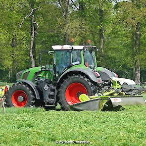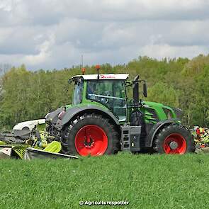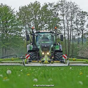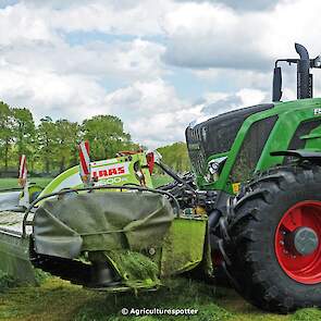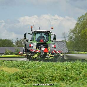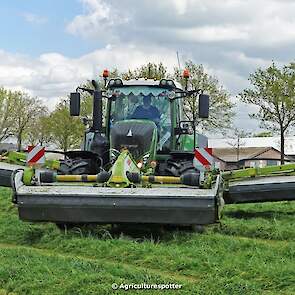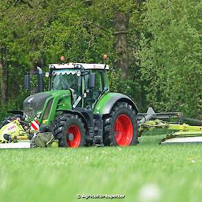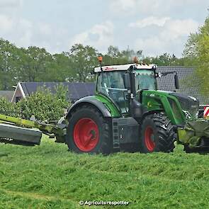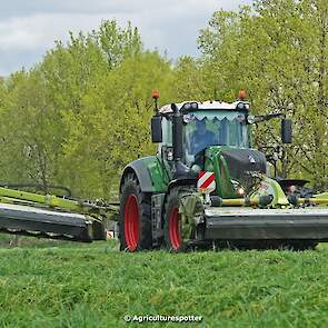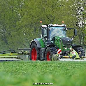 Loon- en grondverzetbedrijf Schimmel B.V. uit Scherpenzeel (GD) de eerste snede gras aan het maaien in Overberg (UT) met een Fendt 828 Vario en Claas-triplemaaiers. De boer hielp zelf ook mee met een Deutz-Fahr DX 4.31.