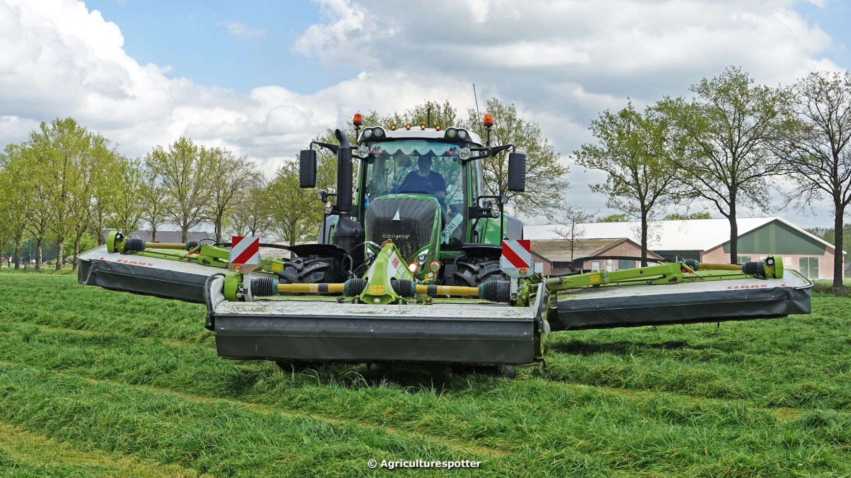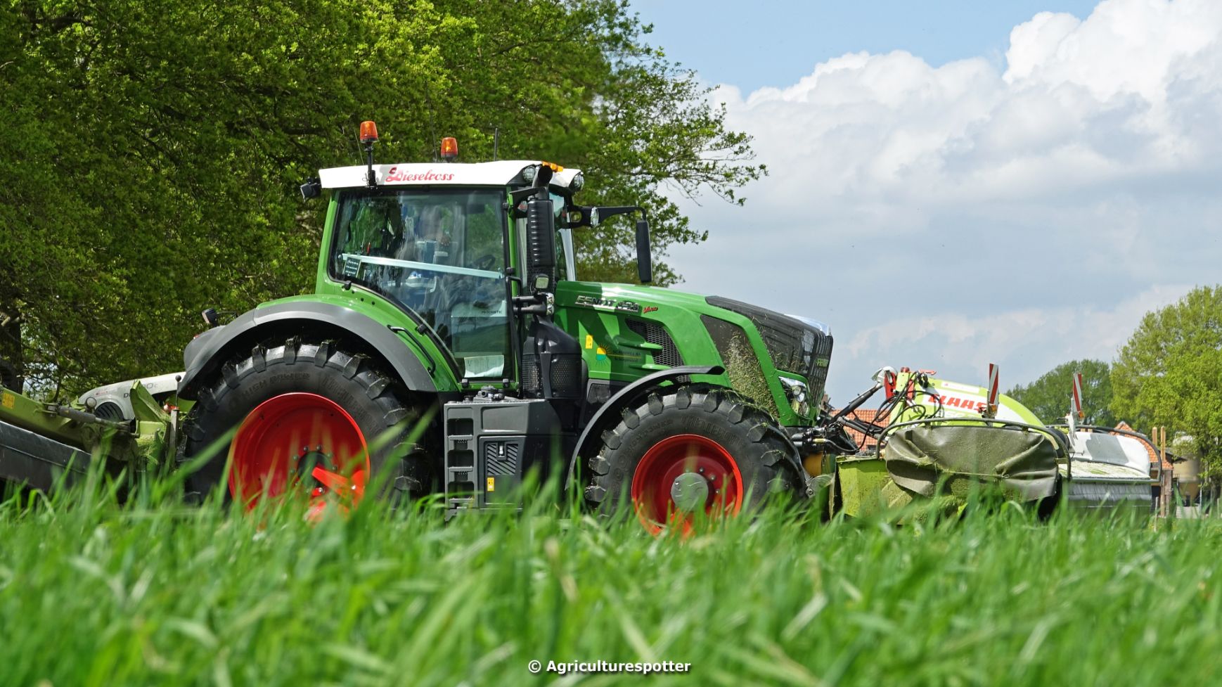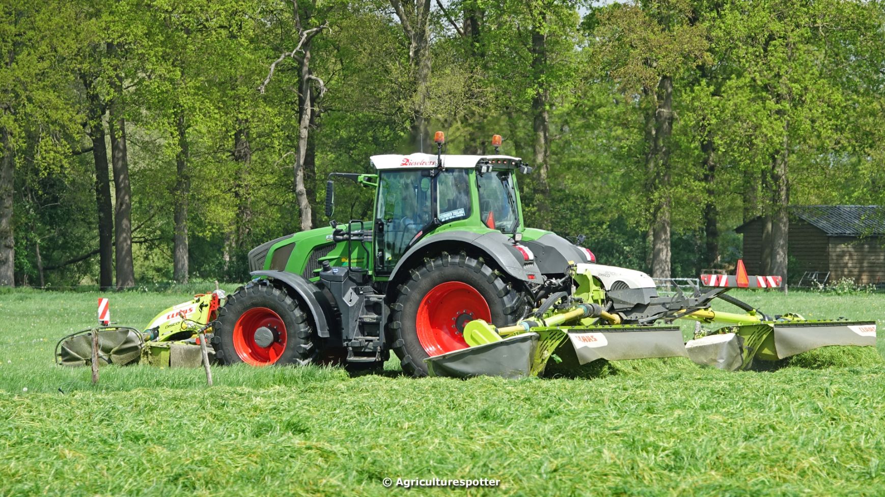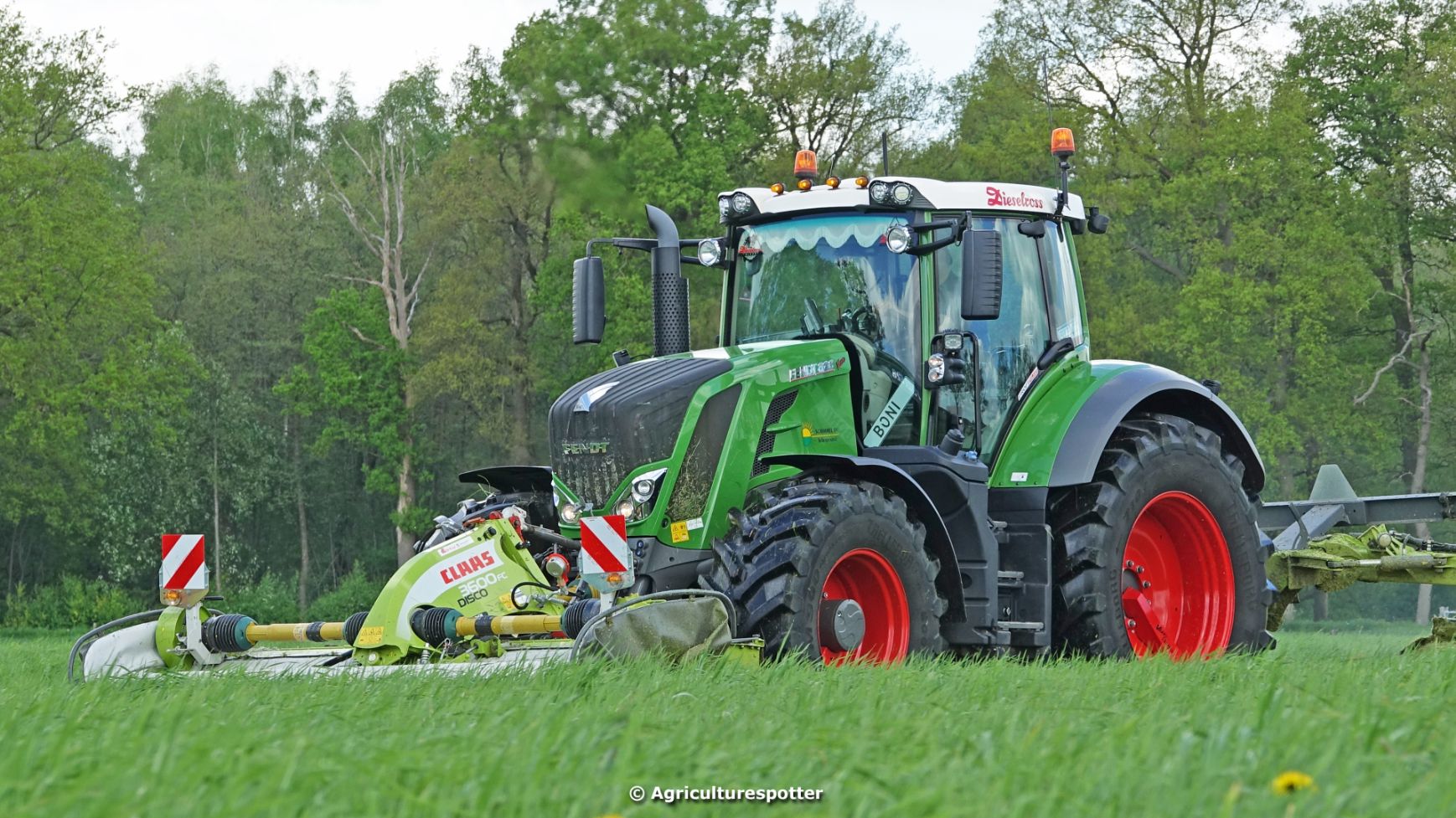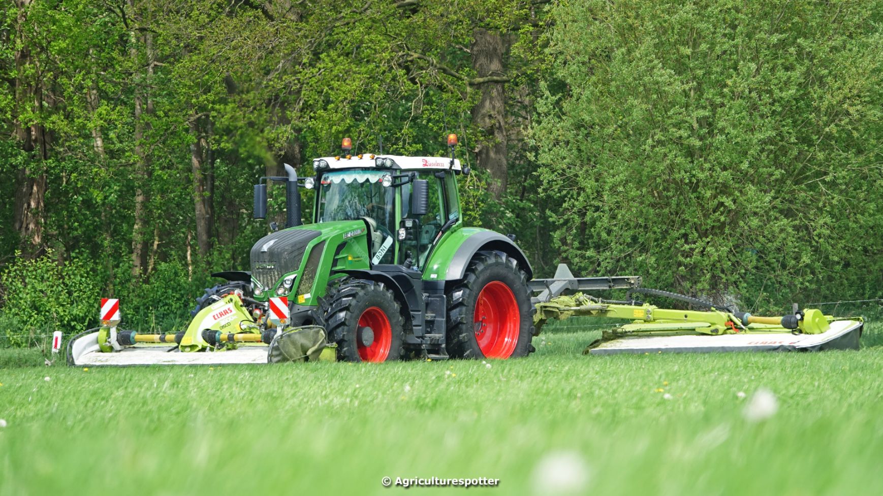 Loon- en grondverzetbedrijf Schimmel B.V. uit Scherpenzeel (GD) de eerste snede gras aan het maaien in Overberg (UT) met een Fendt 828 Vario en Claas-triplemaaiers. De boer hielp zelf ook mee met een Deutz-Fahr DX 4.31.