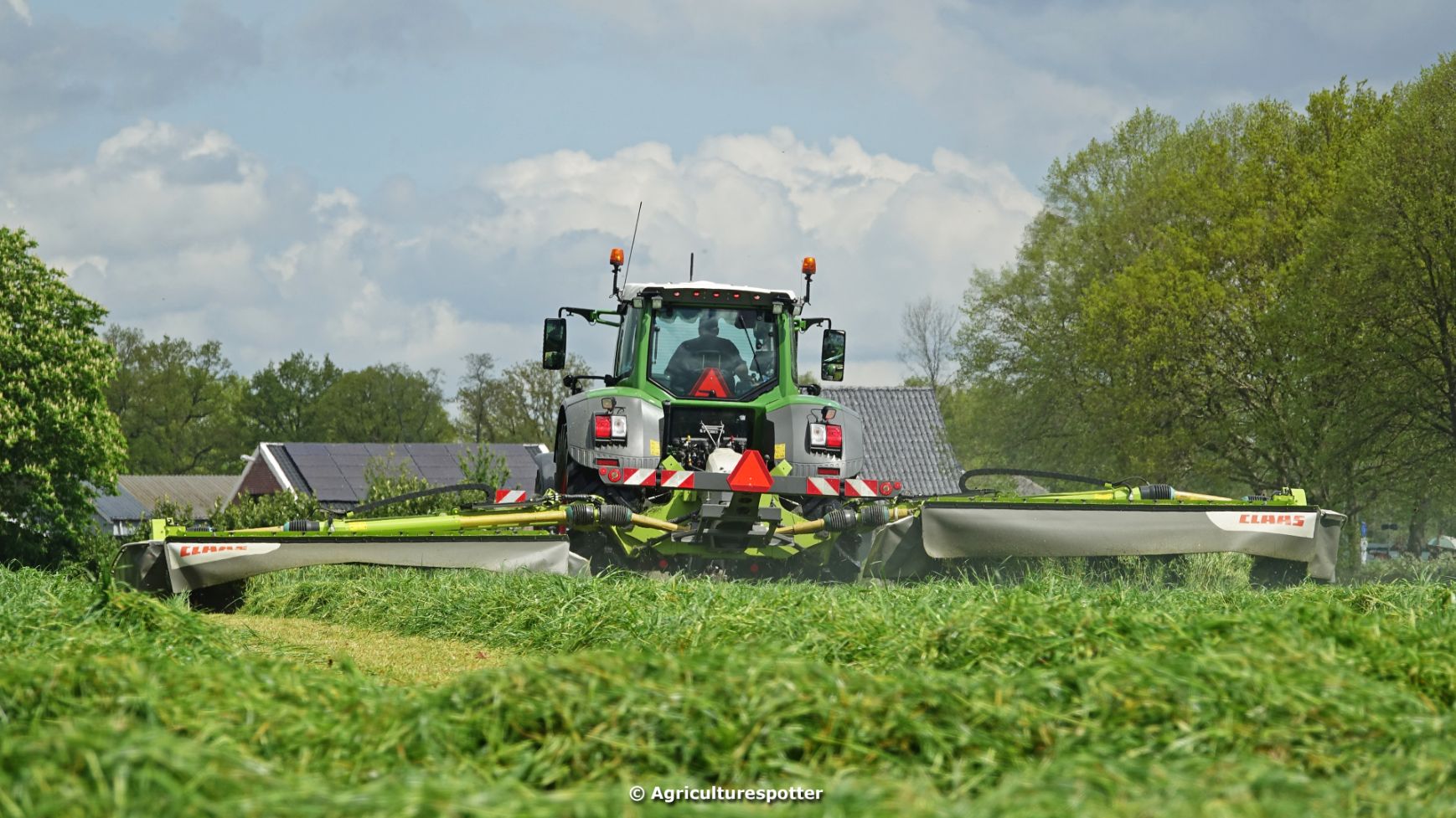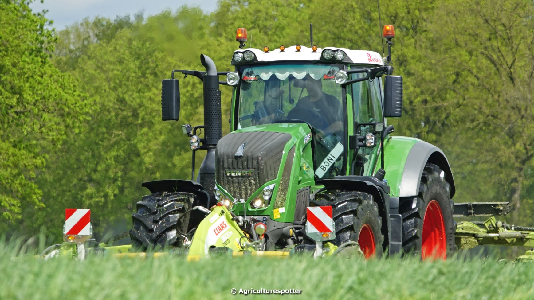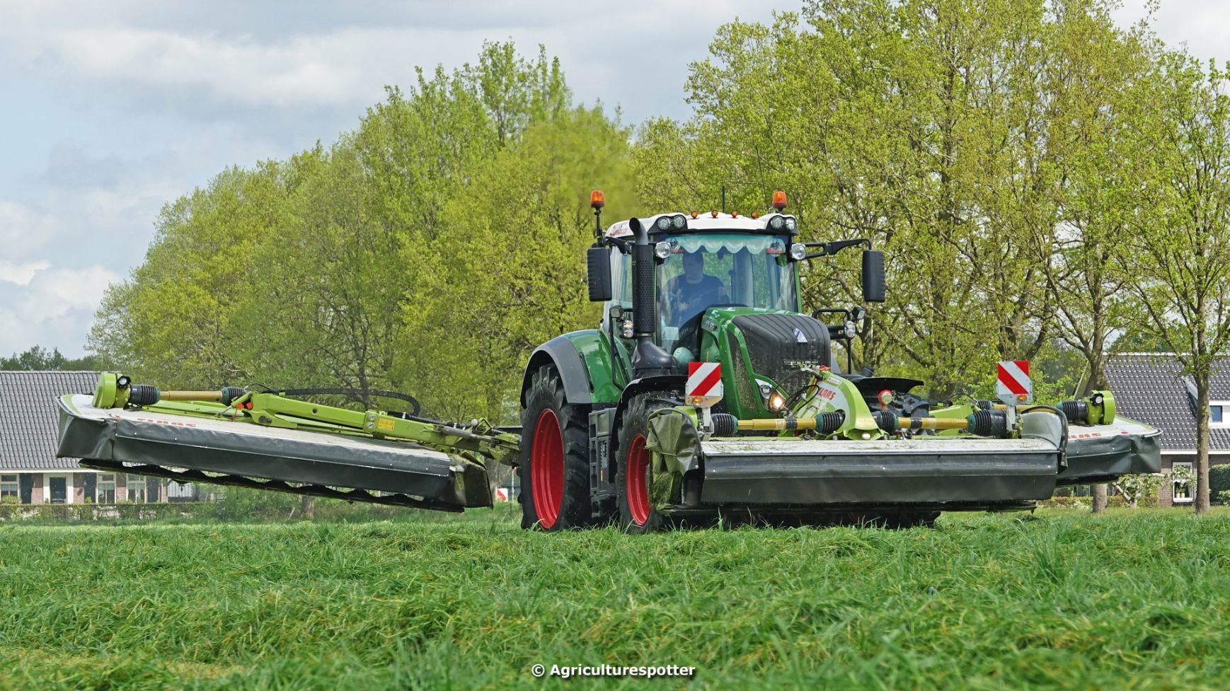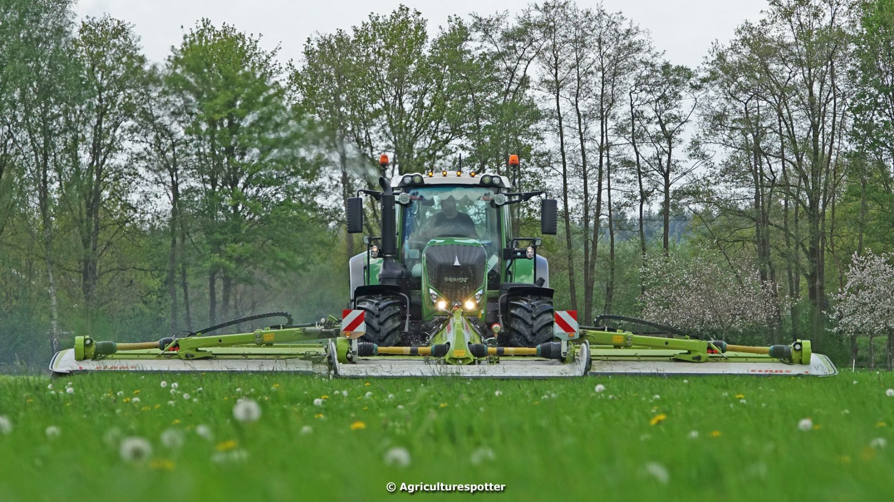 Loon- en grondverzetbedrijf Schimmel B.V. uit Scherpenzeel (GD) de eerste snede gras aan het maaien in Overberg (UT) met een Fendt 828 Vario en Claas-triplemaaiers. De boer hielp zelf ook mee met een Deutz-Fahr DX 4.31.