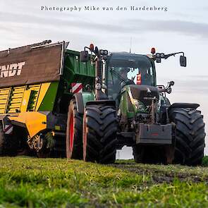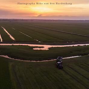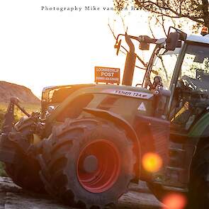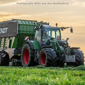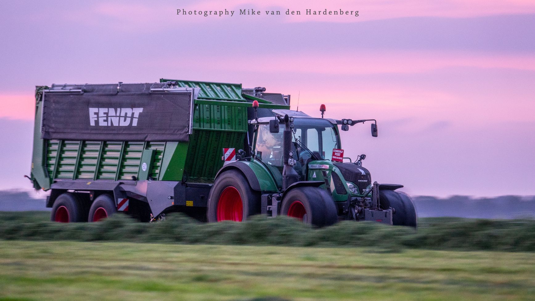Op een avond met een prachtige zonsondergang was loonbedrijf Post uit Eemnes (UT) aan het gras oprapen met een Fendt 724 Vario en hun nieuwe Fendt Tigo 65 XR-D. Deze Fendt Tigo was een aantal maanden geleden geleverd door de Mechan Groep en mocht nu aan de slag met de eerste snede gras. De kuil werd aangereden door een Fendt 720 Vario.