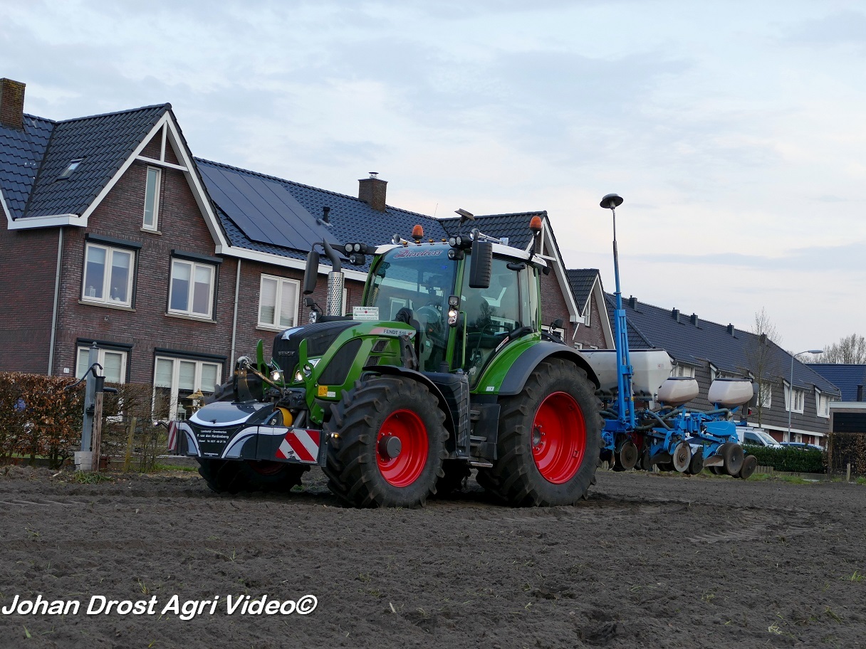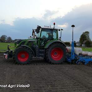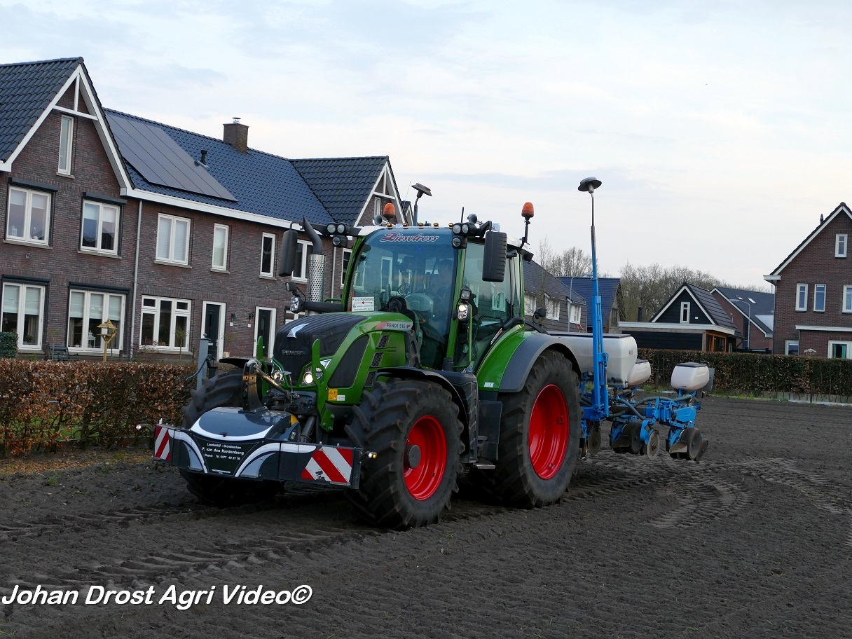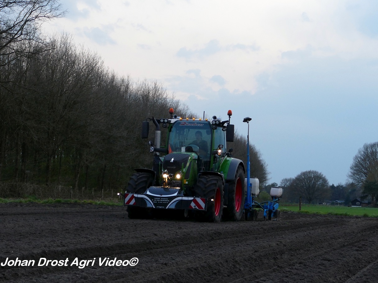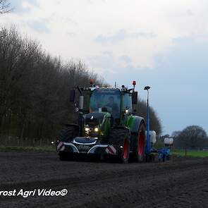 Loonbedrijf P. van den Hardenberg uit Elspeet (GD) in de avonduren aan het mais zaaien met een Fendt 516 Vario en 6-rijge Monosem-zaaier.