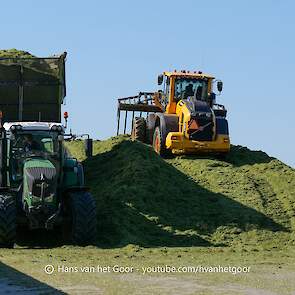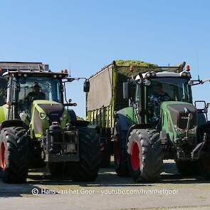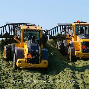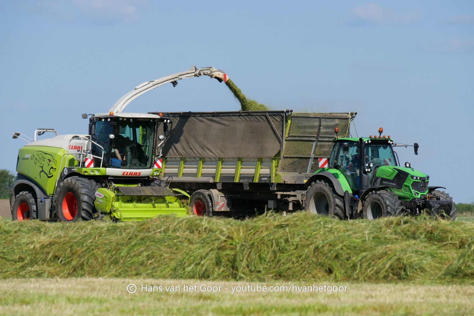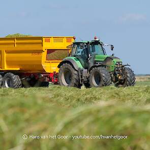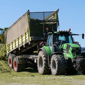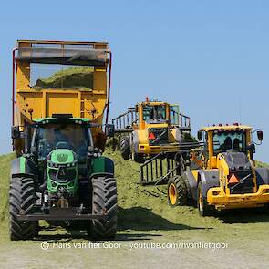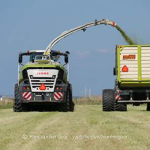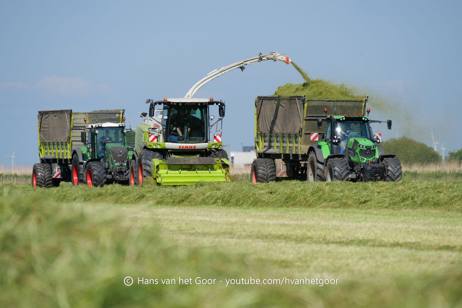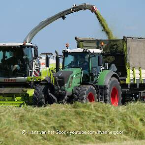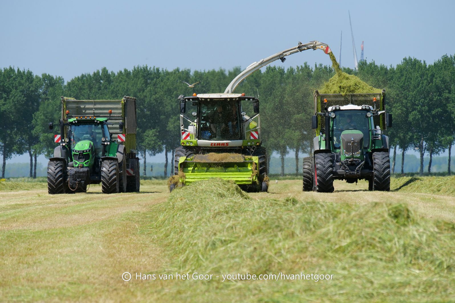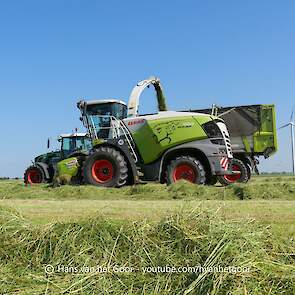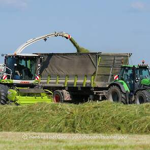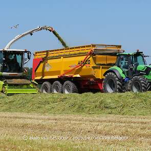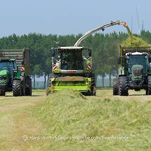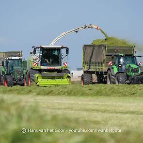 De eerste snede gras hakselen door loonbedrijf Hut bij melkveebedrijf Van Overbeek in Zeewolde. We zien een Claas Jaguar 960-veldhakselaar, Deutz-, Fendt-en Claas-trekkers. Het kuilwerk wordt gedaan met twee Volvo-shovels.