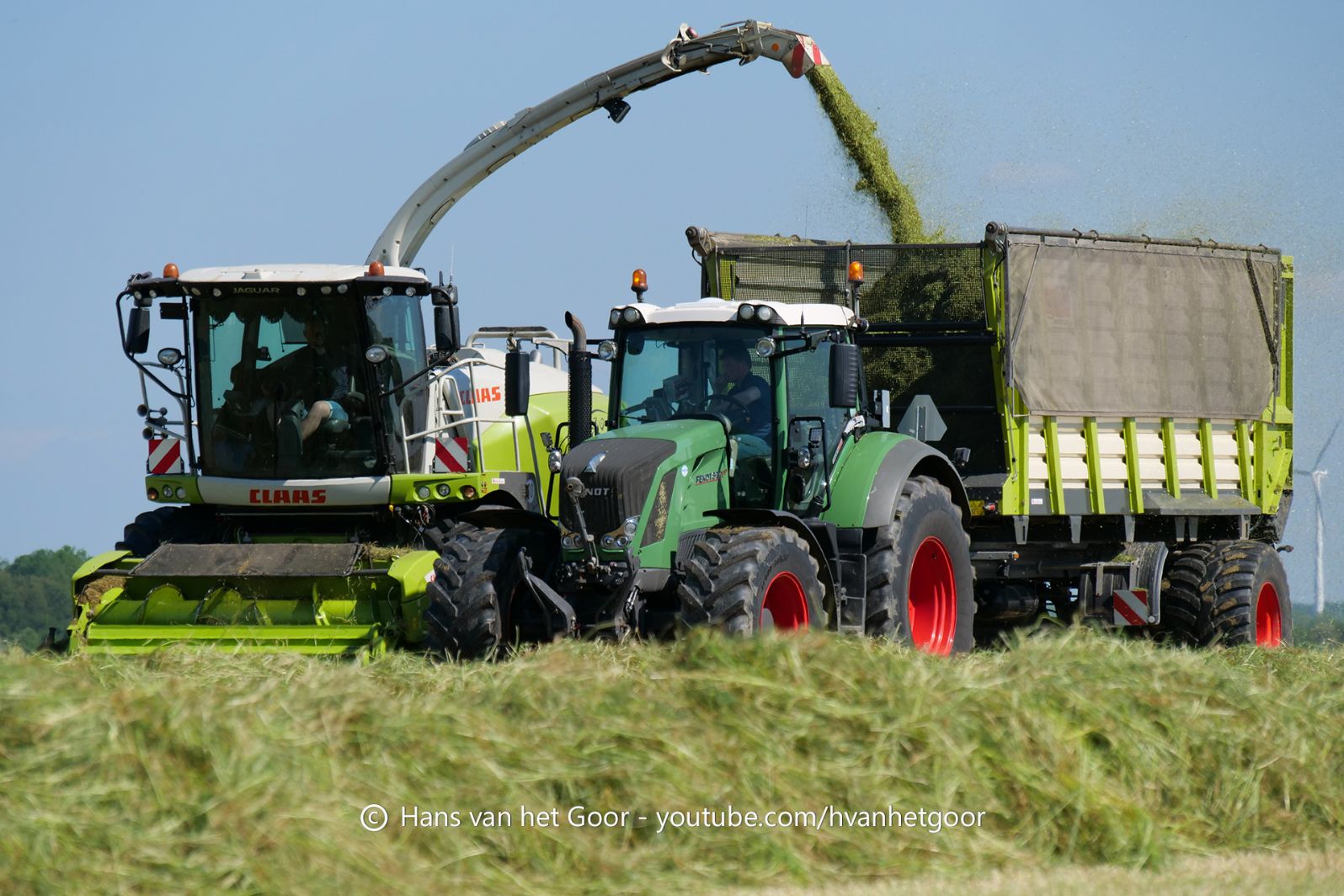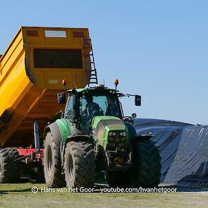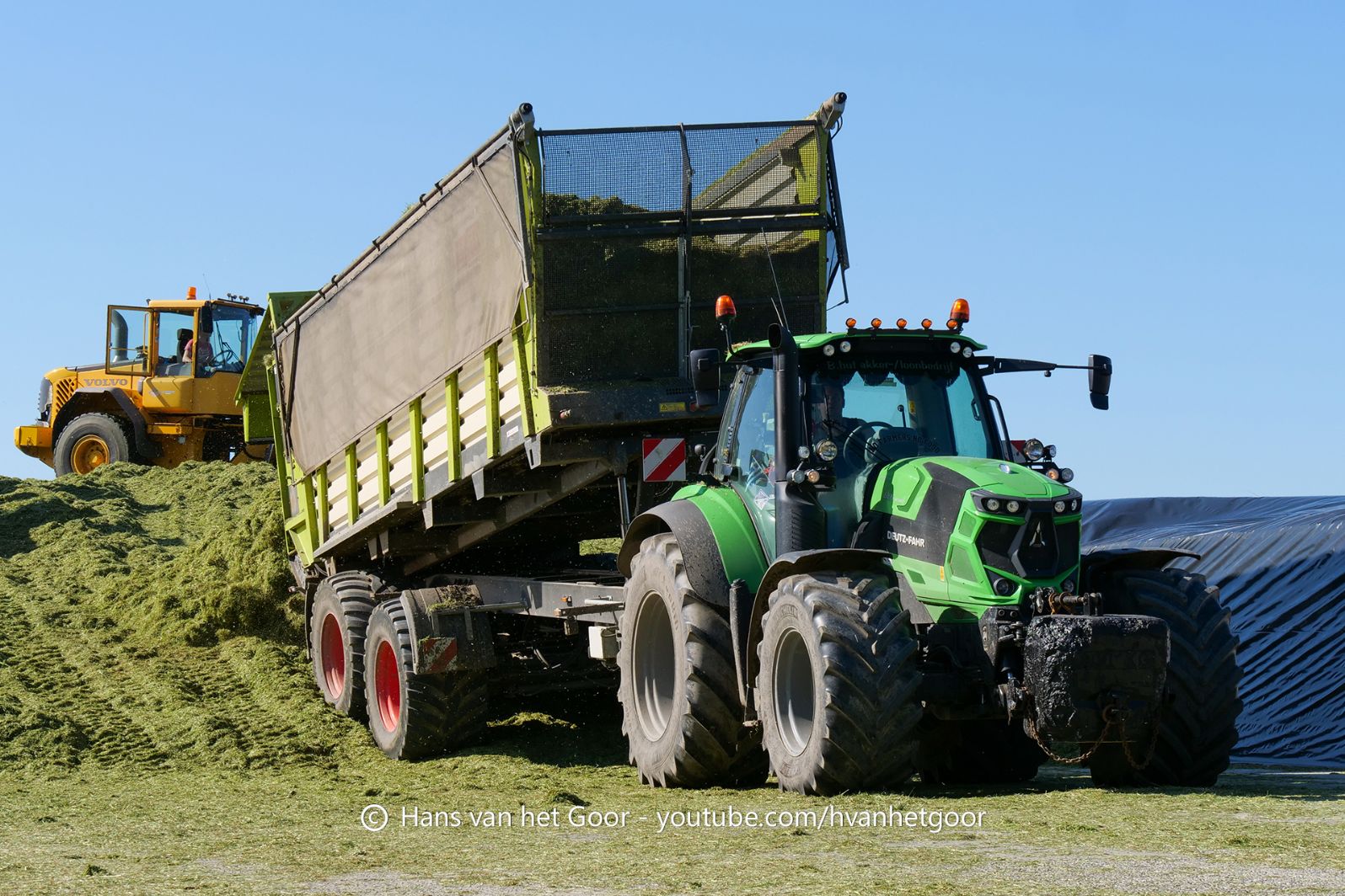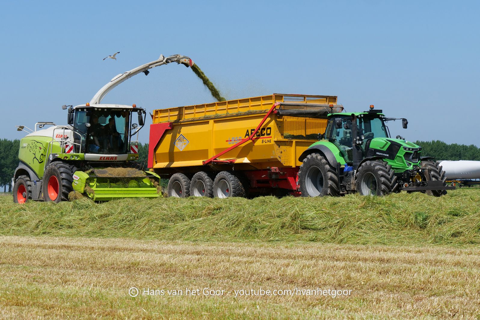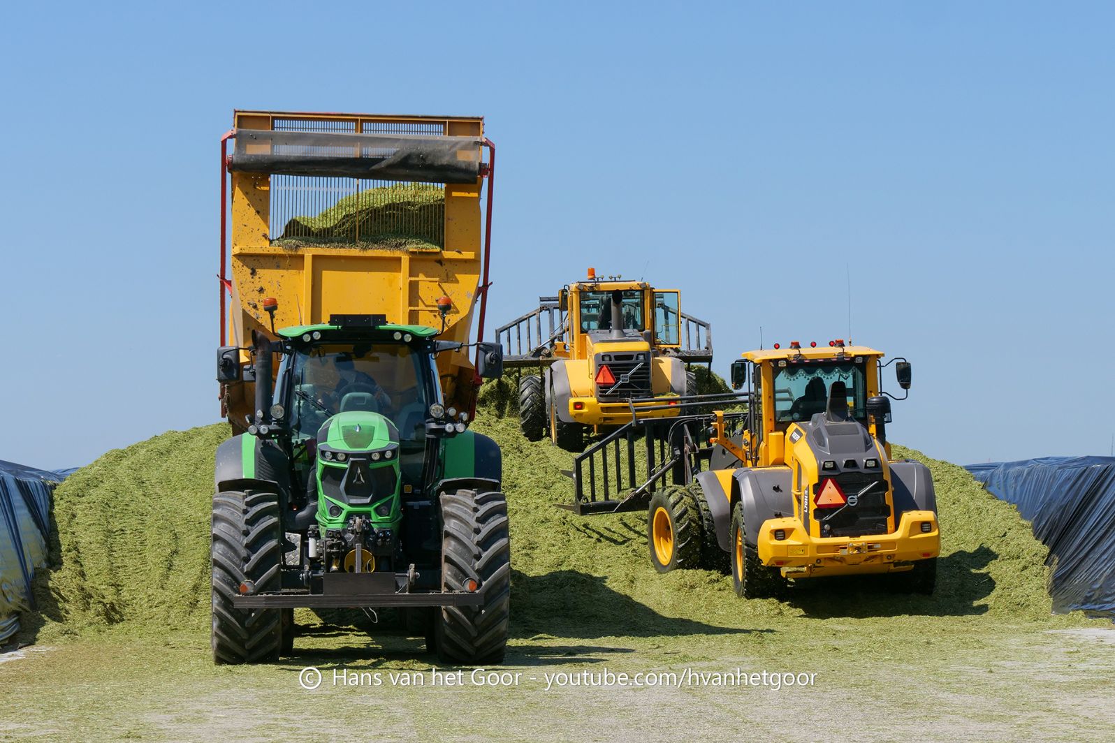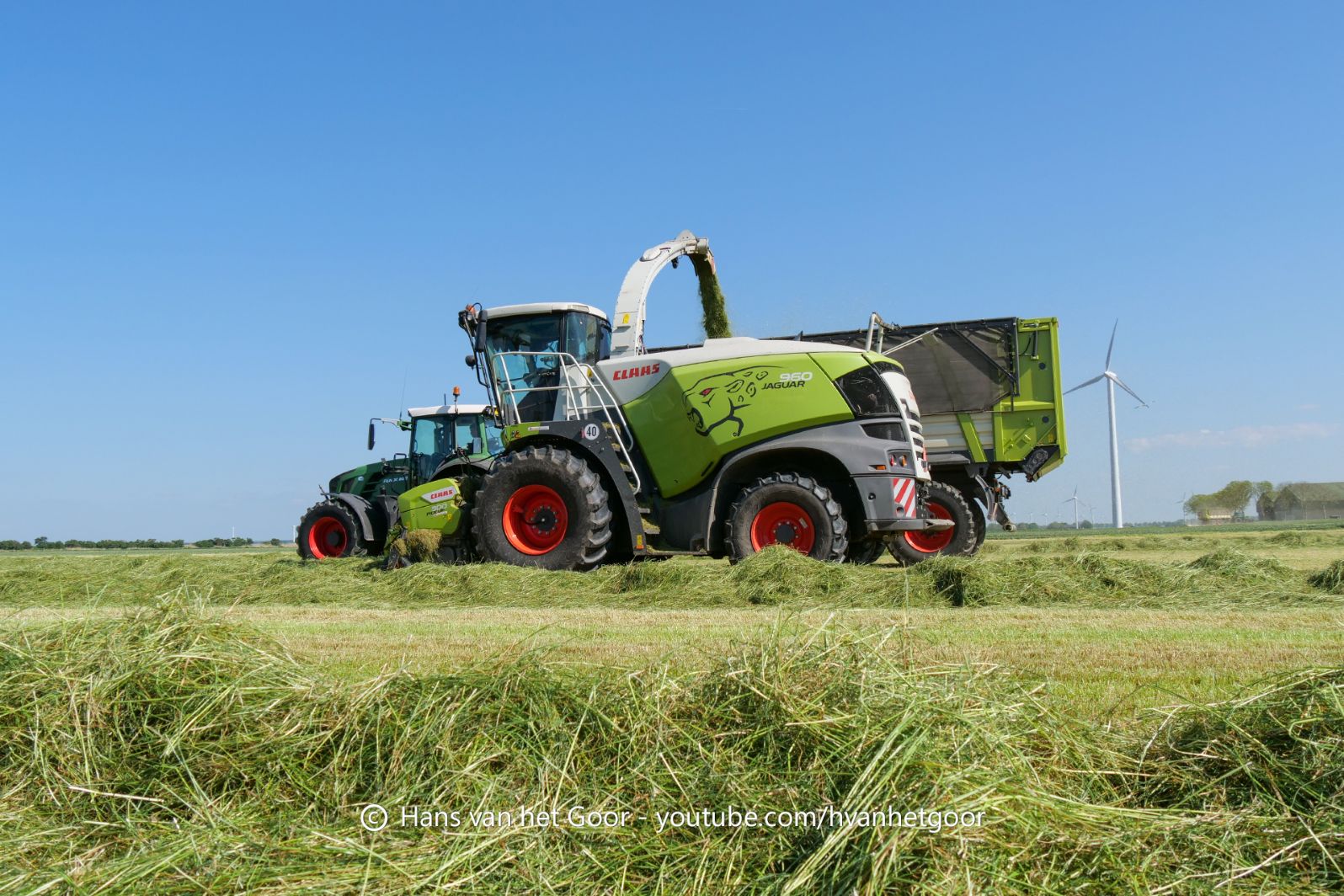 De eerste snede gras hakselen door loonbedrijf Hut bij melkveebedrijf Van Overbeek in Zeewolde. We zien een Claas Jaguar 960-veldhakselaar, Deutz-, Fendt-en Claas-trekkers. Het kuilwerk wordt gedaan met twee Volvo-shovels.