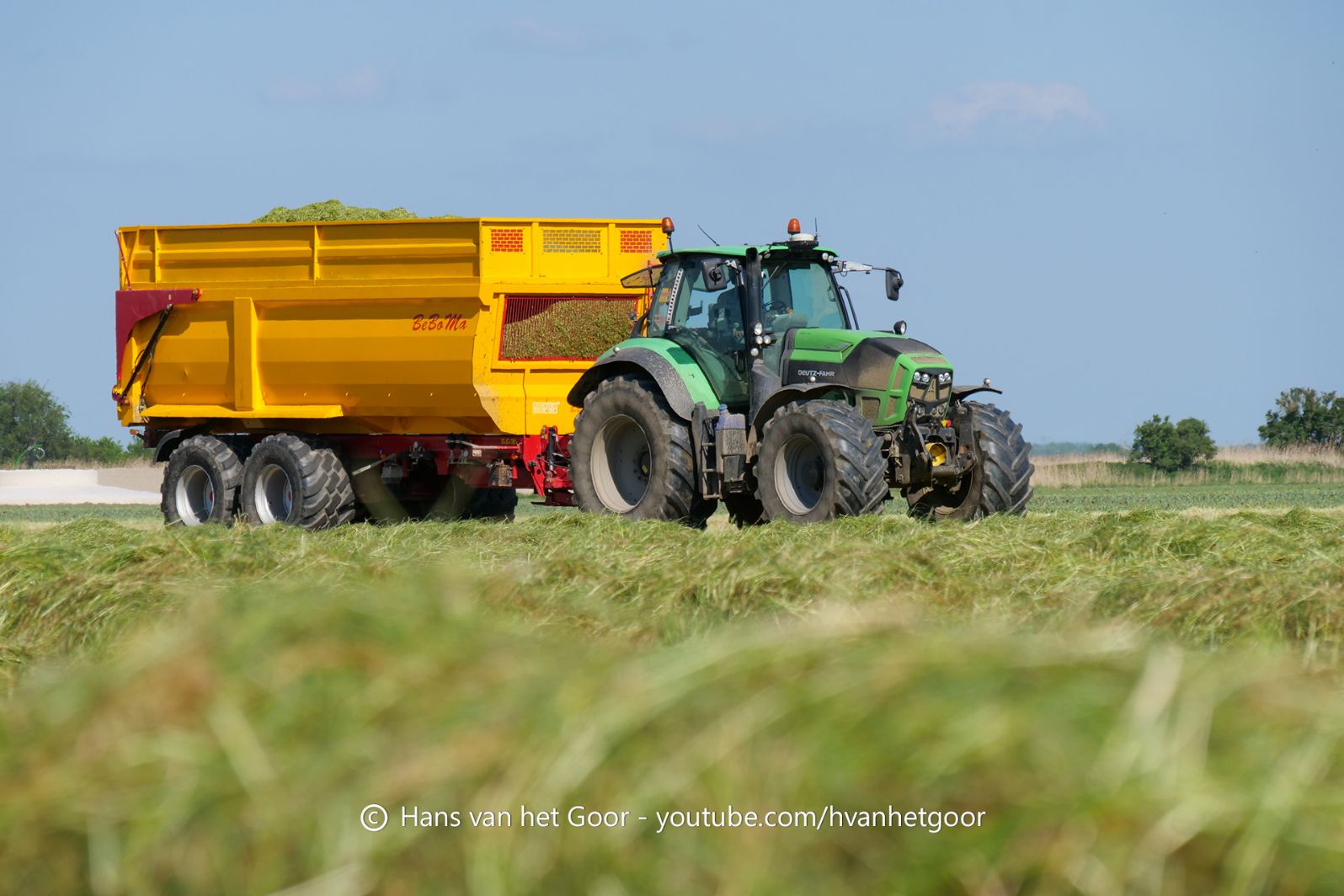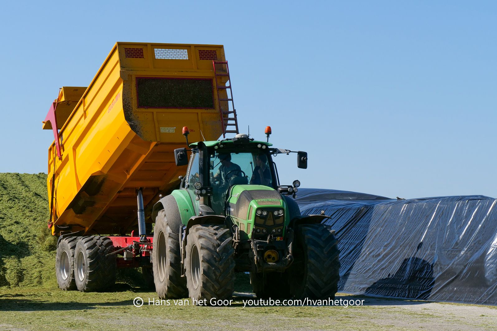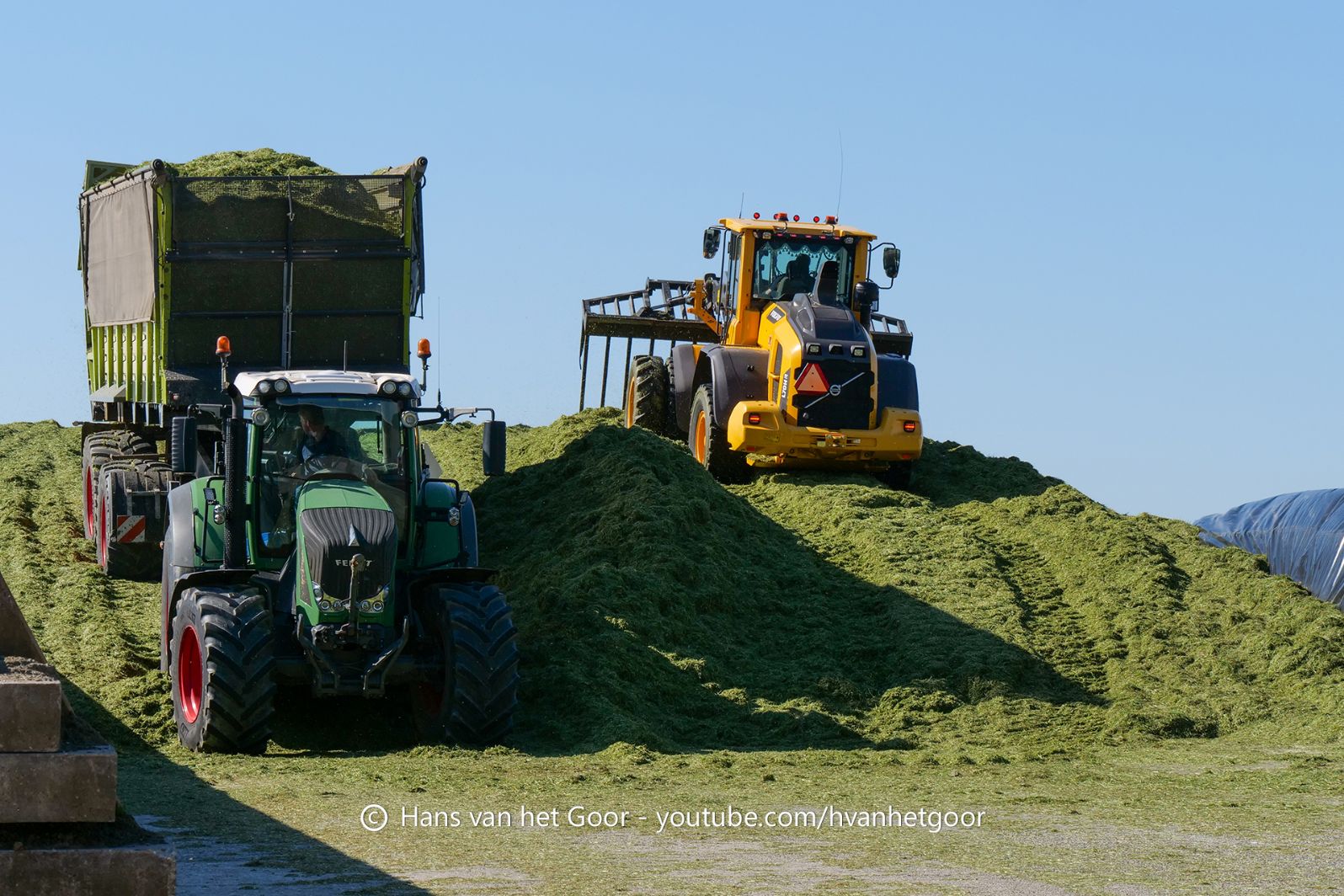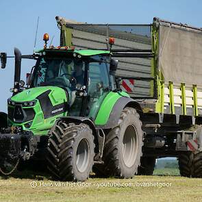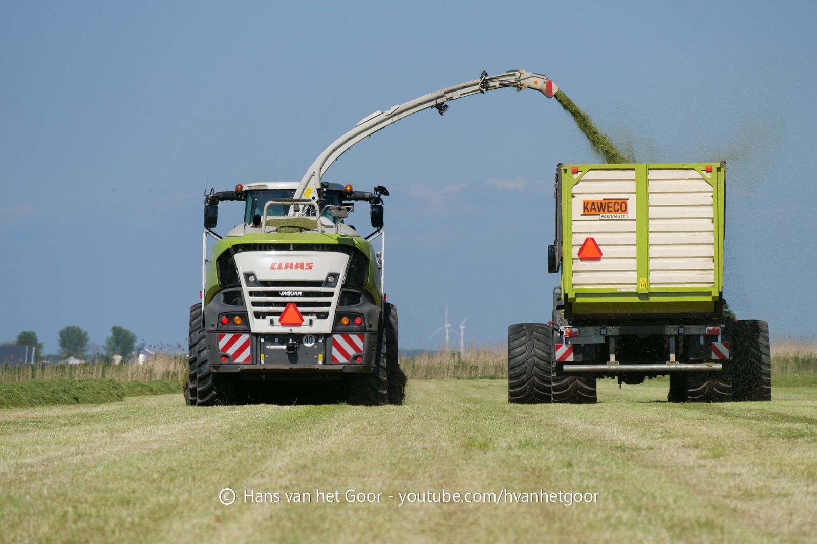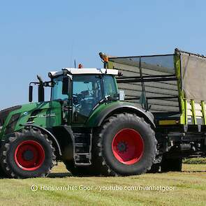 De eerste snede gras hakselen door loonbedrijf Hut bij melkveebedrijf Van Overbeek in Zeewolde. We zien een Claas Jaguar 960-veldhakselaar, Deutz-, Fendt-en Claas-trekkers. Het kuilwerk wordt gedaan met twee Volvo-shovels.