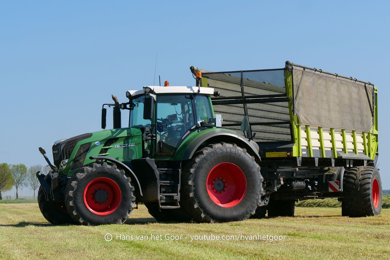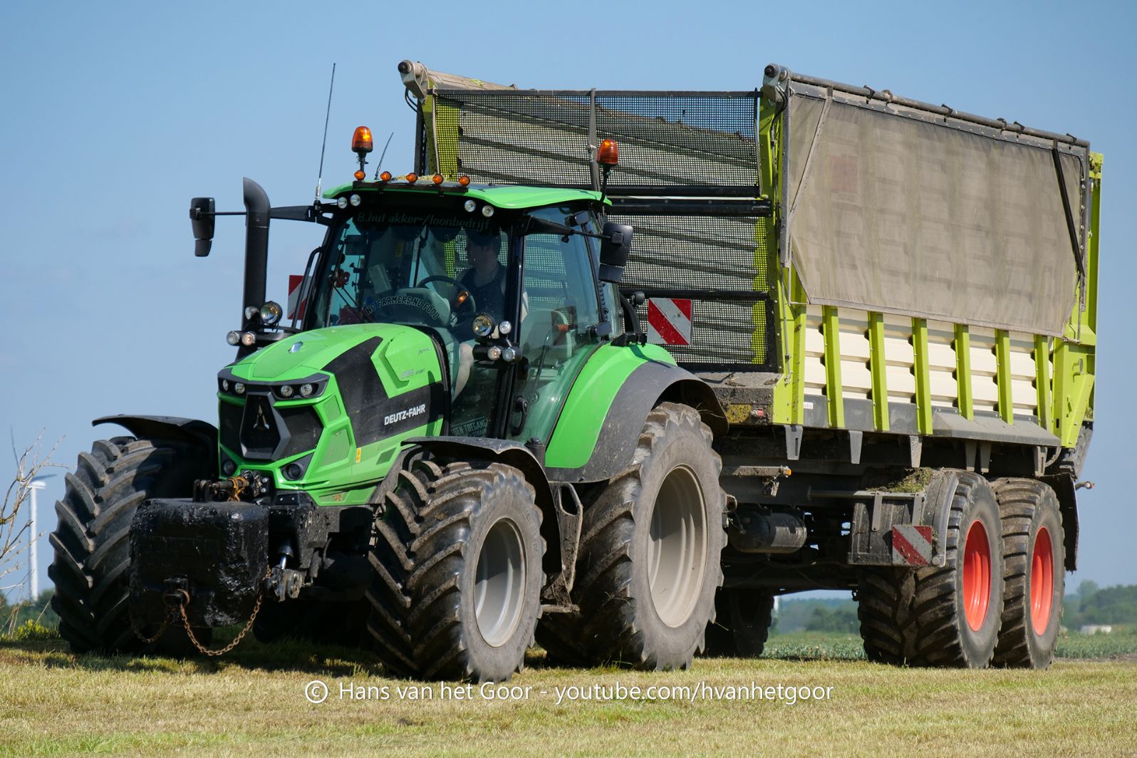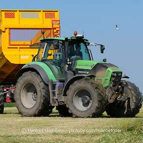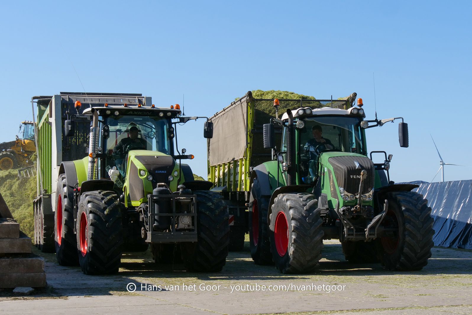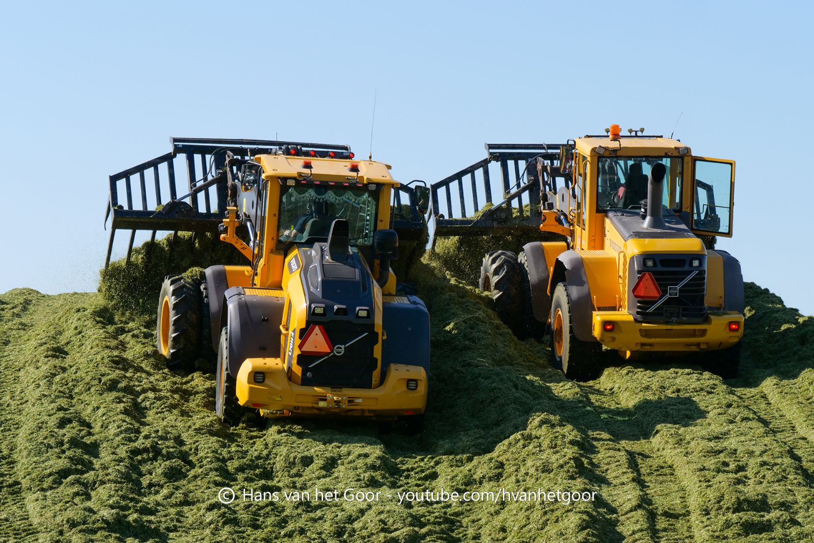 De eerste snede gras hakselen door loonbedrijf Hut bij melkveebedrijf Van Overbeek in Zeewolde. We zien een Claas Jaguar 960-veldhakselaar, Deutz-, Fendt-en Claas-trekkers. Het kuilwerk wordt gedaan met twee Volvo-shovels.