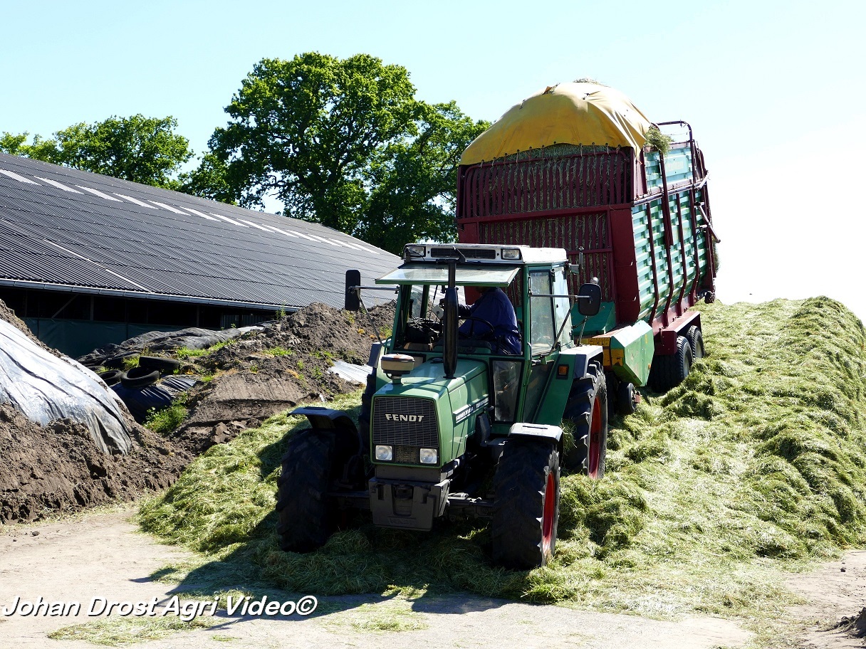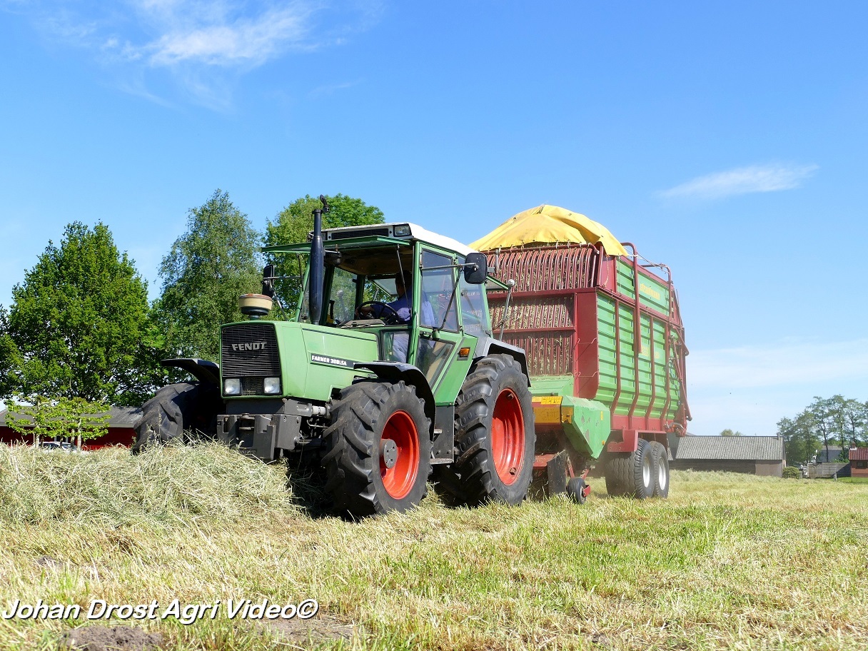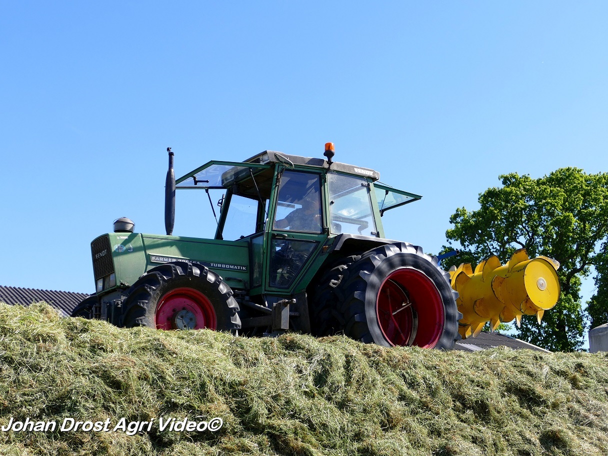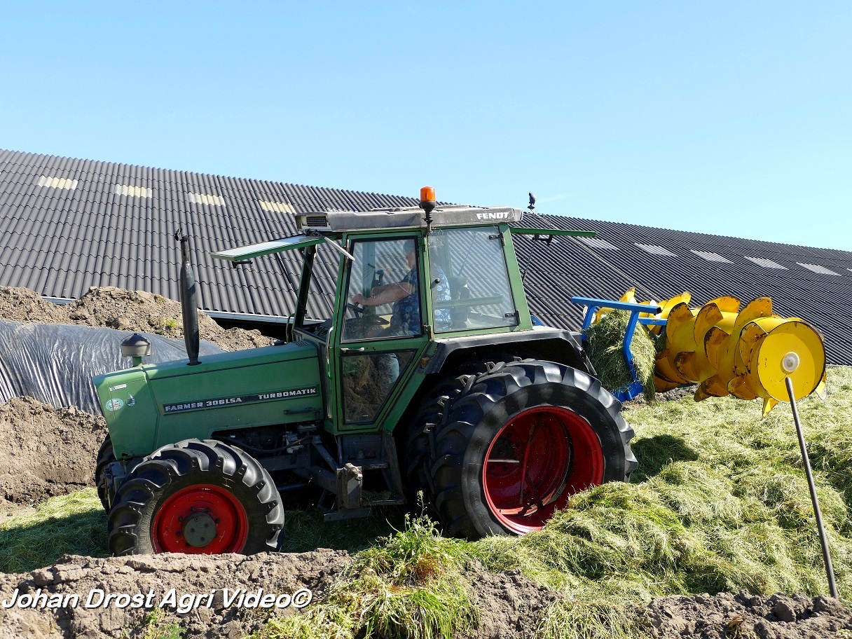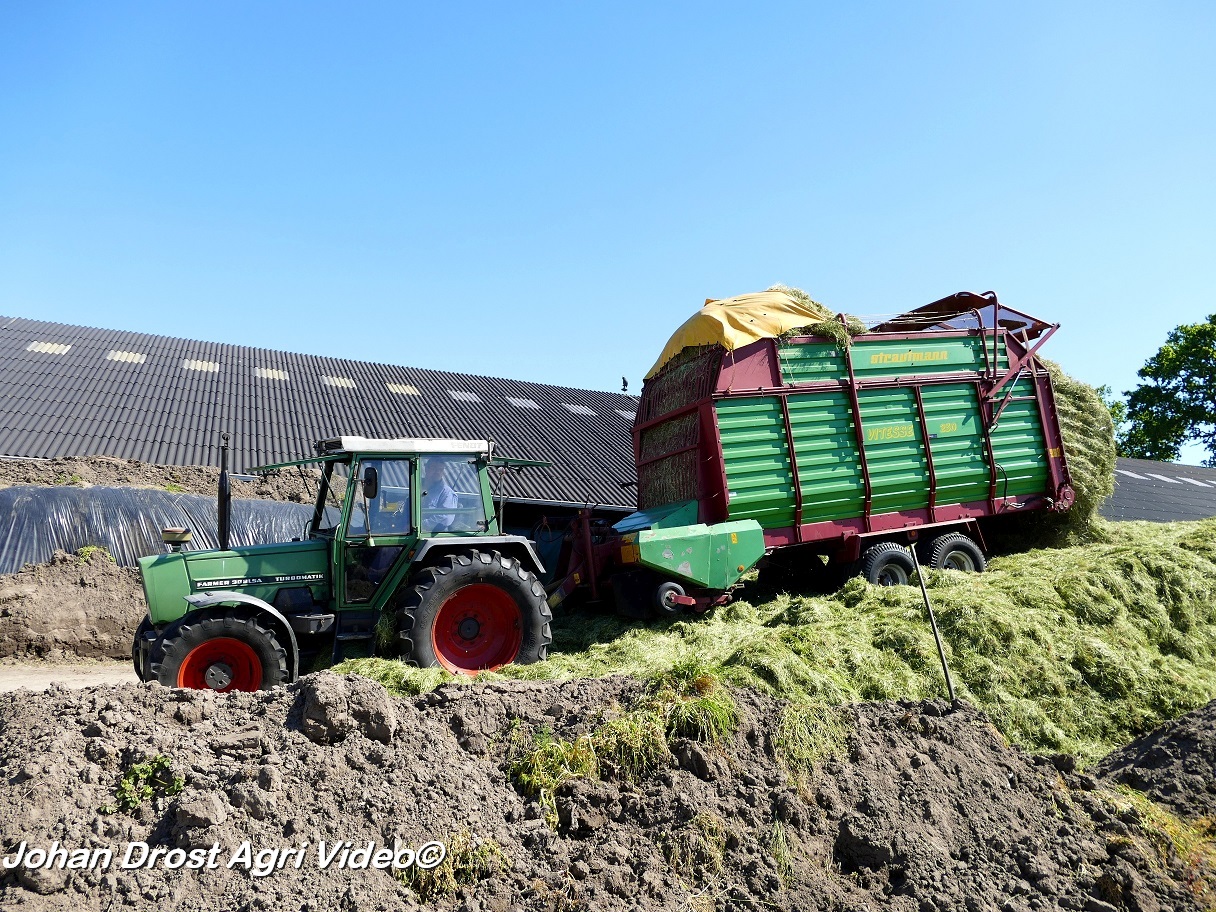 Melkveebedrijf Junte uit Doornspijk (GD) aan het gras inkuilen met een Fendt Farmer 308 LSA en Strautmann Vitesse 230. Op de kuil een Fendt Farmer 306 LSA.