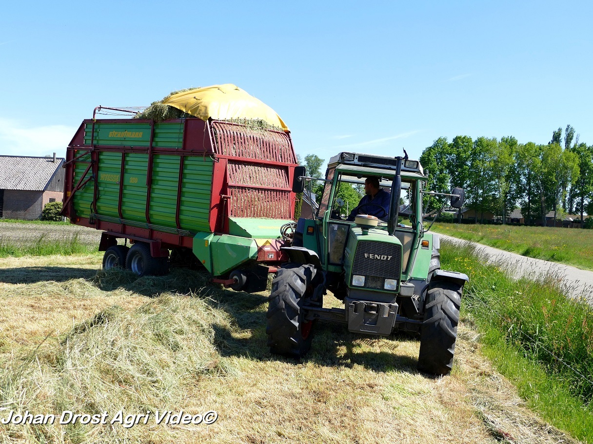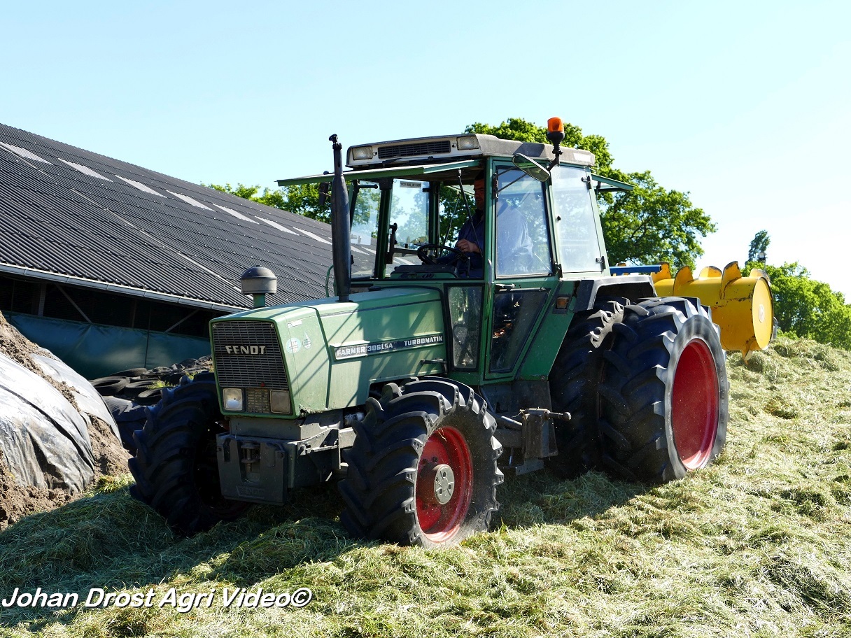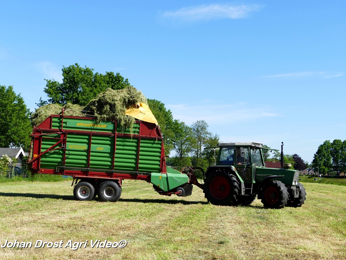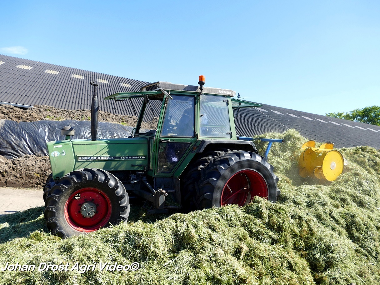 Melkveebedrijf Junte uit Doornspijk (GD) aan het gras inkuilen met een Fendt Farmer 308 LSA en Strautmann Vitesse 230. Op de kuil een Fendt Farmer 306 LSA.