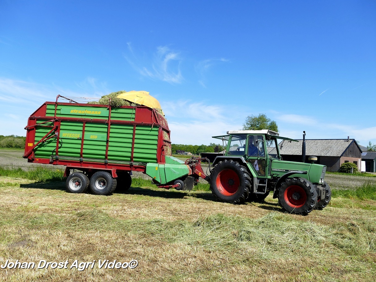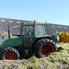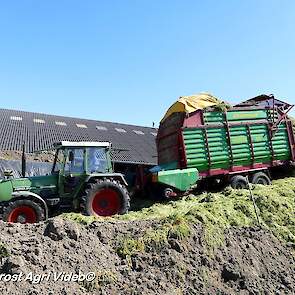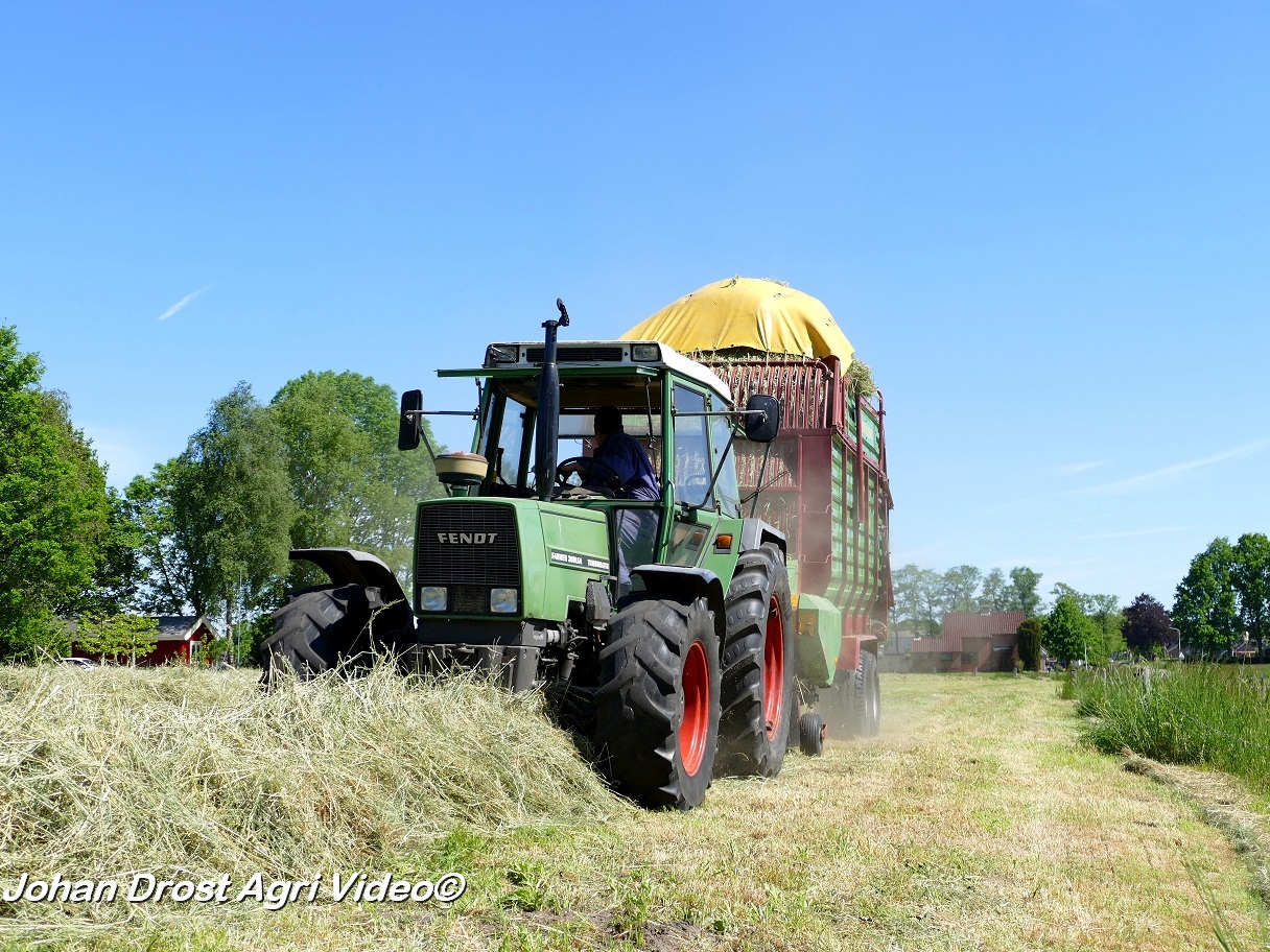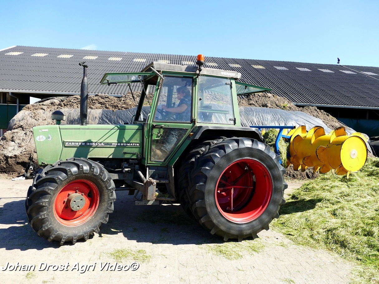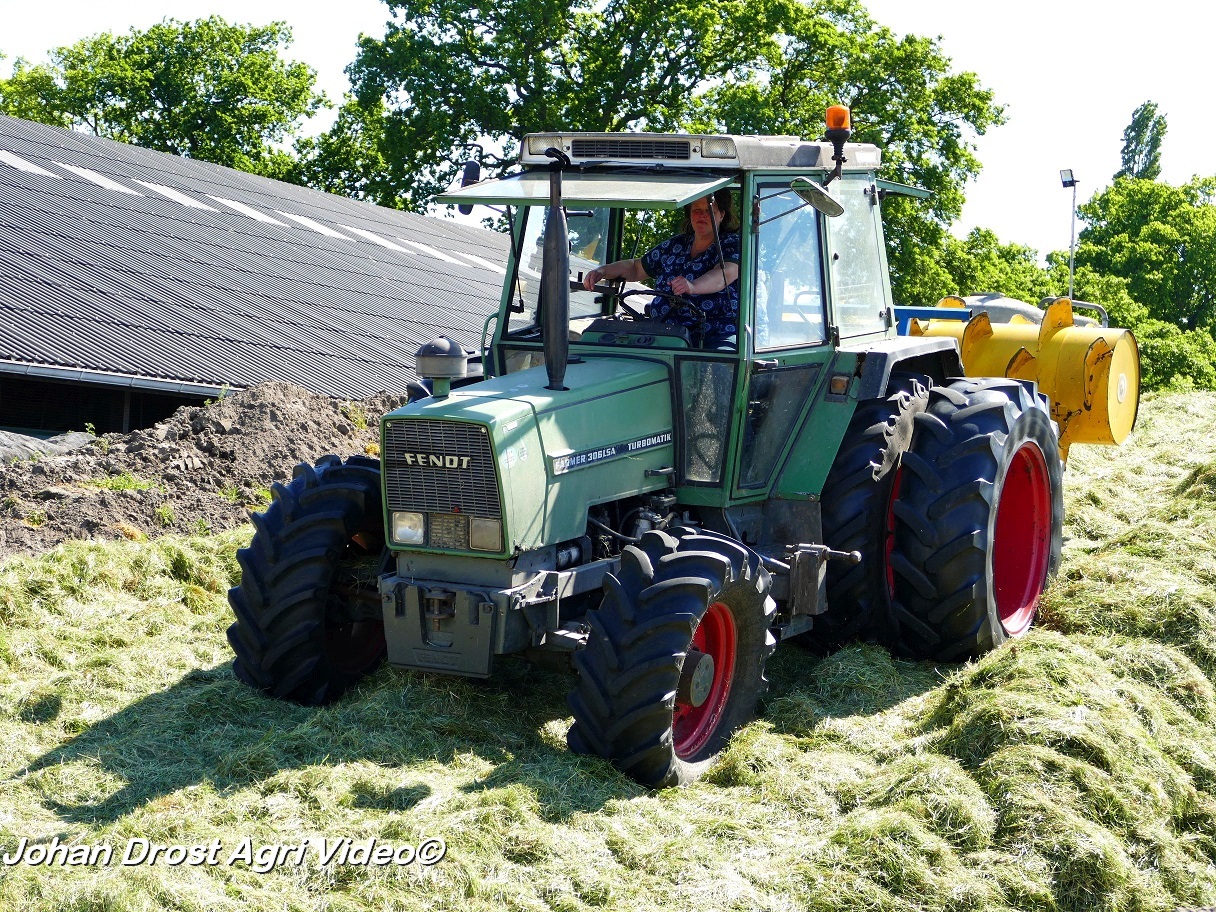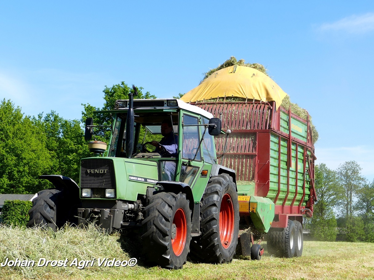 Melkveebedrijf Junte uit Doornspijk (GD) aan het gras inkuilen met een Fendt Farmer 308 LSA en Strautmann Vitesse 230. Op de kuil een Fendt Farmer 306 LSA.