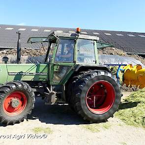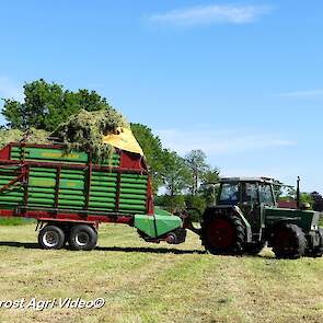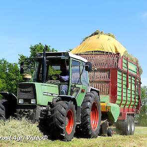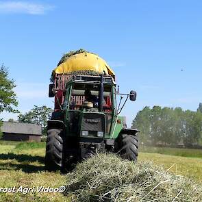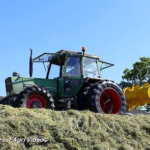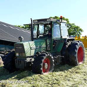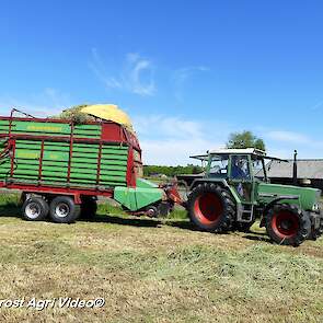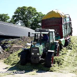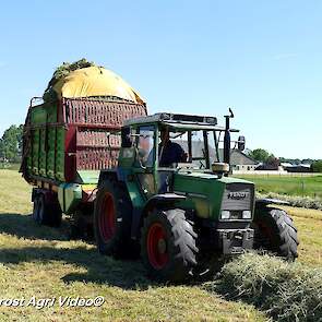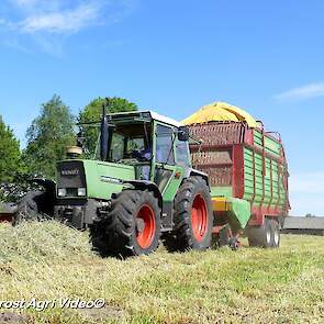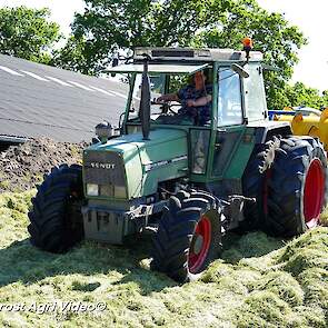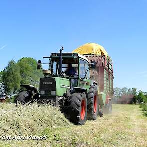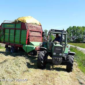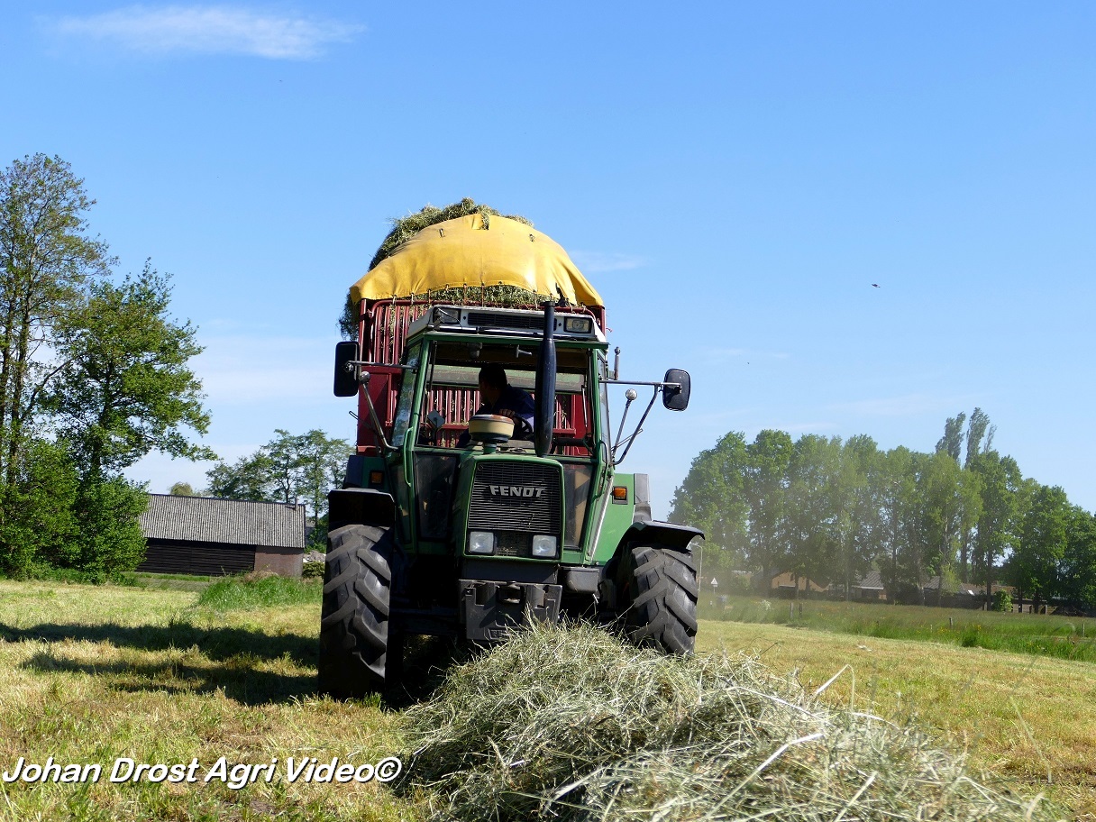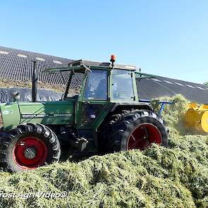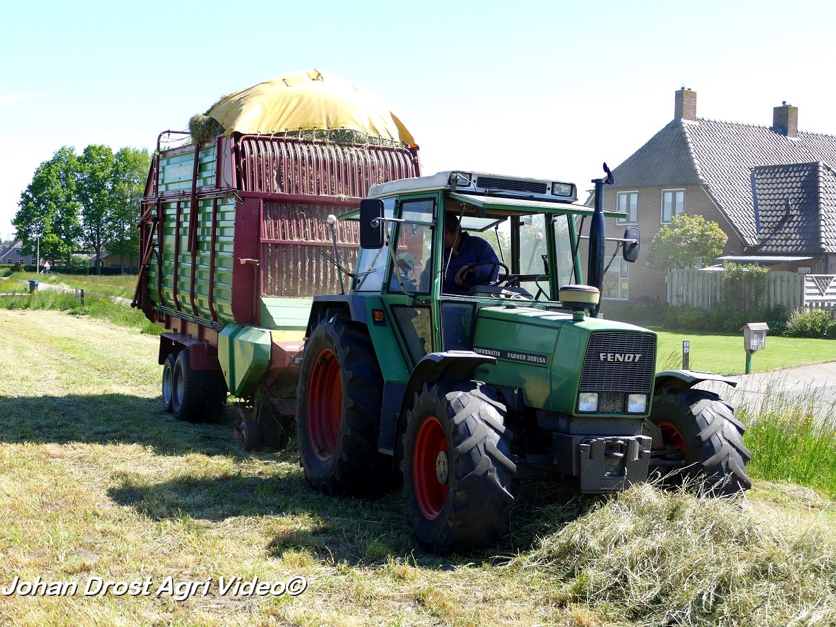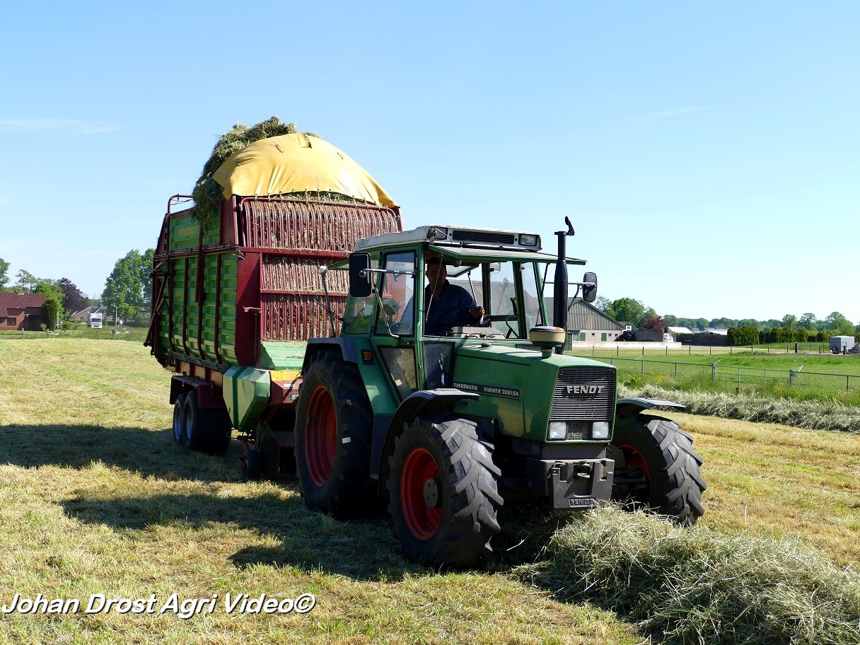 Melkveebedrijf Junte uit Doornspijk (GD) aan het gras inkuilen met een Fendt Farmer 308 LSA en Strautmann Vitesse 230. Op de kuil een Fendt Farmer 306 LSA.