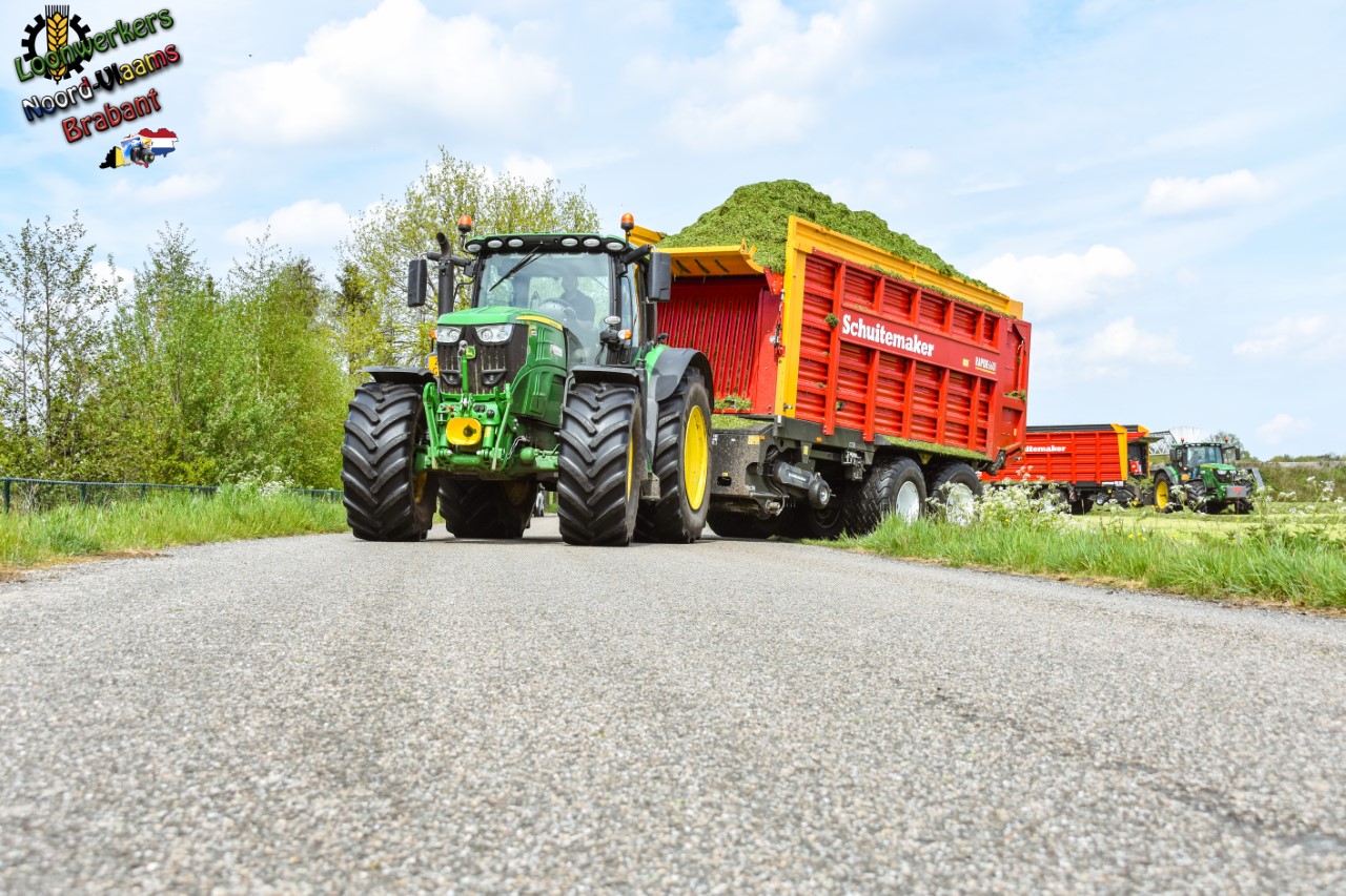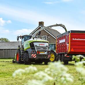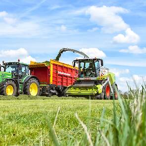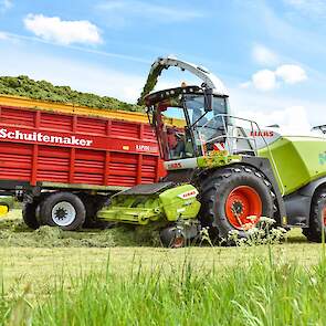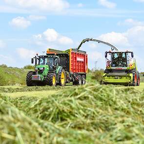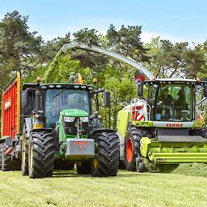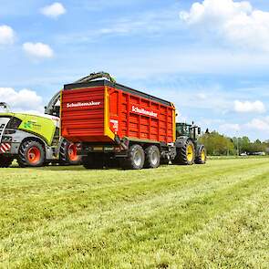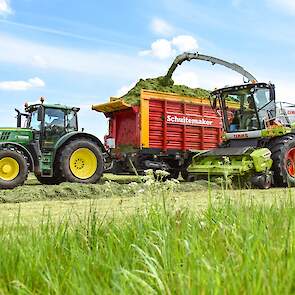 De Claas Jaguar 930-hakselaar maakt gebruik van een Claas 300 Pickup, die op zijn beurt wordt ondersteund door een John Deere 6215R met een Schuitemaker Rapide 6600-dubbeldoelwagen en een John Deere 6155R met een nieuw model Schuitemaker Rapide 6600.