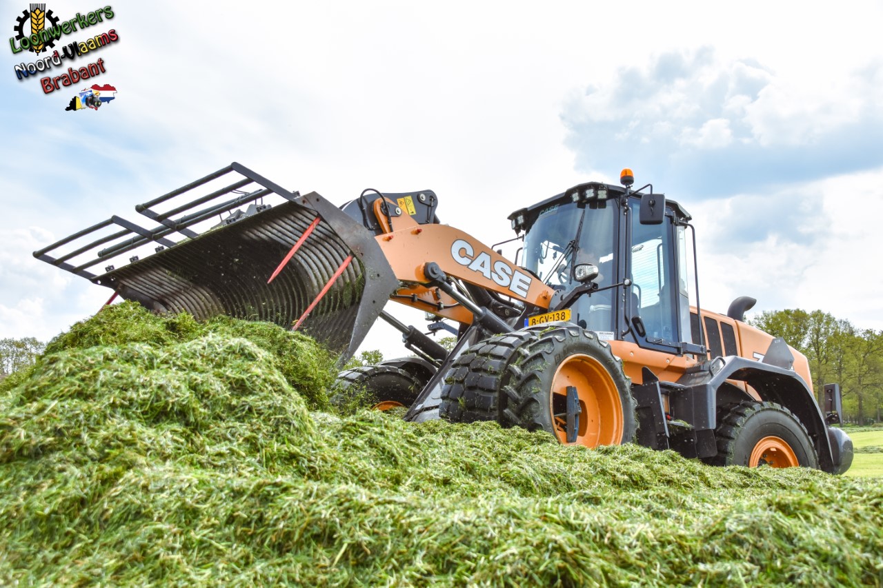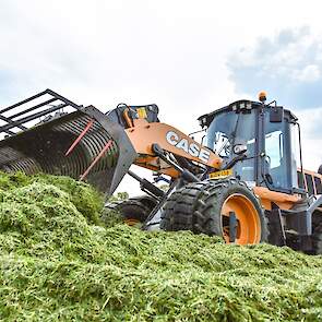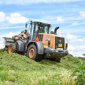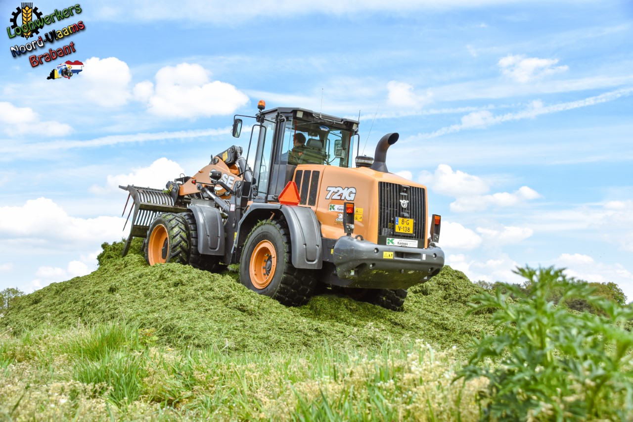 Op de graskuil is de Loader aan het werk om de kuil goed vast te rijden, met een hoge frequentie van de twee karren is dat een uitdagende klus. Echter lukt dit de Case IH 721G Loader prima.